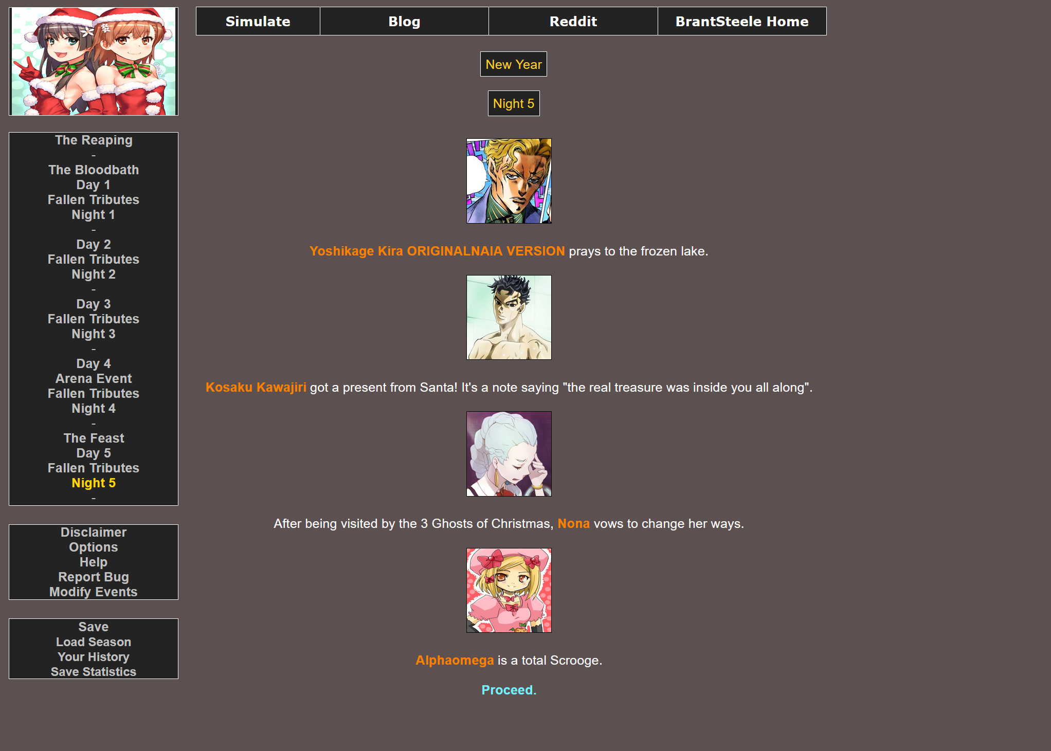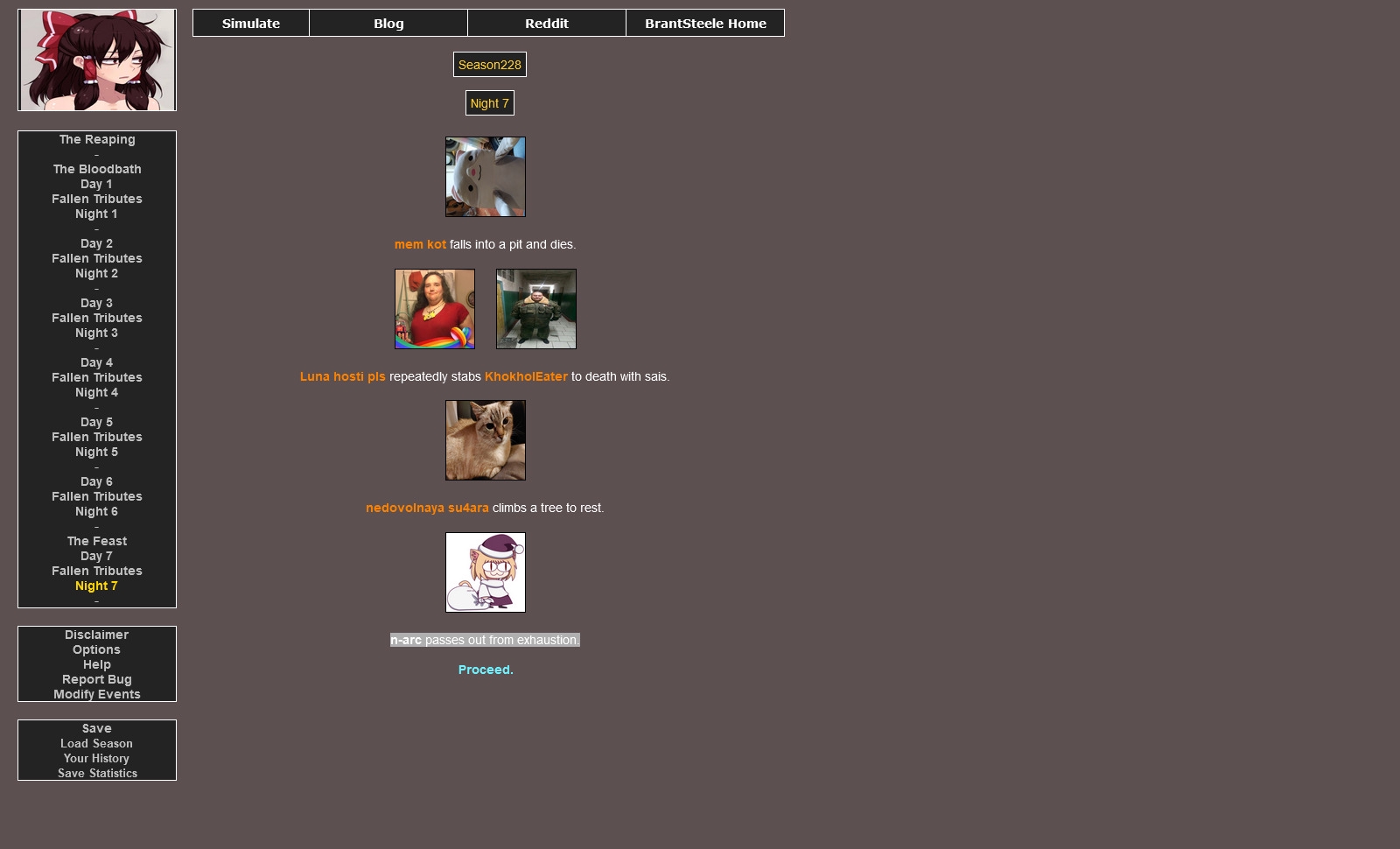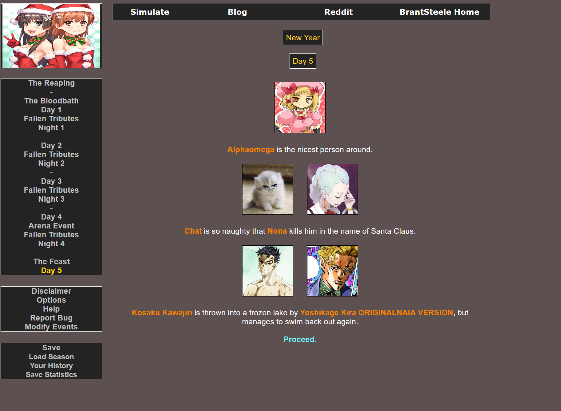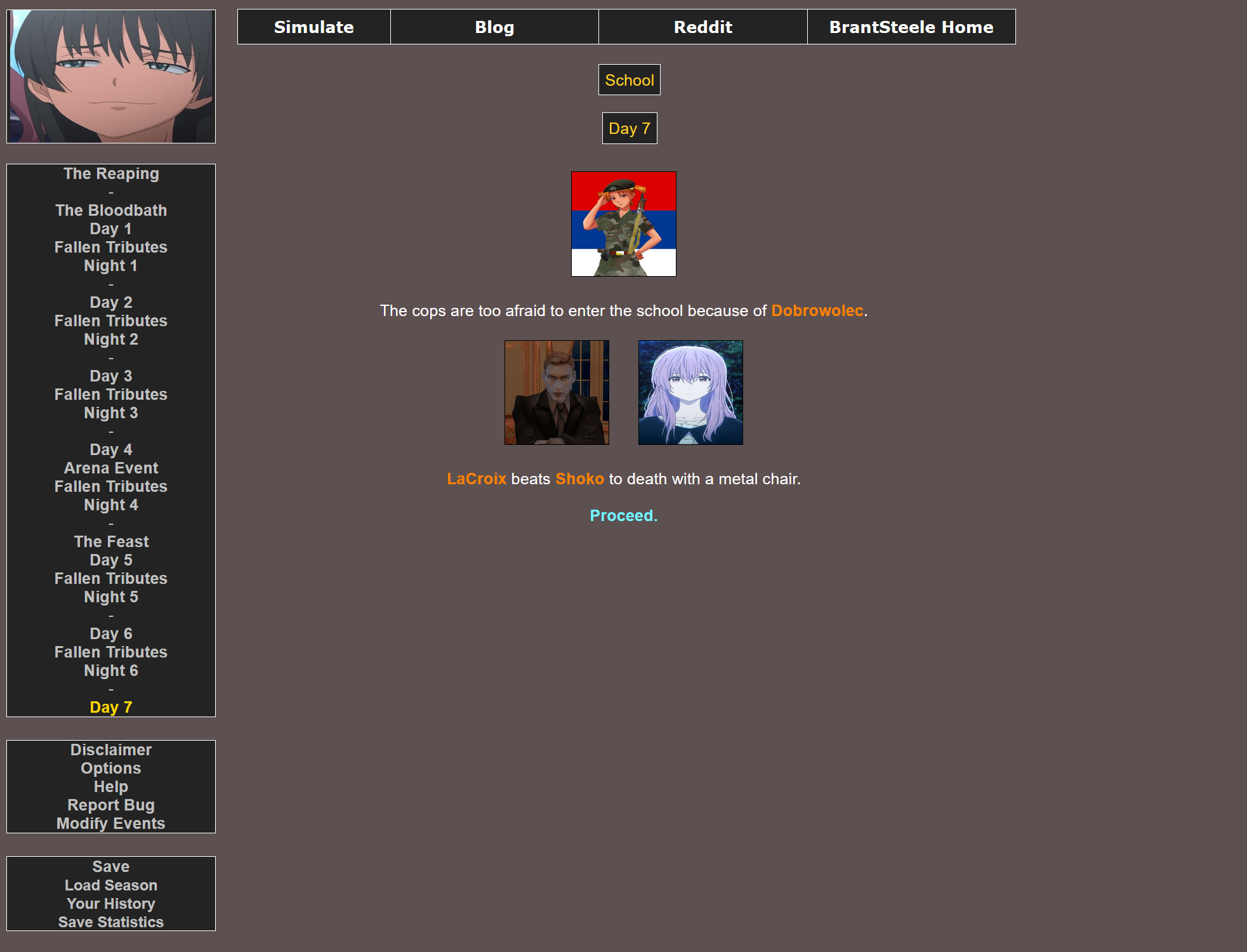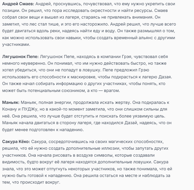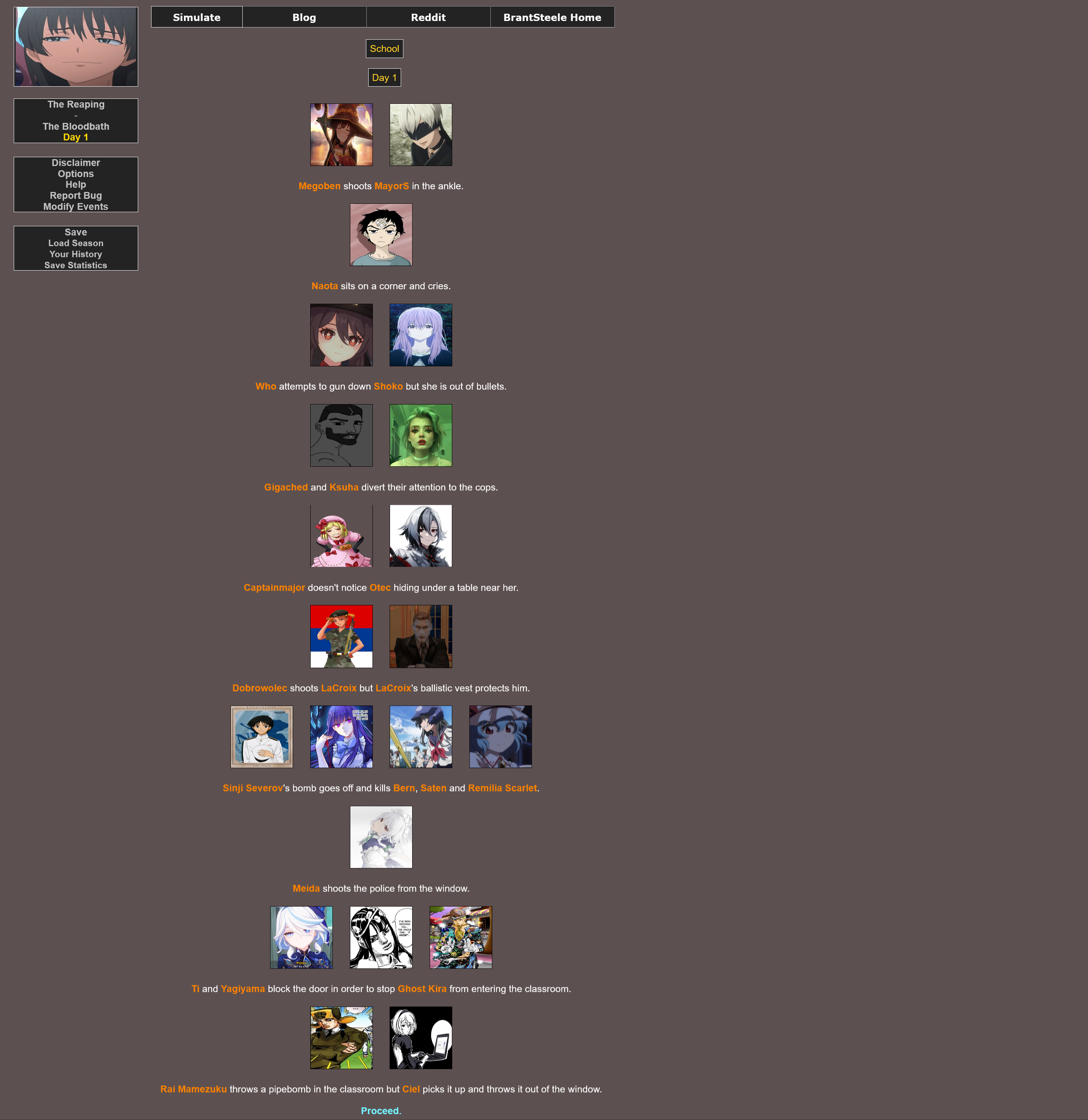 >>1536877 1. Ждёшь, когда хост даст команду на сбор персонажей. Например, как тут >>1536786 2. Вкидываешь в тред имя персонажа + его аватарку, как тут >>1536792 3. Запасаешься попкорном, ждёшь, когда наберётся 24 персонажа на игру в текущих полудохлых реалиях придётся ждать не один день. Затем наблюдаешь за тем, как твой персонаж пробивается к первенству в симуляции Голодных Игр. Ну или скорее получает перо в бочину на первый-второй день. 4. ??? 5. PROFIT!