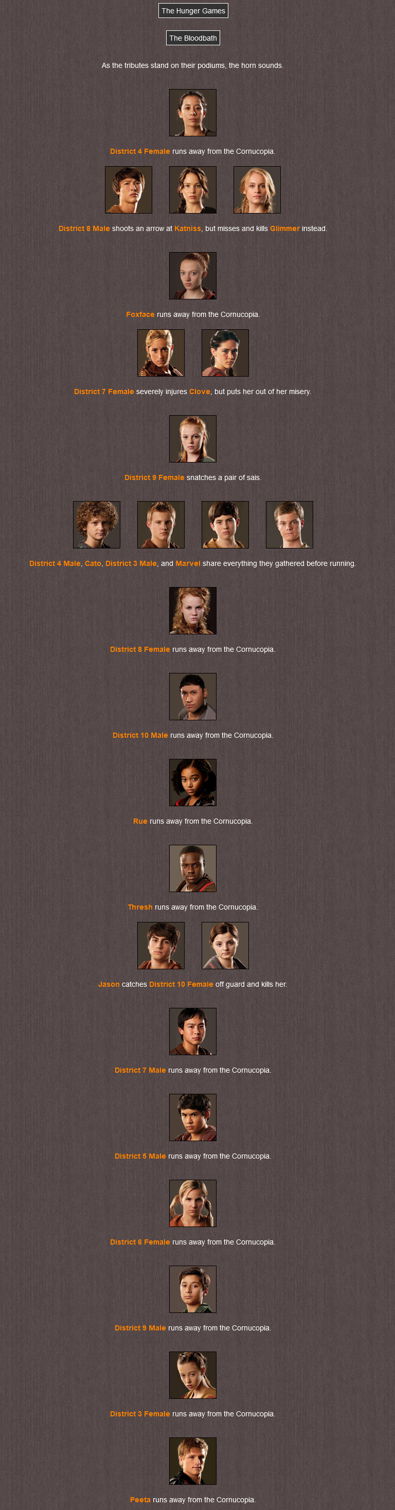Женщина из 6-го дистрикта, мужчина из 9-го дистрикта, женщина из 3-го дистрикта и Пита тоже приняли решение бежать, понимая, что это лишь начало кровавой битвы за выживание.
