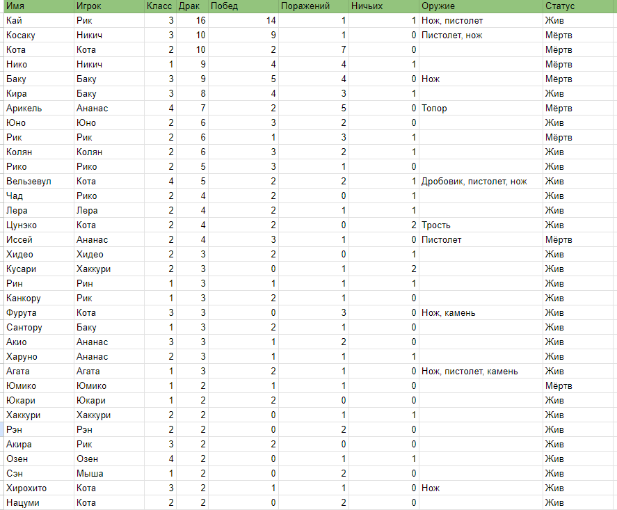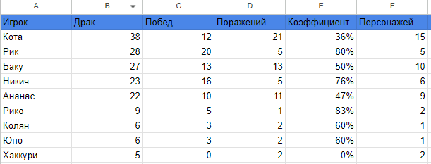 Я закончил свой список драк сегодня. К сожалению, некоторые драки были не заархивированы и я записал их только по памяти. Вот статистика по игрокам, у которых есть хотя бы 5 драк. И статистика персонажей у кого больше всего драк. Больше всего драк у Коты. Больше всего побед у Рика. Больше всего поражений у Коты. Самый высокий коэффициент побед у Рико (Чада). Больше всего персонажей у Коты.