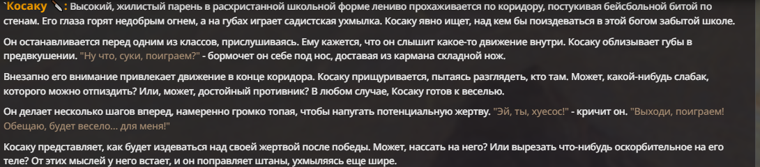 >>1537174 Мне просто кроме условного быдла/маньяка/ромпомпома/мента ничего в голову не приходит, так что наверное проще будет если ты сам арку эту закроешь. Хотя наверное дальнейших арок и не будет потому что мы единственные кто играет, лол.