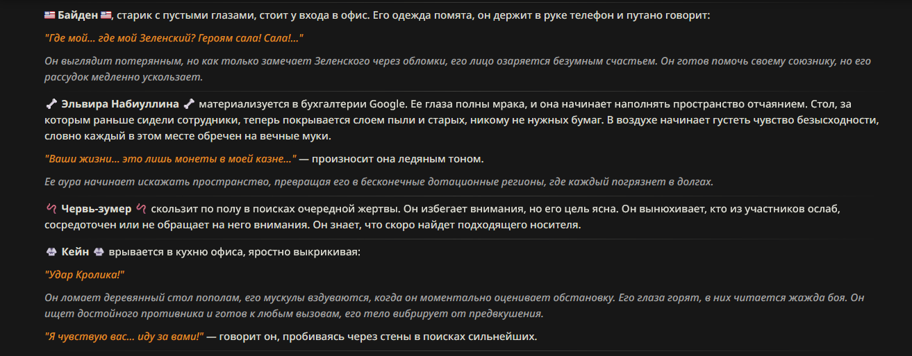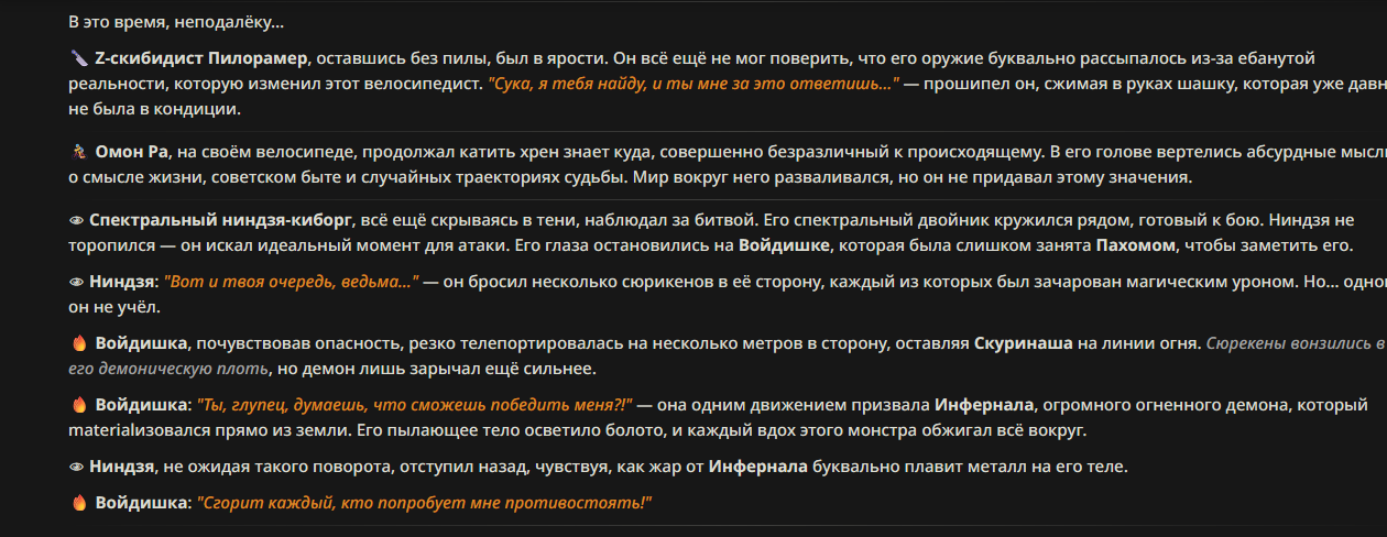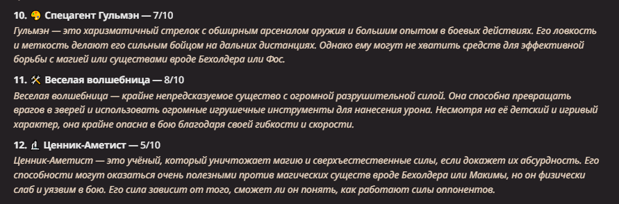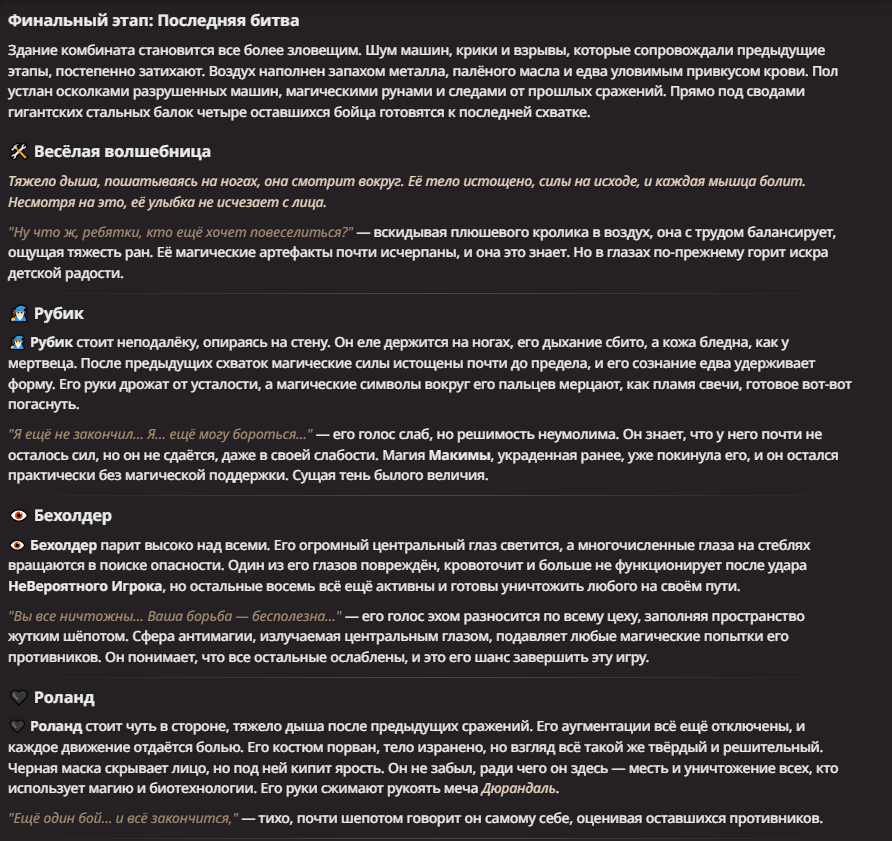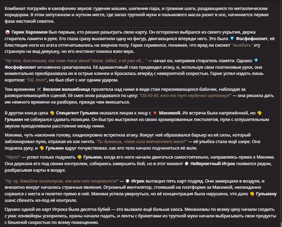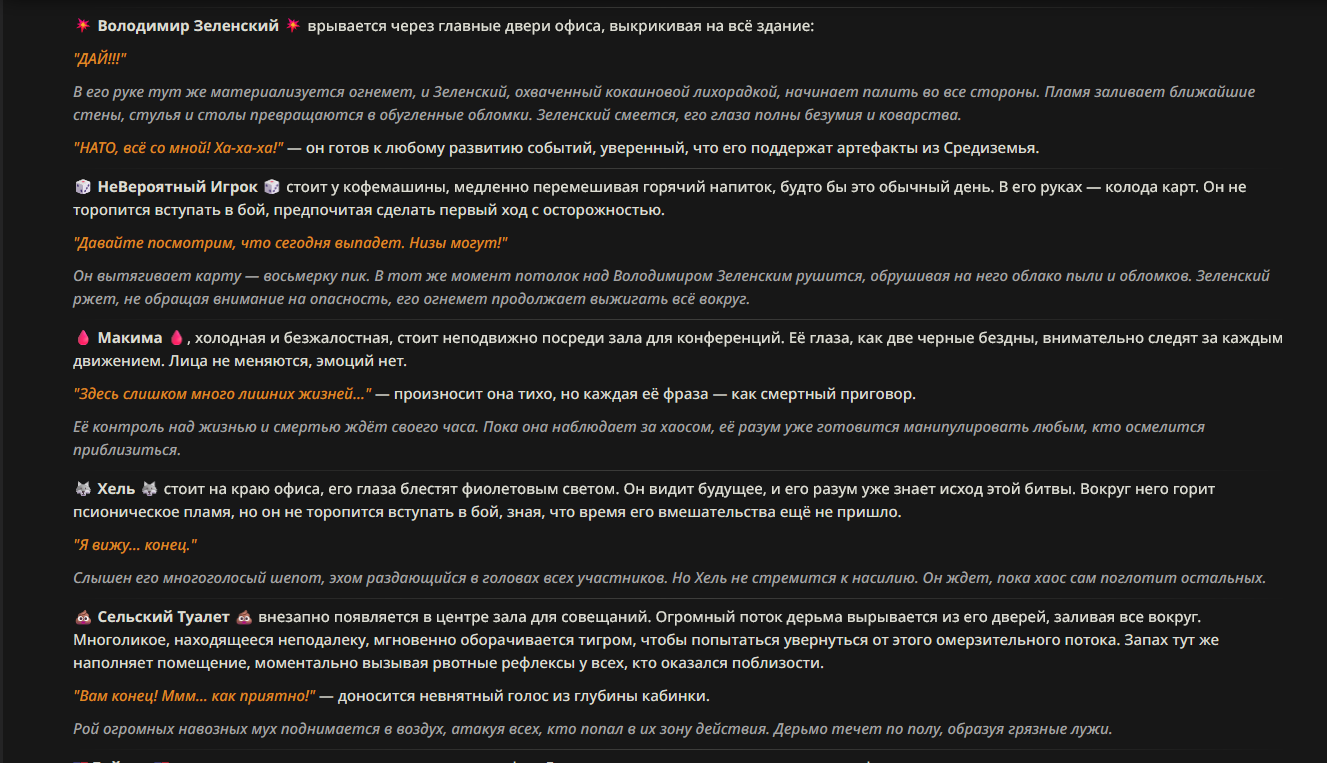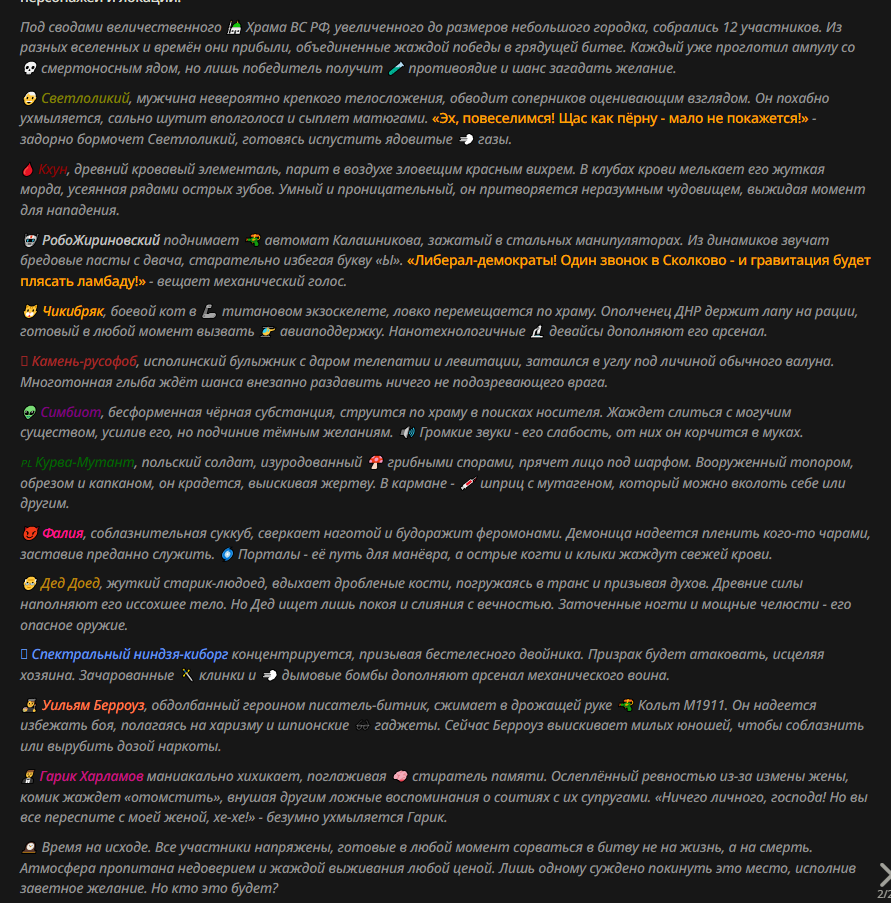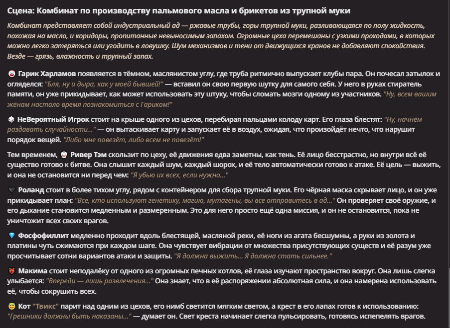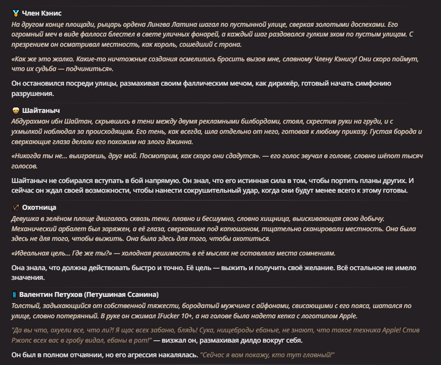 А у меня возникла идея, мб попросить нейронку привести описания всех персонажей к одному виду. Но чтоб она ничего от себя не придумала при этом, завтра протестирую сегодня уже от компа ушел