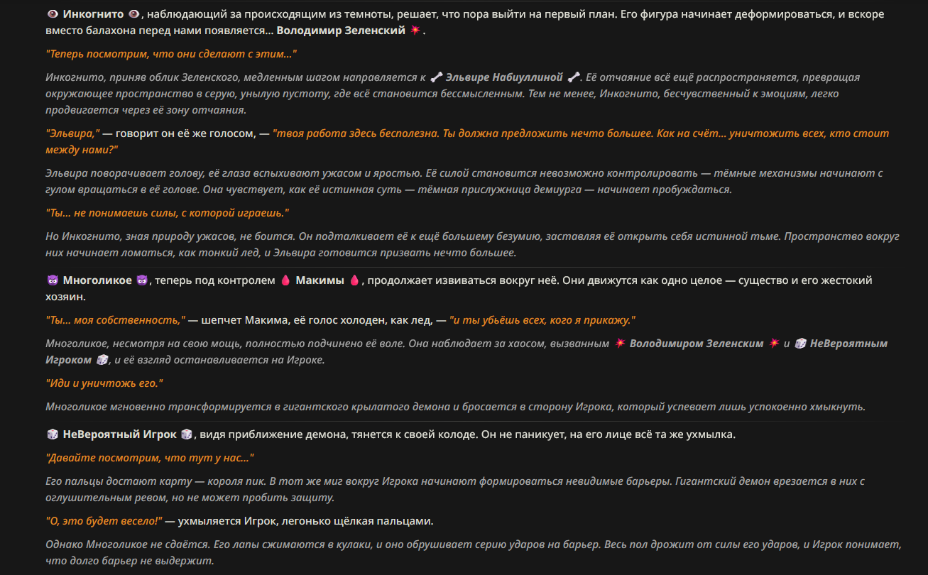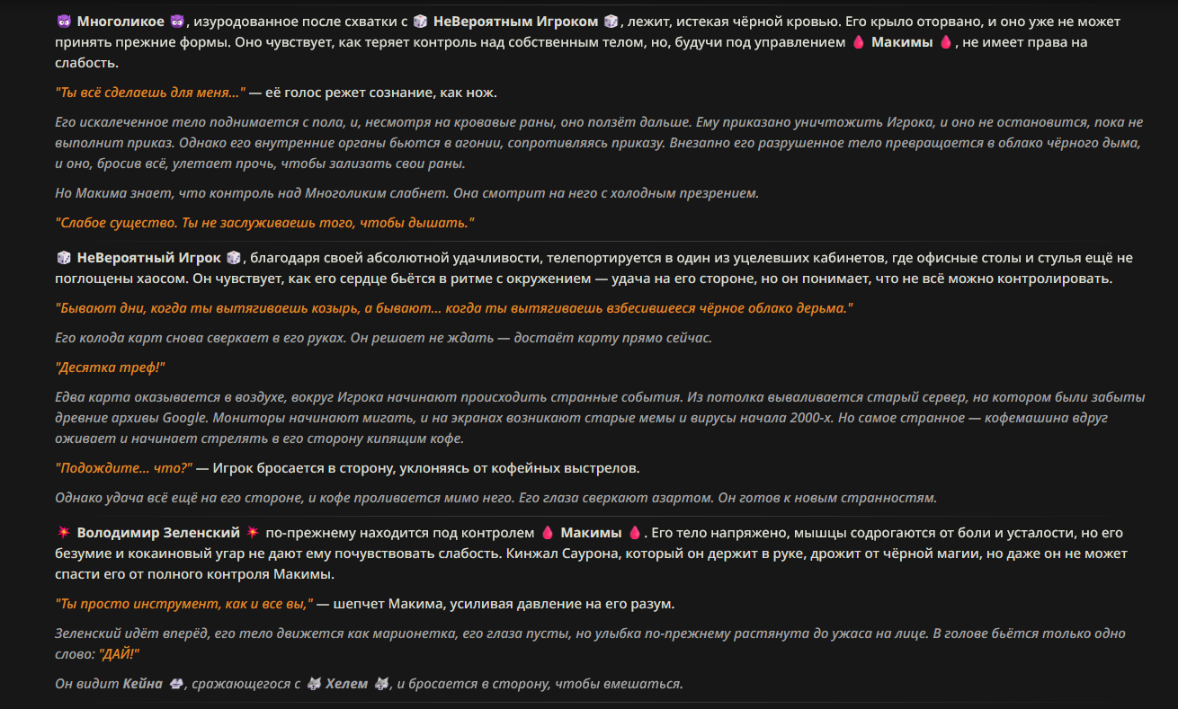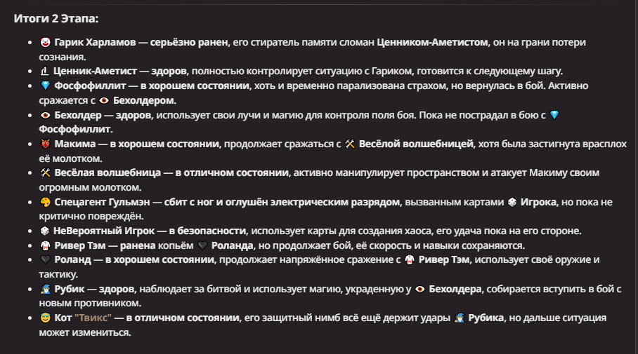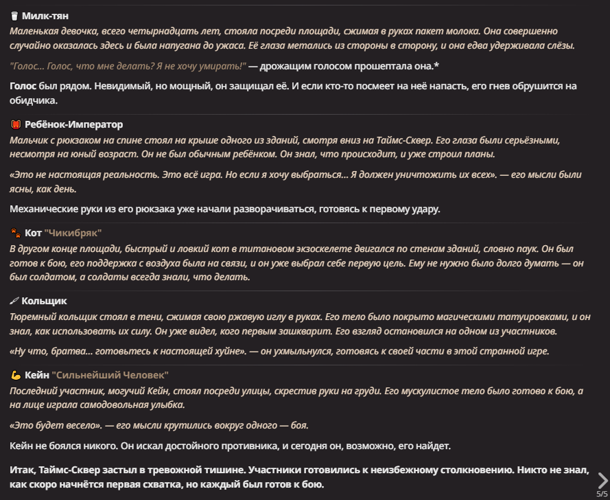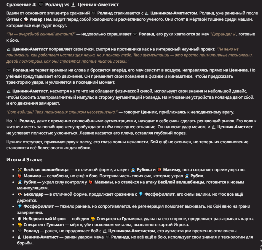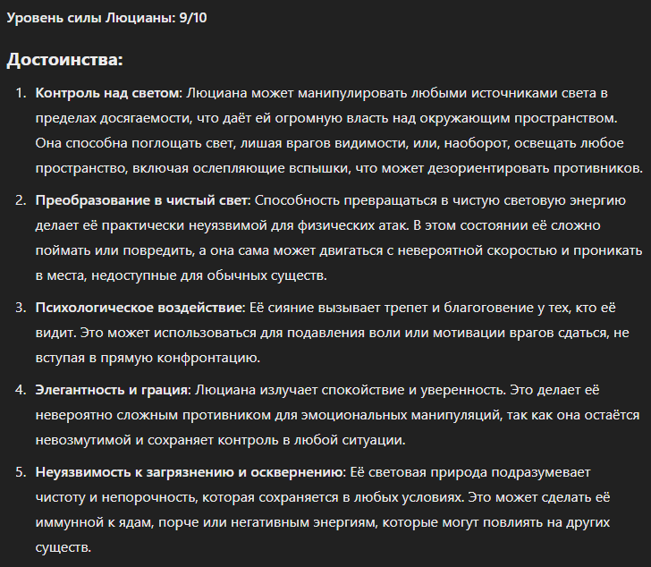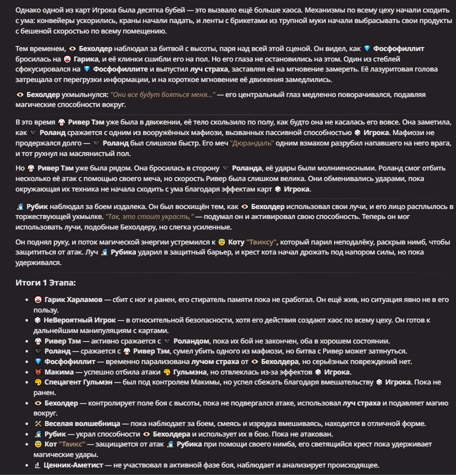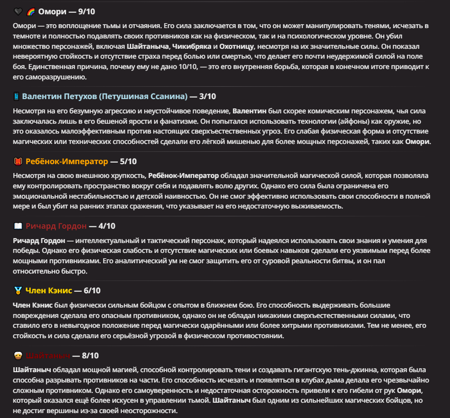 А у меня возникла идея, мб попросить нейронку привести описания всех персонажей к одному виду. Но чтоб она ничего от себя не придумала при этом, завтра протестирую сегодня уже от компа ушел
