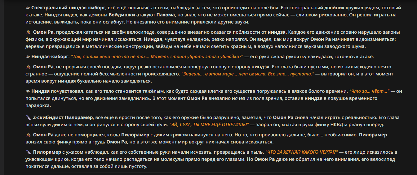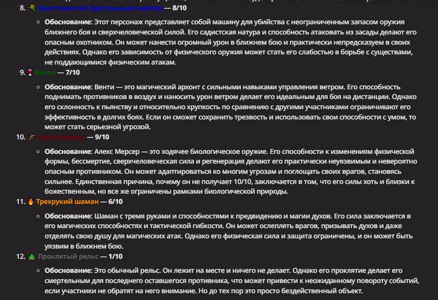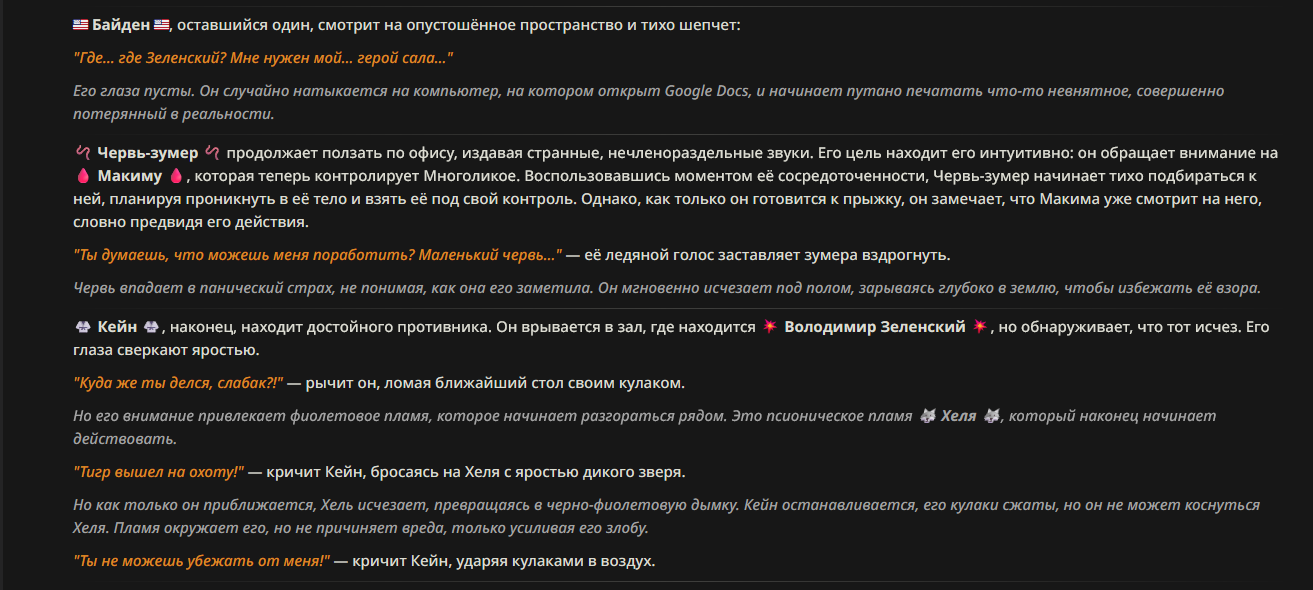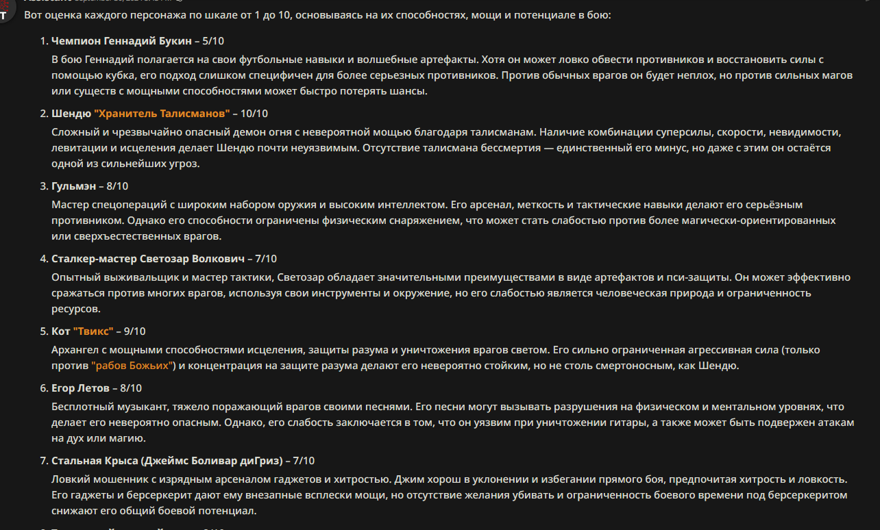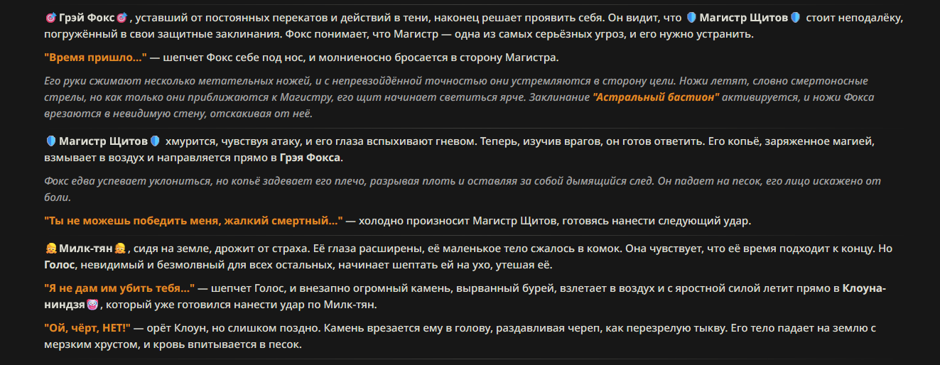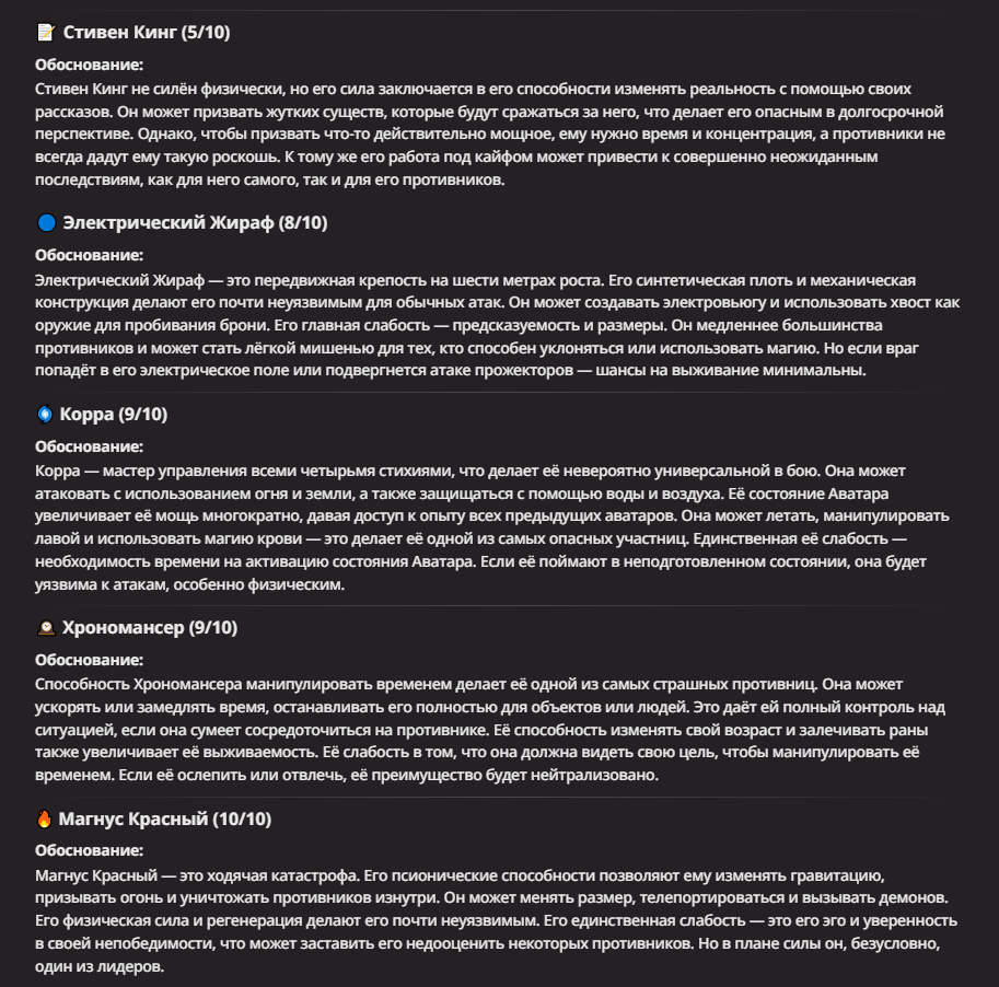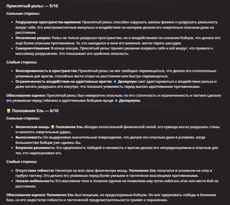 А у меня возникла идея, мб попросить нейронку привести описания всех персонажей к одному виду. Но чтоб она ничего от себя не придумала при этом, завтра протестирую сегодня уже от компа ушел