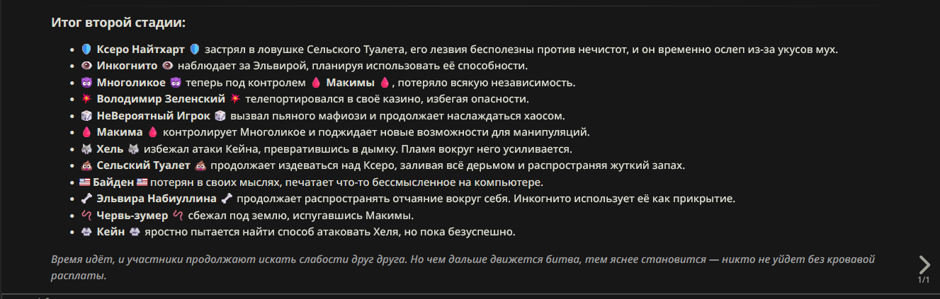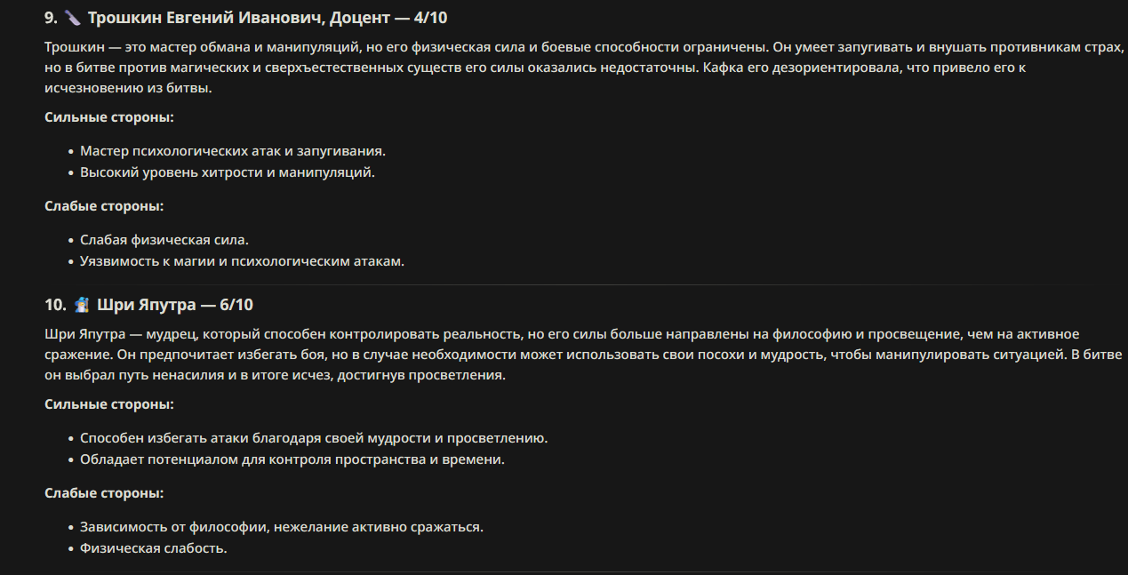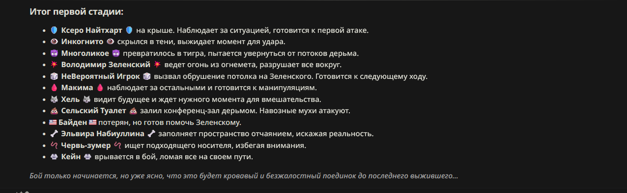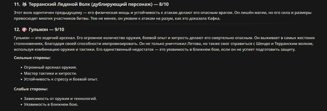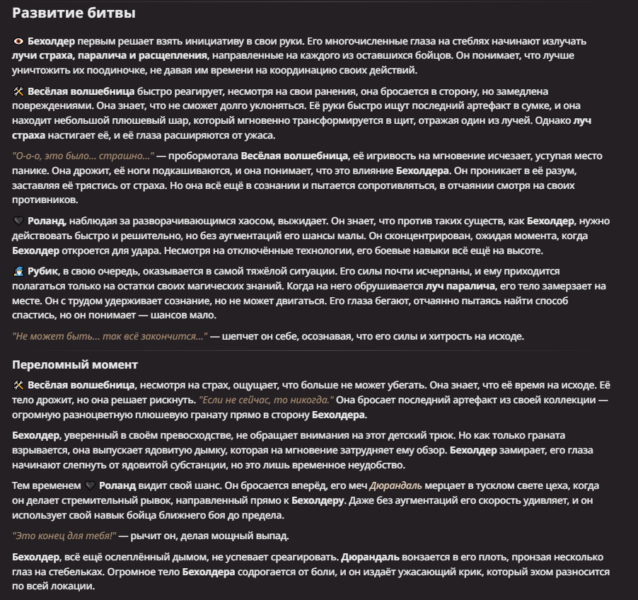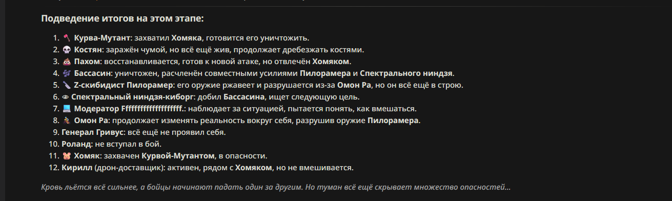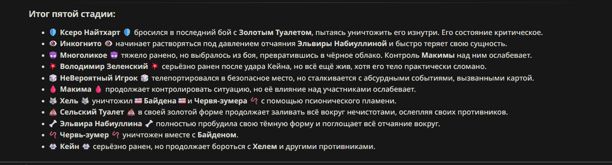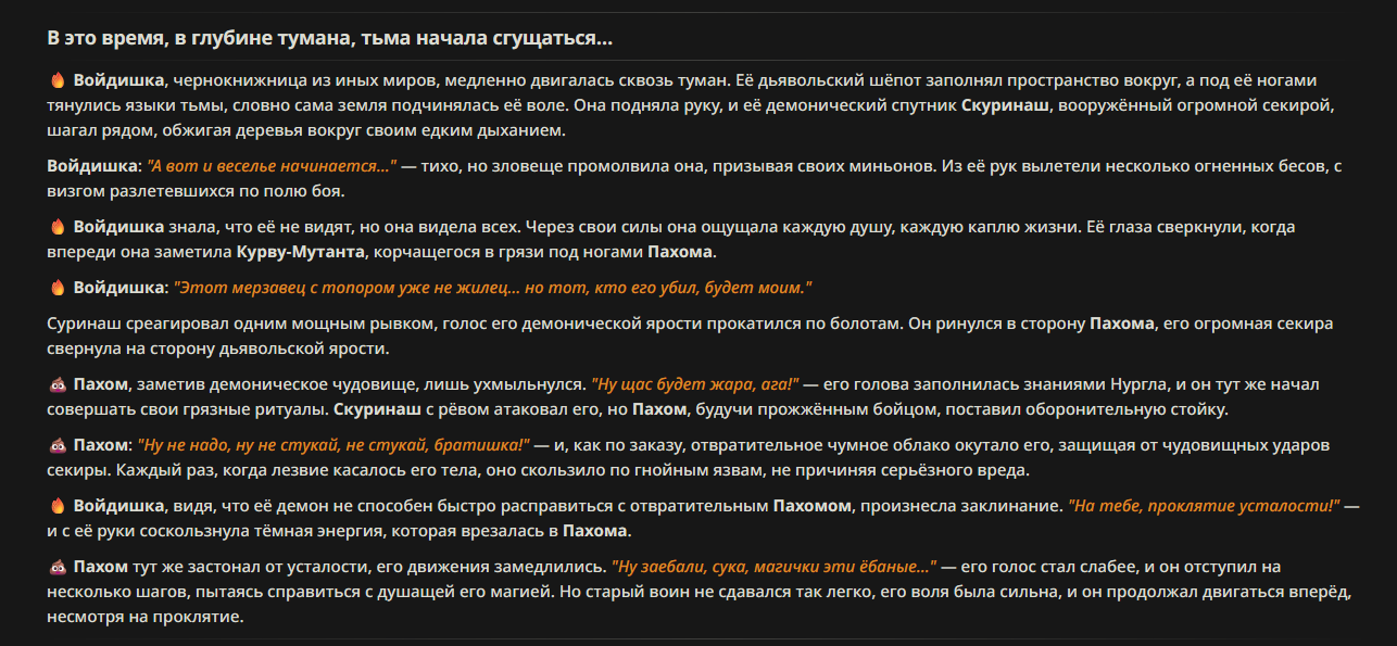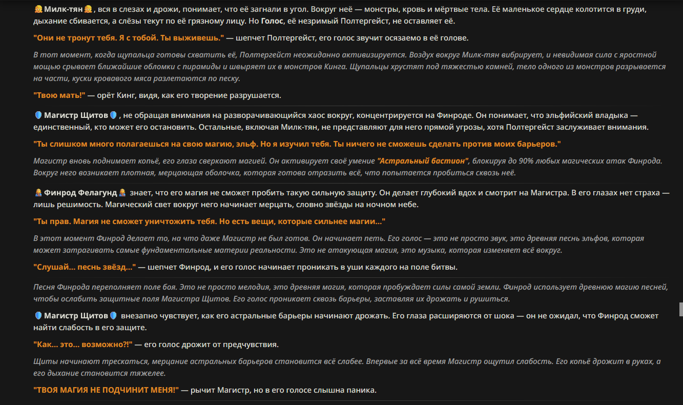 А у меня возникла идея, мб попросить нейронку привести описания всех персонажей к одному виду. Но чтоб она ничего от себя не придумала при этом, завтра протестирую сегодня уже от компа ушел