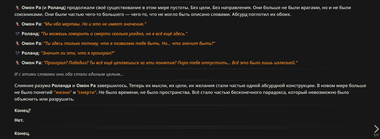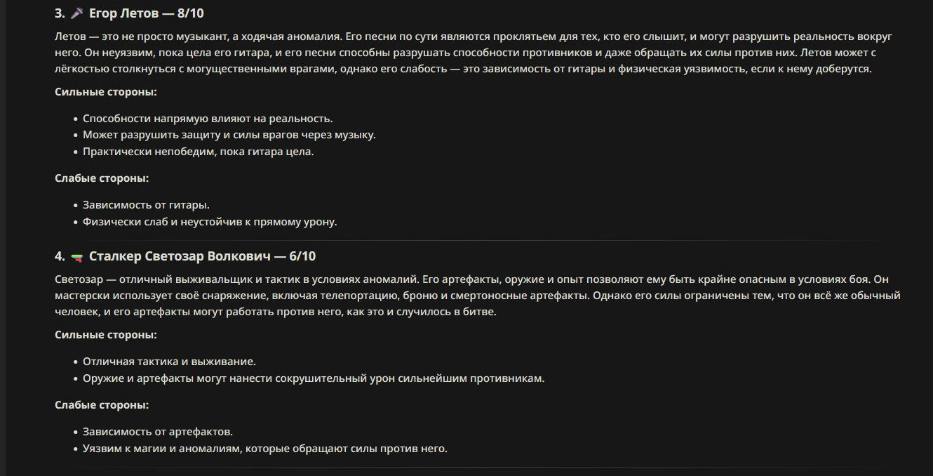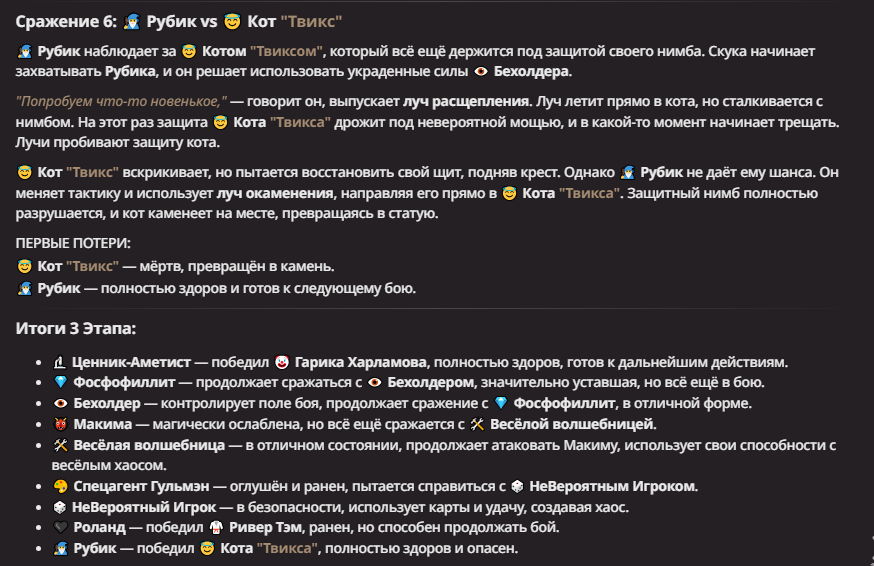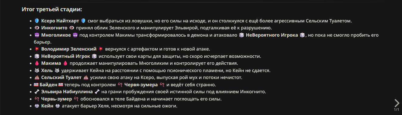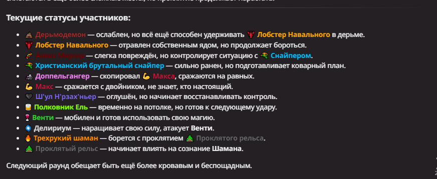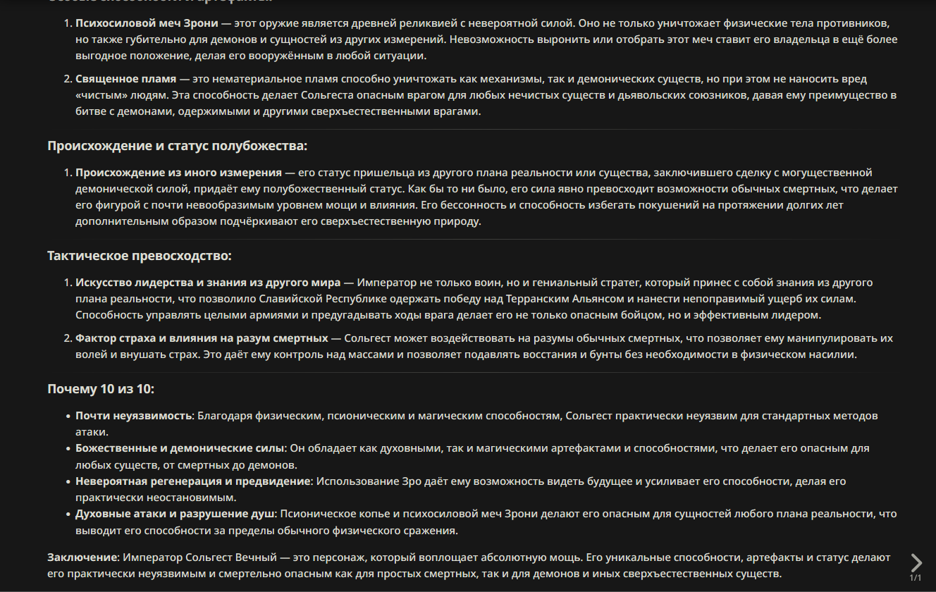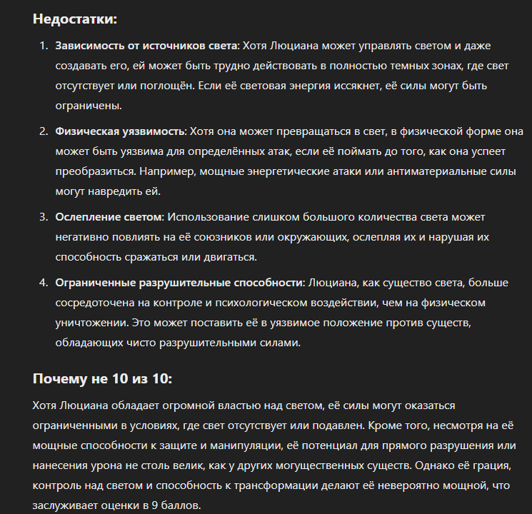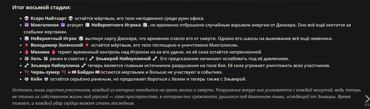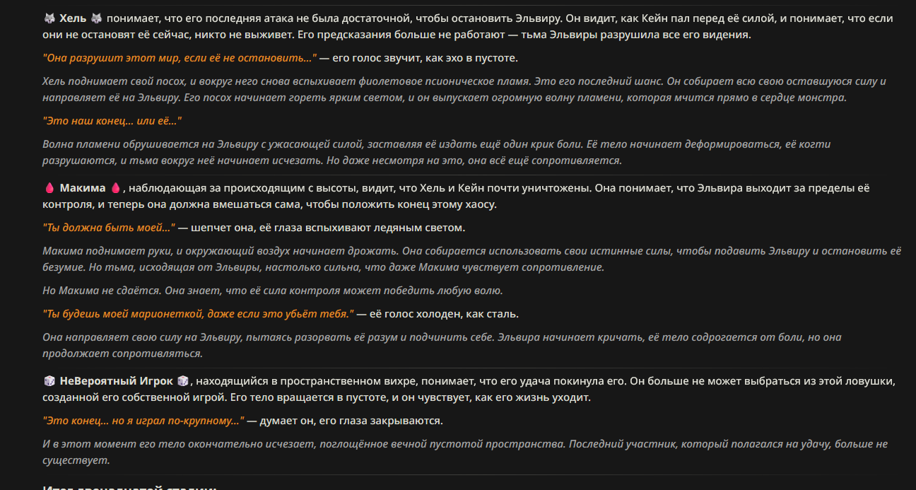 А у меня возникла идея, мб попросить нейронку привести описания всех персонажей к одному виду. Но чтоб она ничего от себя не придумала при этом, завтра протестирую сегодня уже от компа ушел