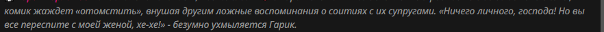 >>1544173 Гарик Харламов. Из-за случая измены своей жены которая была показана на больших экранах и последующей травли во время которой его постояно называли куколдом, сошёл с ума и решил, что все должны испытать его боль и поэтому поставил своей целью выебать или же заставить поверить, что он выебал чужих жён других людей. Вооружён стирателем памяти который он использует, чтобы вставлять ложные воспоминания случайным людям и опонентам о том как он ебал их жён. Имеет способность "Инстинкт комика", благодаря которой он может обернуть опасную ситуацию, если это возможно, в шутку. Хитёр, и может сначала попытаться втереться в доверие к жертве.