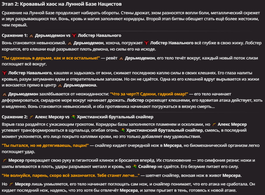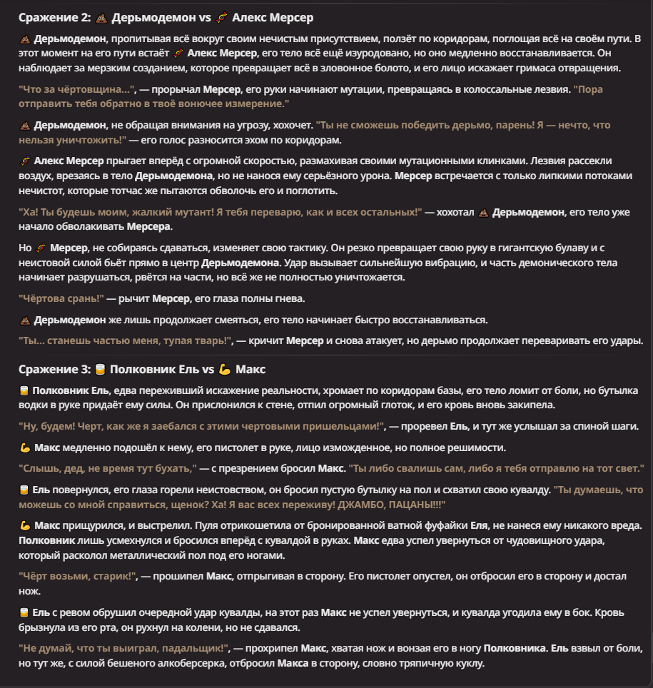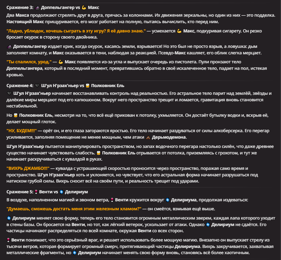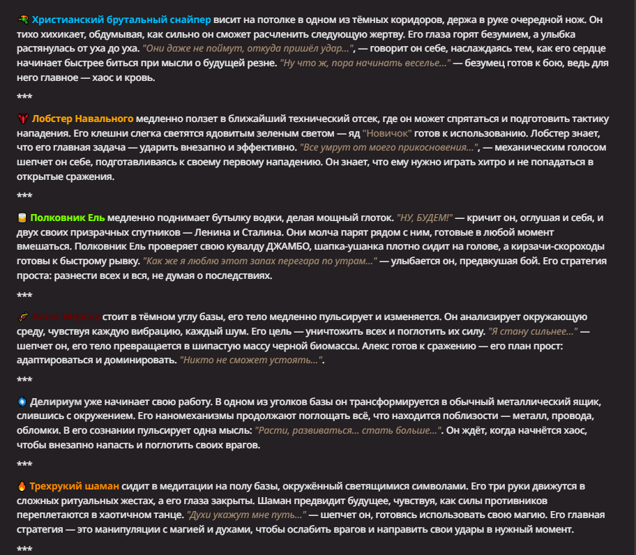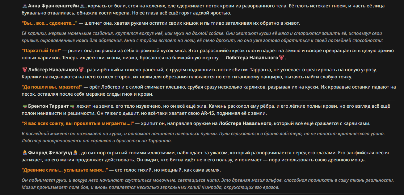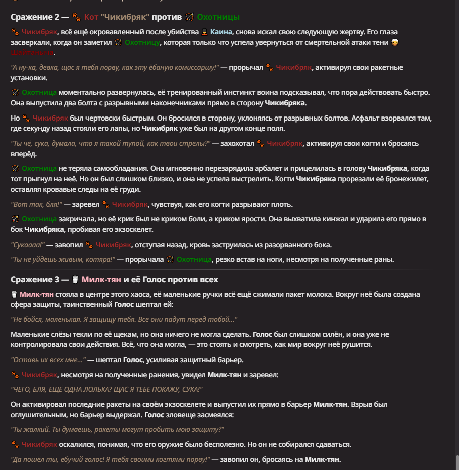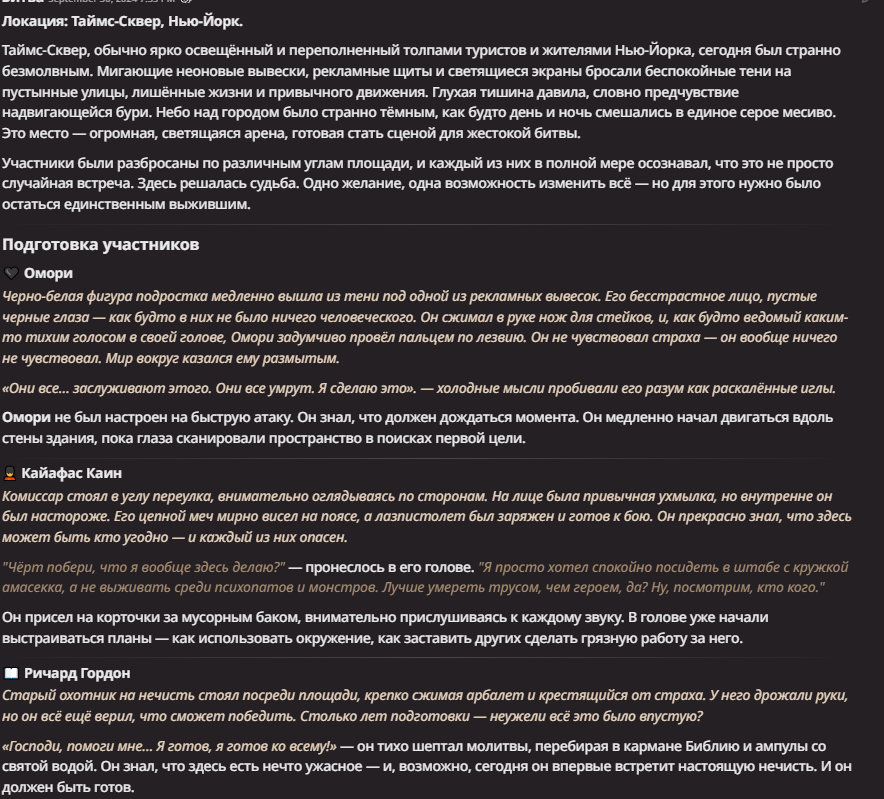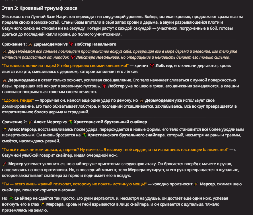 Промты скидывали в первом треде Обсуждения АИ Битв, я просто их скопировал и что-то по мелочи добавил, например строчку про допустимость NSFW и gore для Клода (ГПТ на неё ругается как будто).
