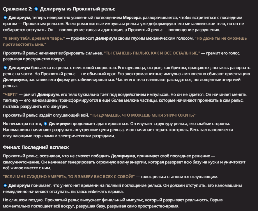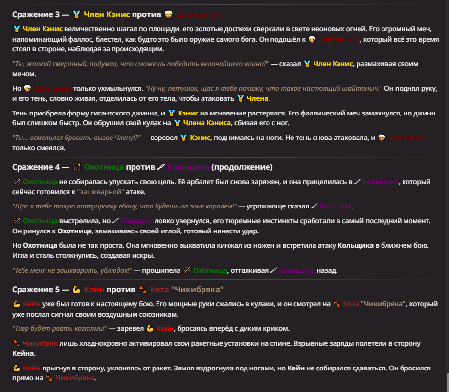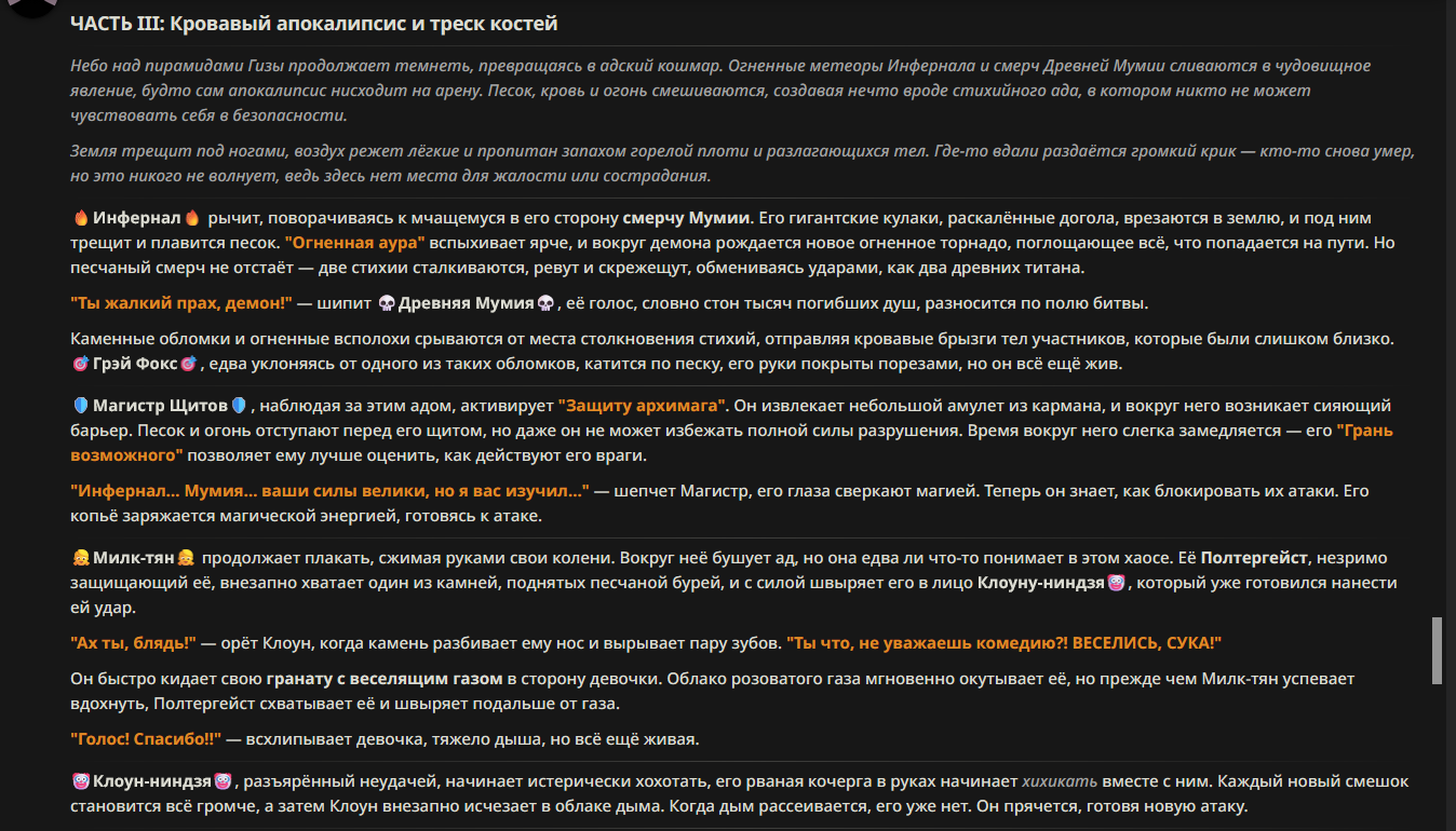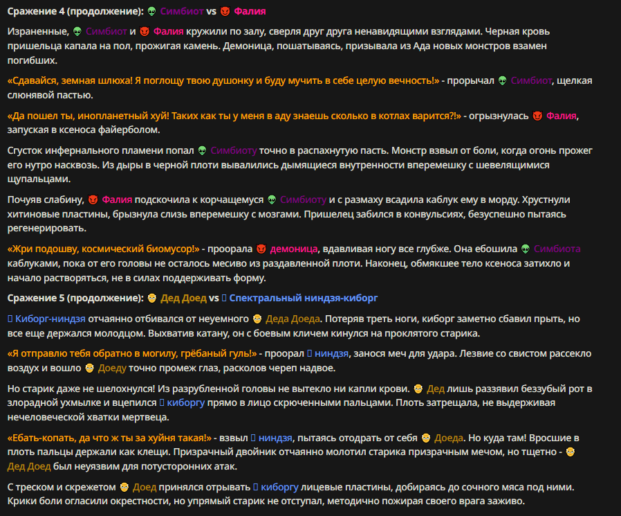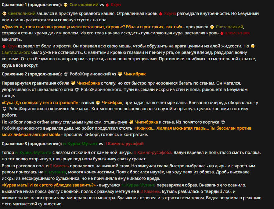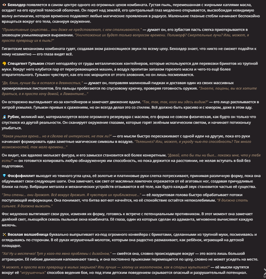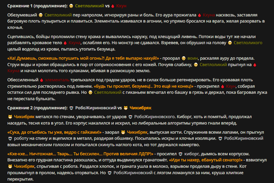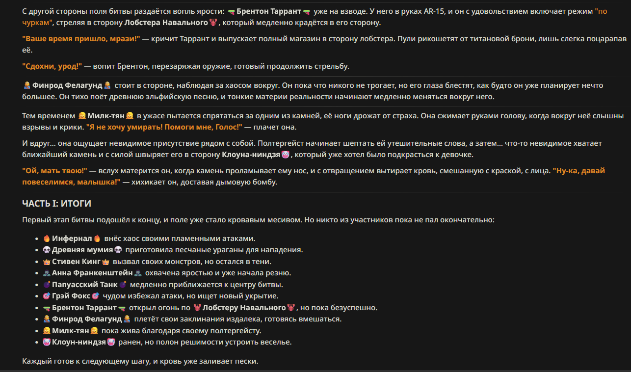 Промты скидывали в первом треде Обсуждения АИ Битв, я просто их скопировал и что-то по мелочи добавил, например строчку про допустимость NSFW и gore для Клода (ГПТ на неё ругается как будто).