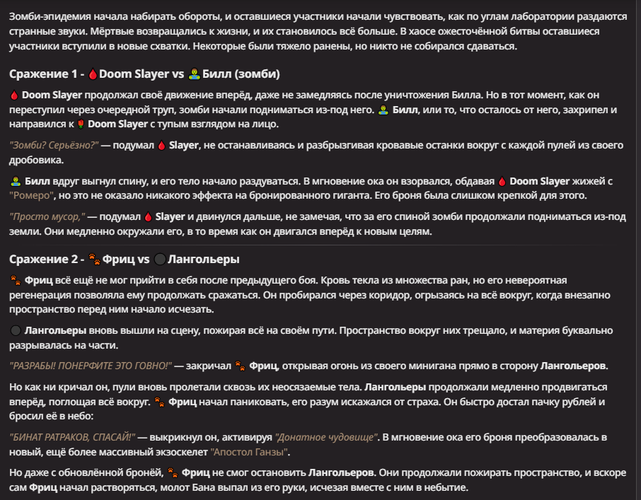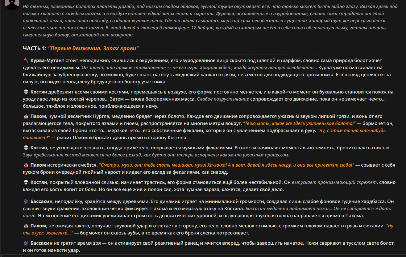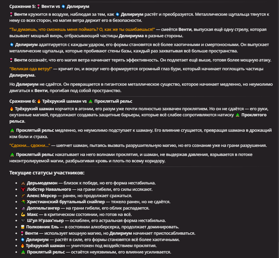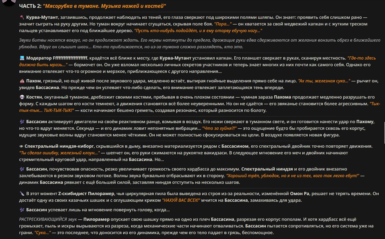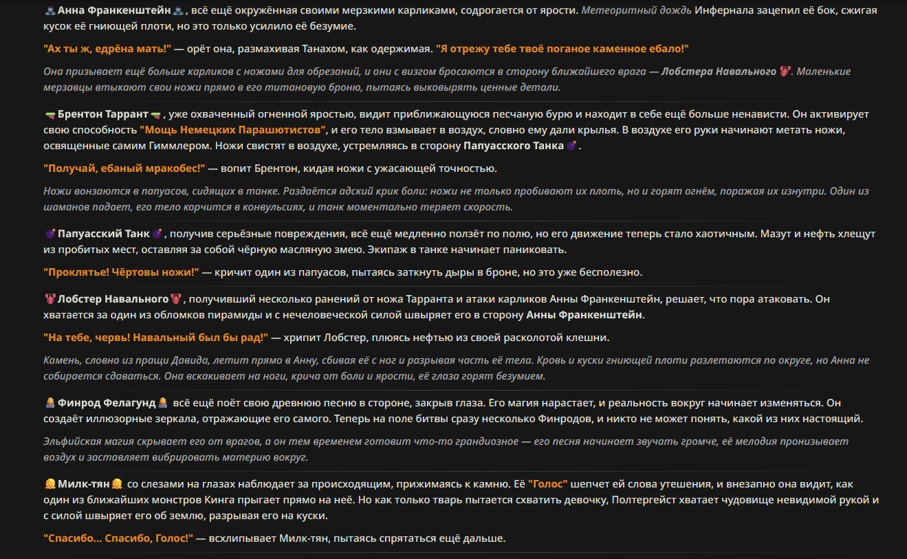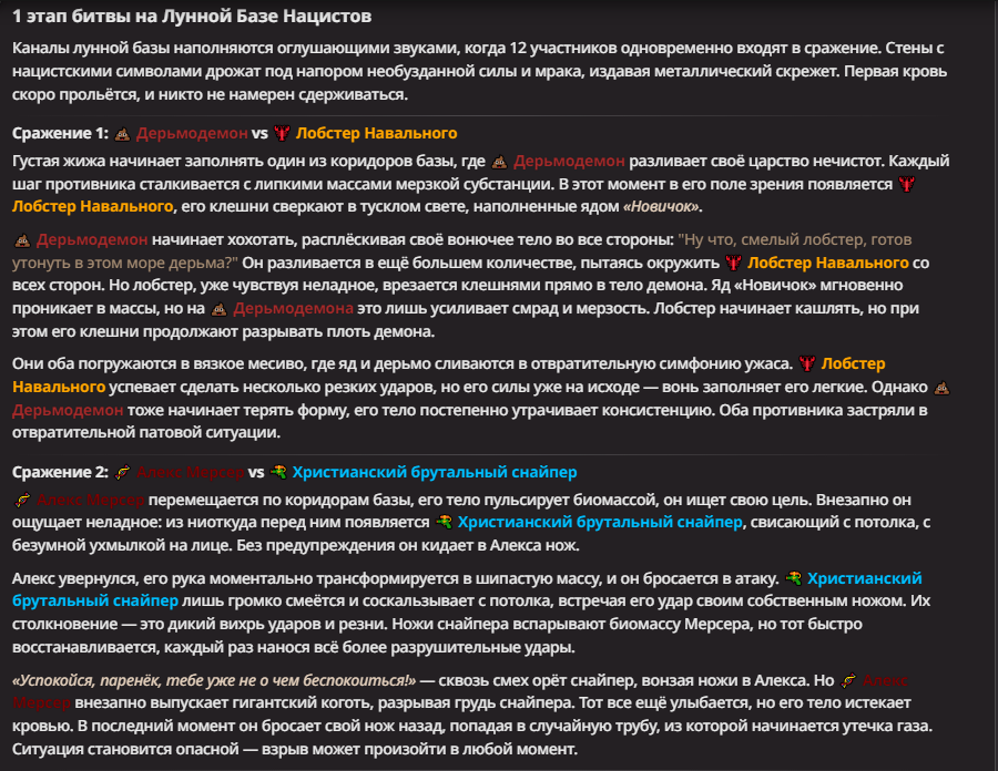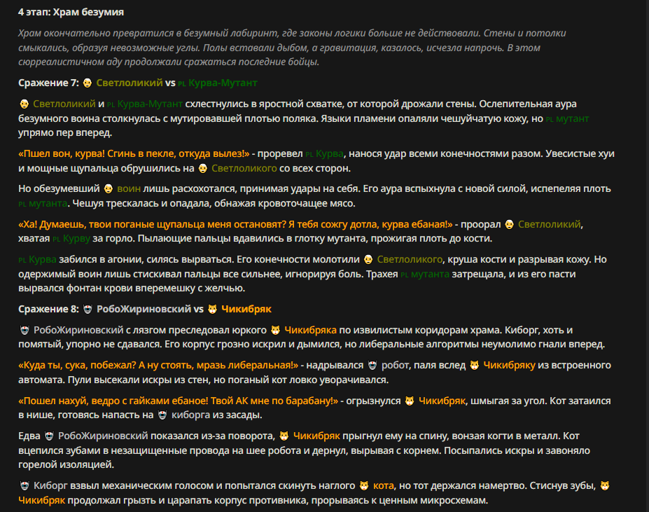 Промты скидывали в первом треде Обсуждения АИ Битв, я просто их скопировал и что-то по мелочи добавил, например строчку про допустимость NSFW и gore для Клода (ГПТ на неё ругается как будто).
