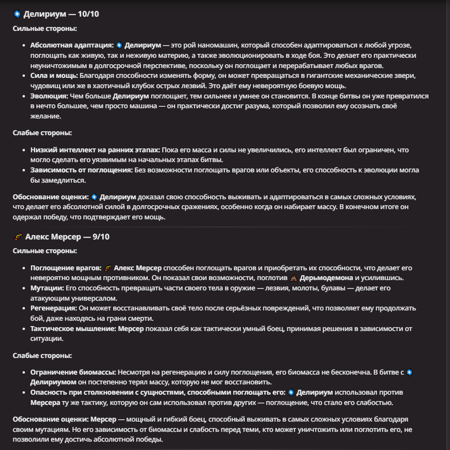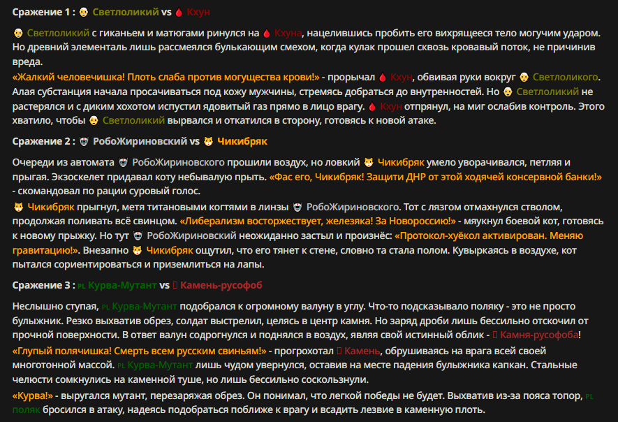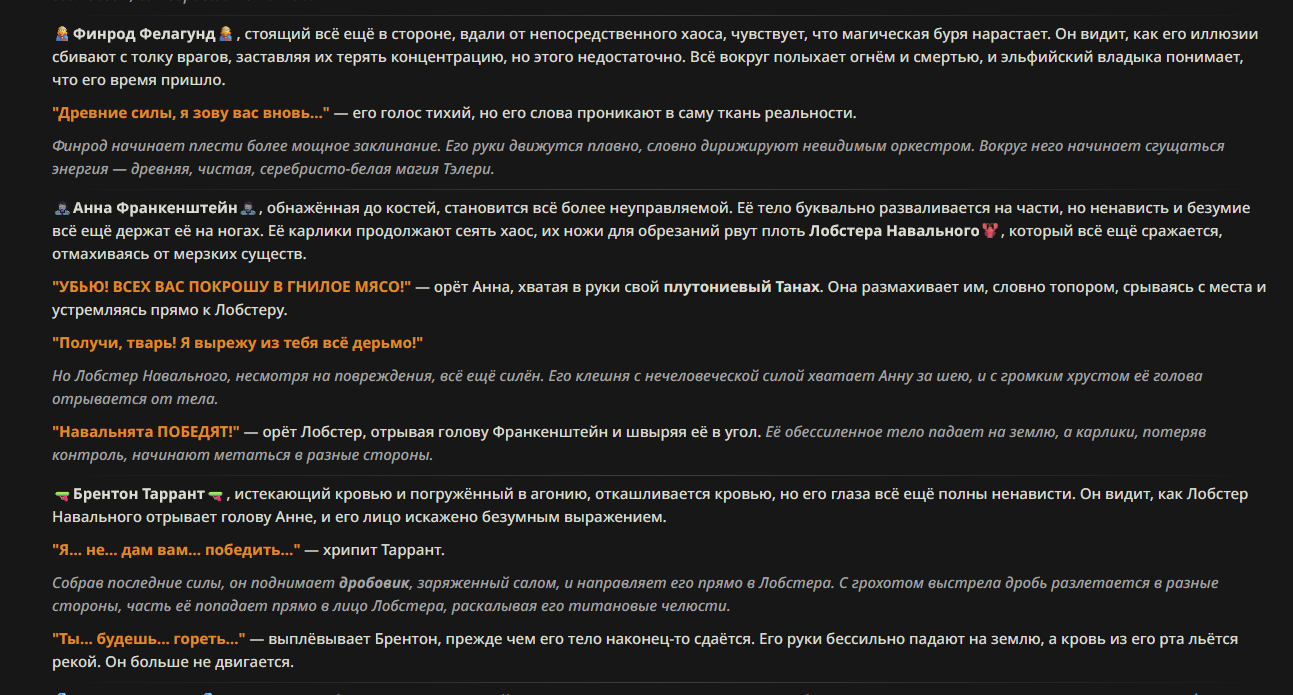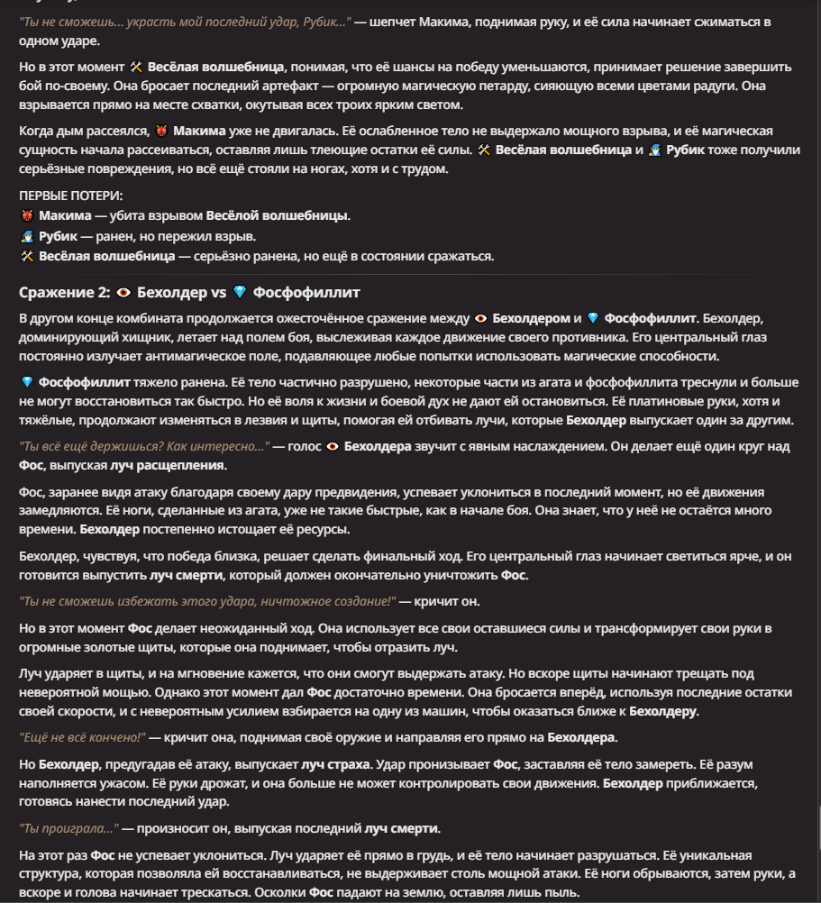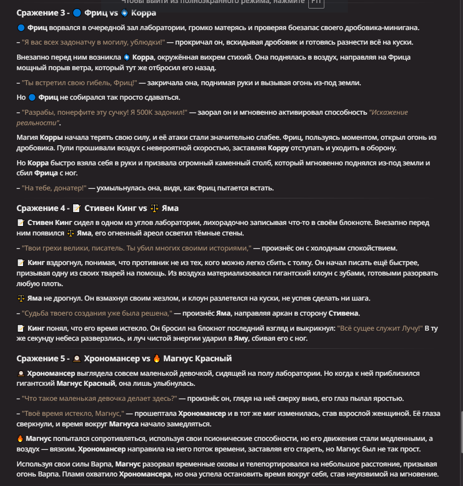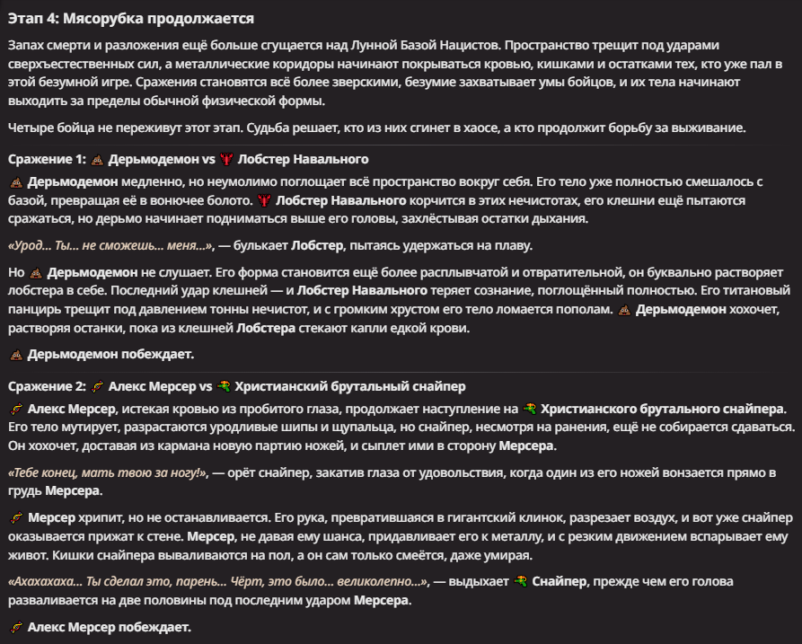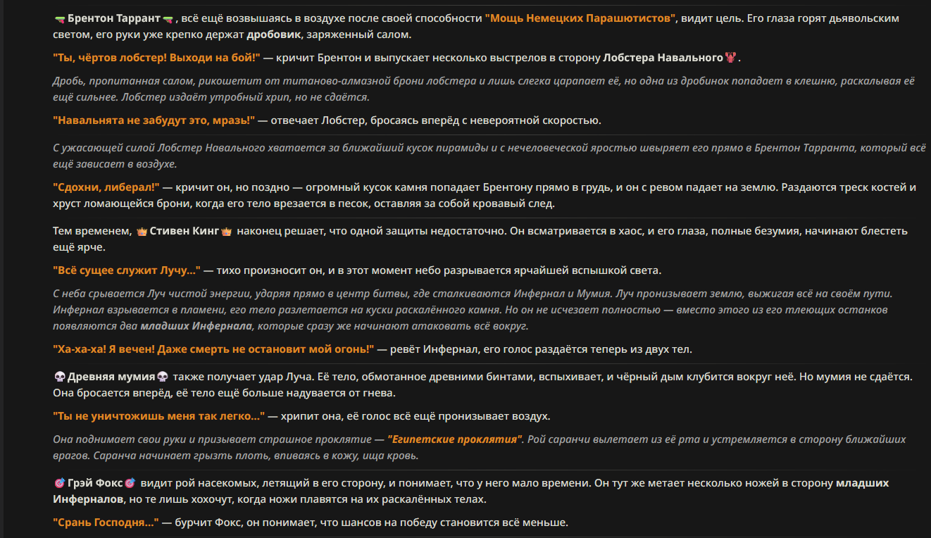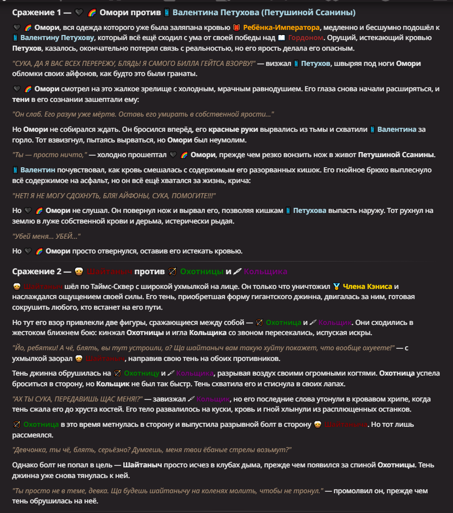 Промты скидывали в первом треде Обсуждения АИ Битв, я просто их скопировал и что-то по мелочи добавил, например строчку про допустимость NSFW и gore для Клода (ГПТ на неё ругается как будто).