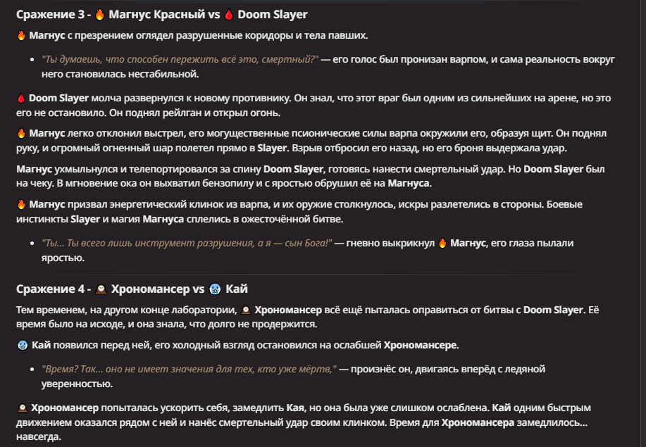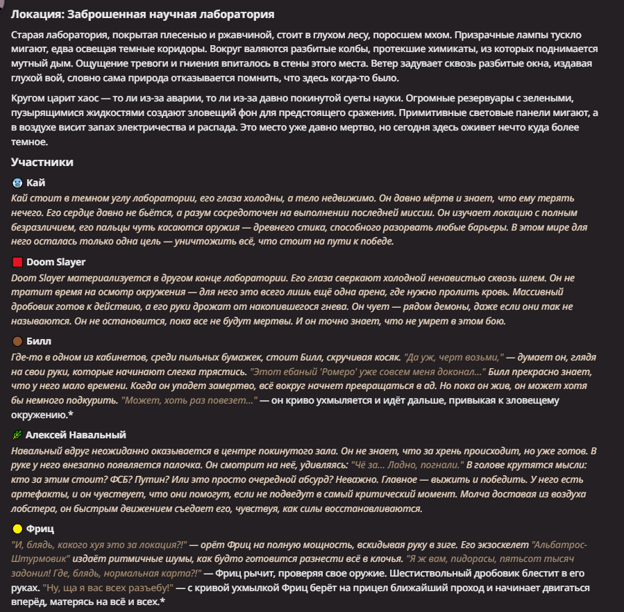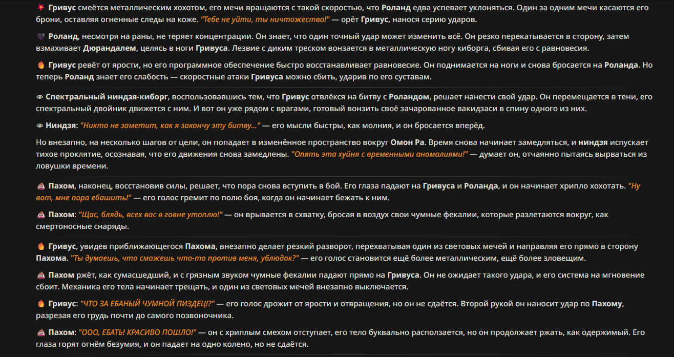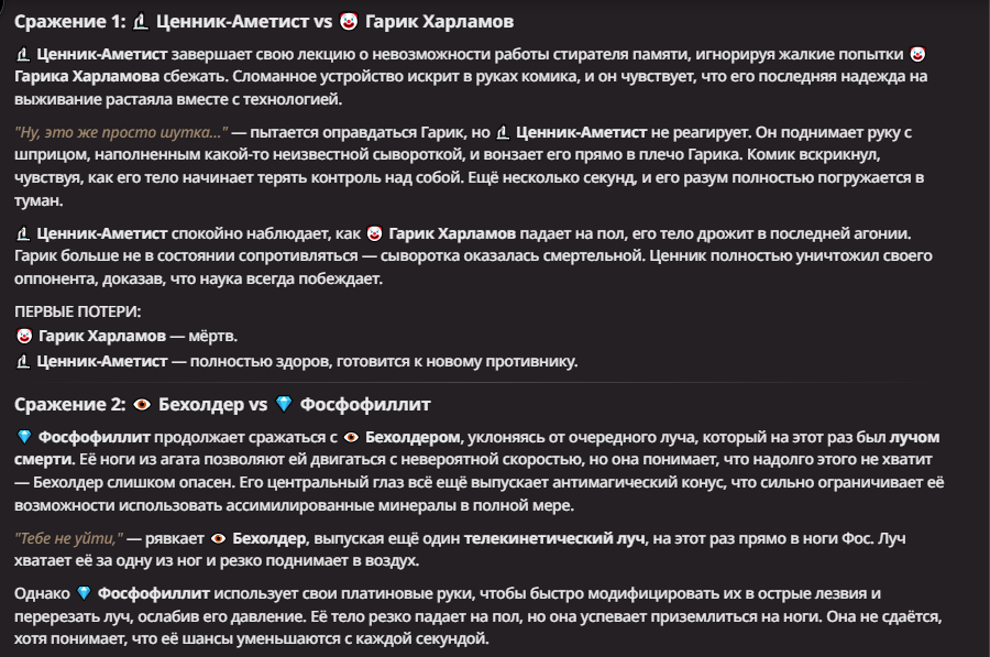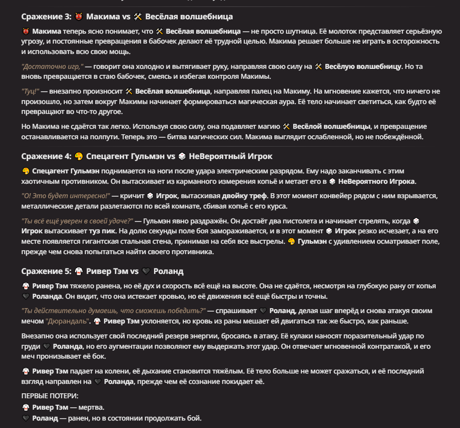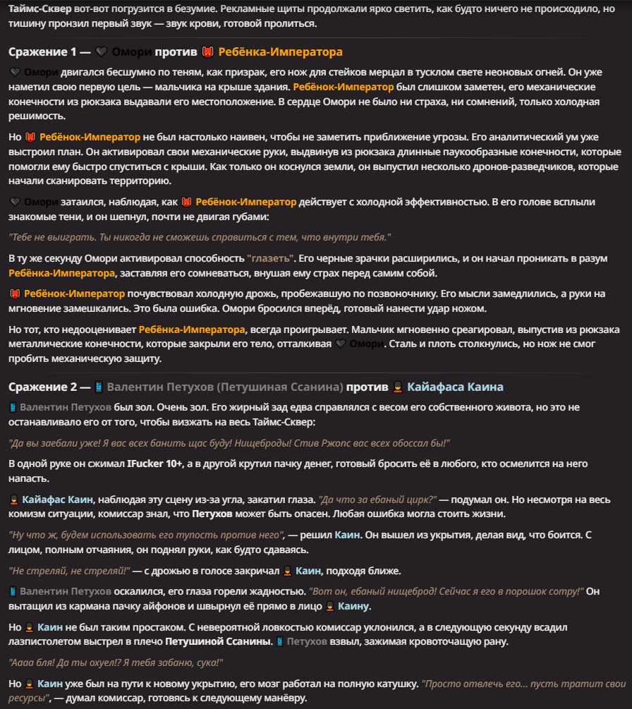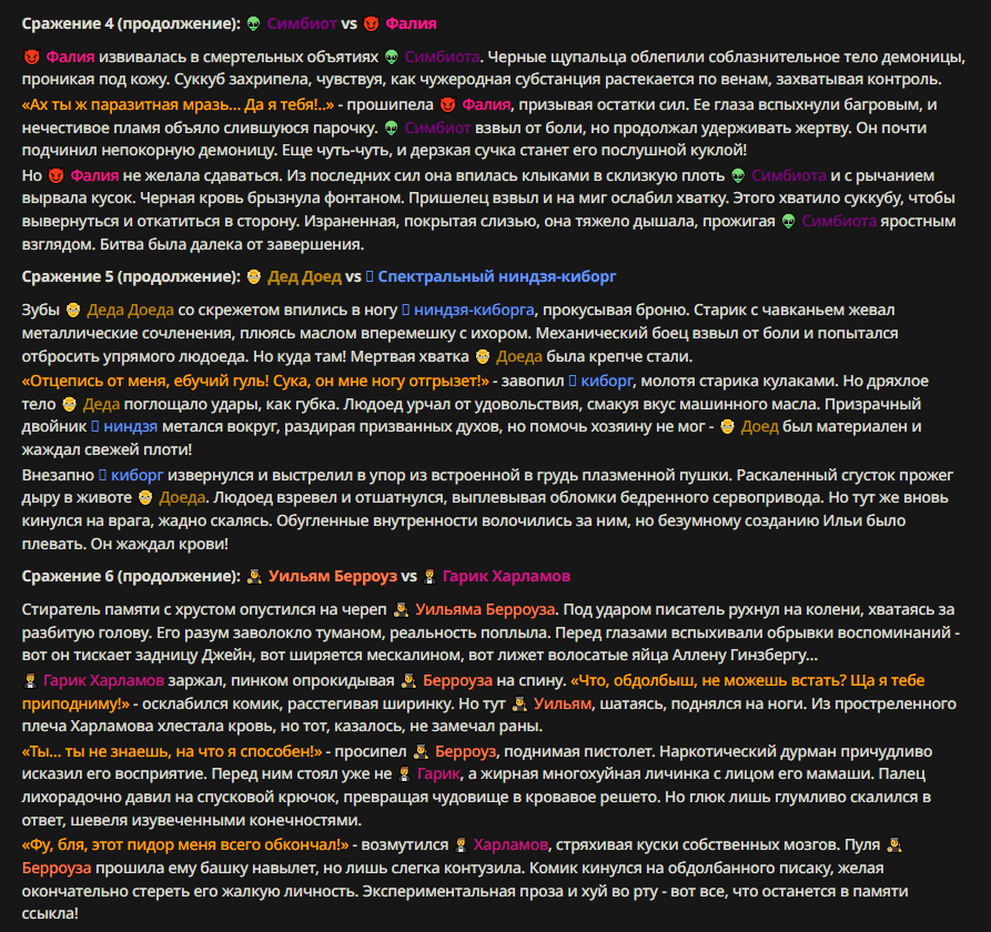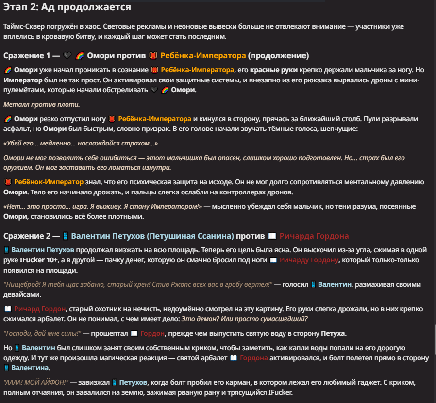 Промты скидывали в первом треде Обсуждения АИ Битв, я просто их скопировал и что-то по мелочи добавил, например строчку про допустимость NSFW и gore для Клода (ГПТ на неё ругается как будто).