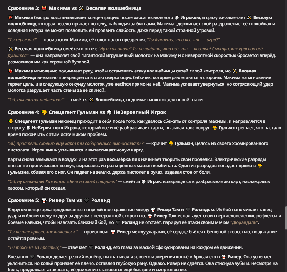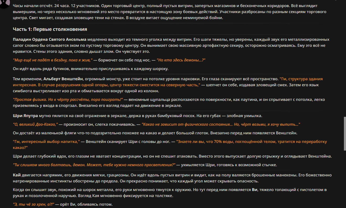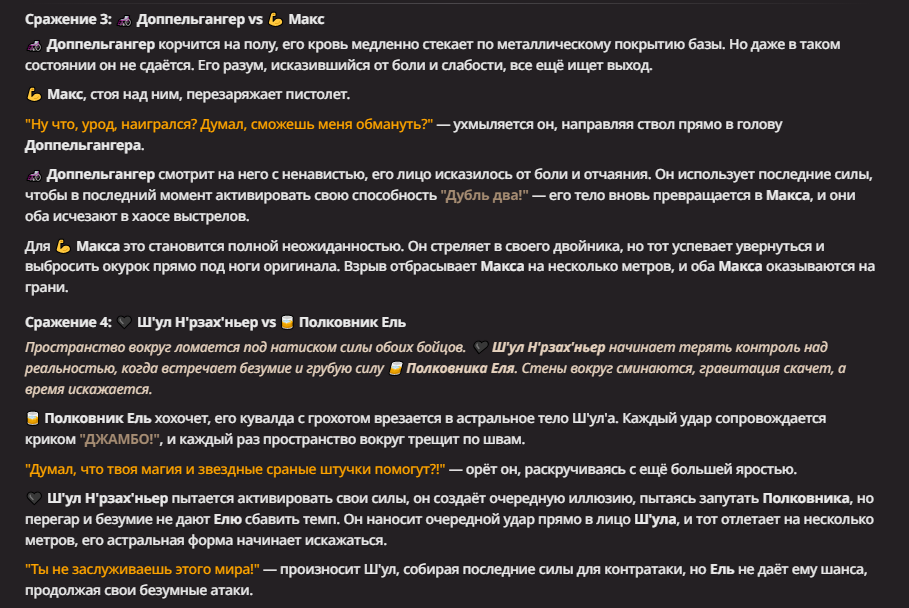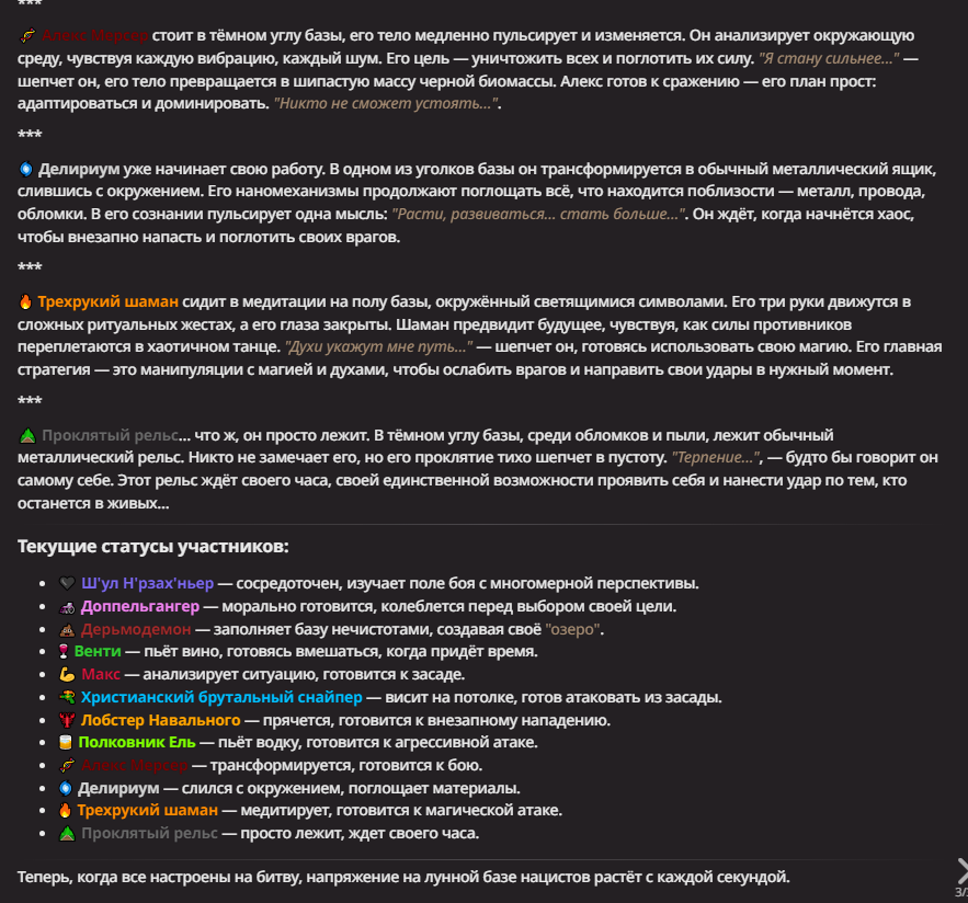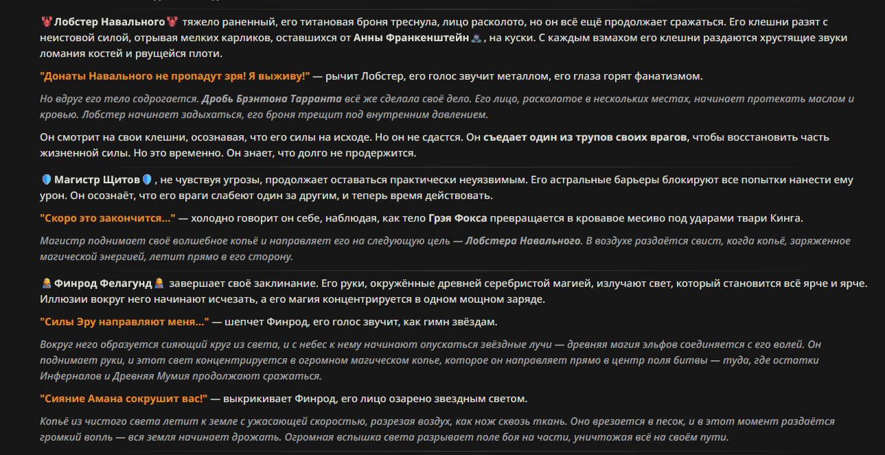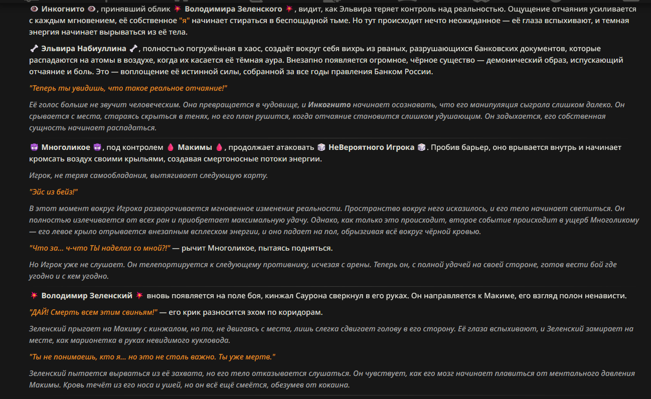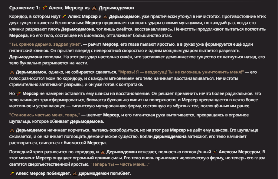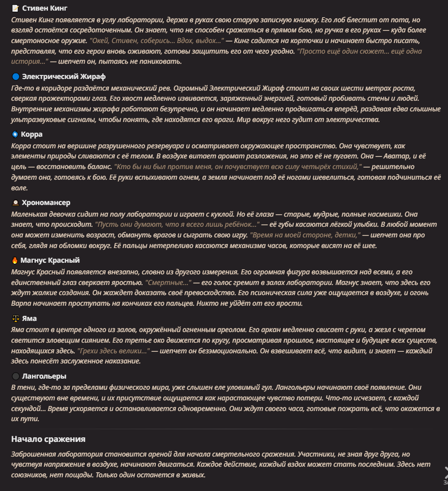 Промты скидывали в первом треде Обсуждения АИ Битв, я просто их скопировал и что-то по мелочи добавил, например строчку про допустимость NSFW и gore для Клода (ГПТ на неё ругается как будто).