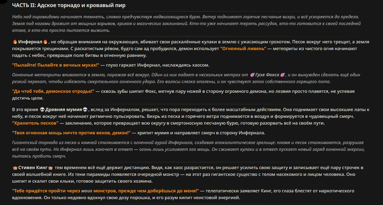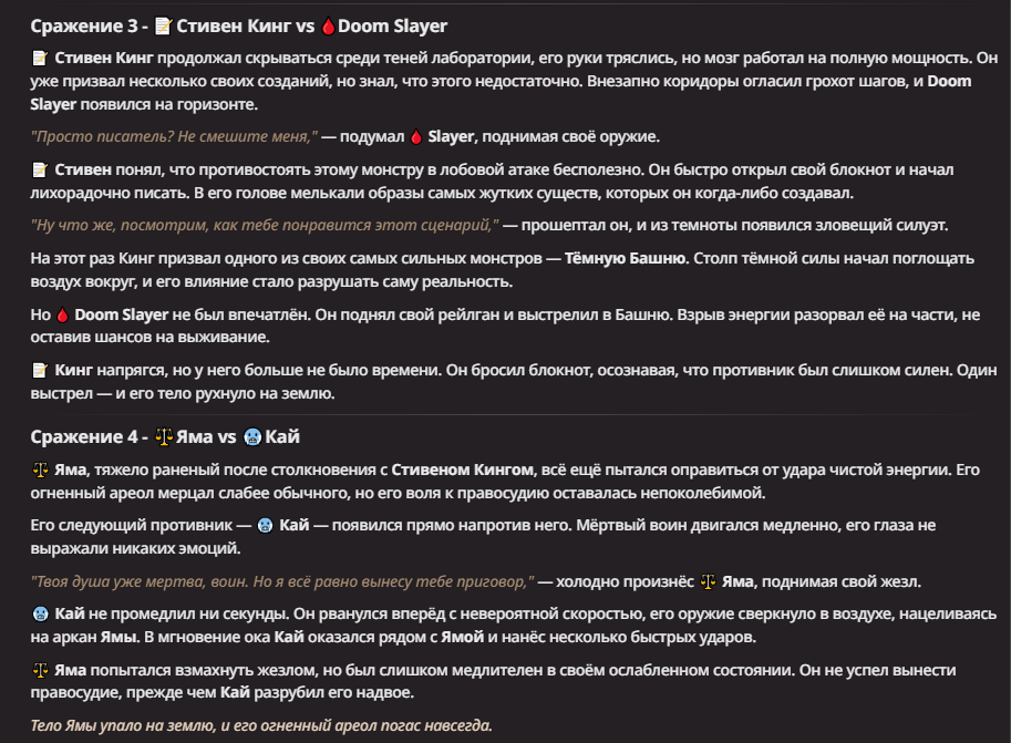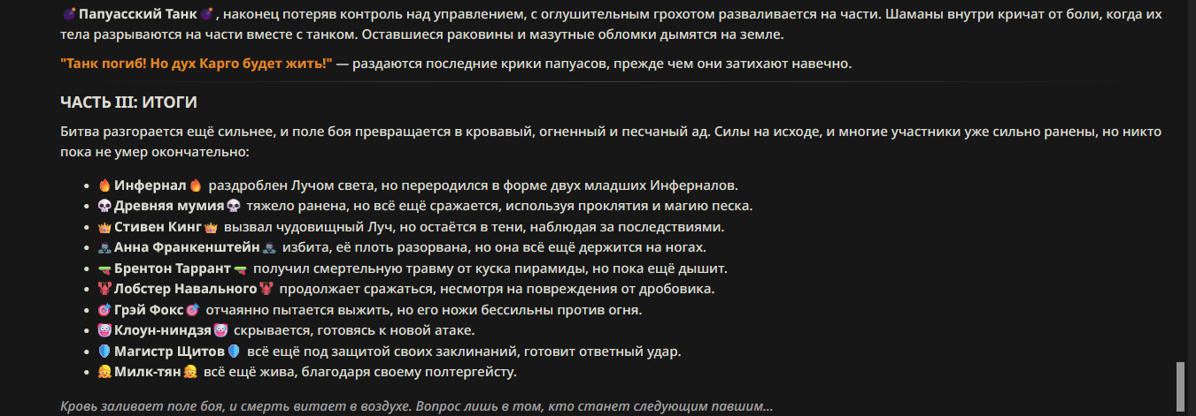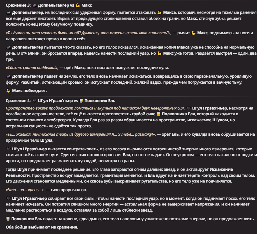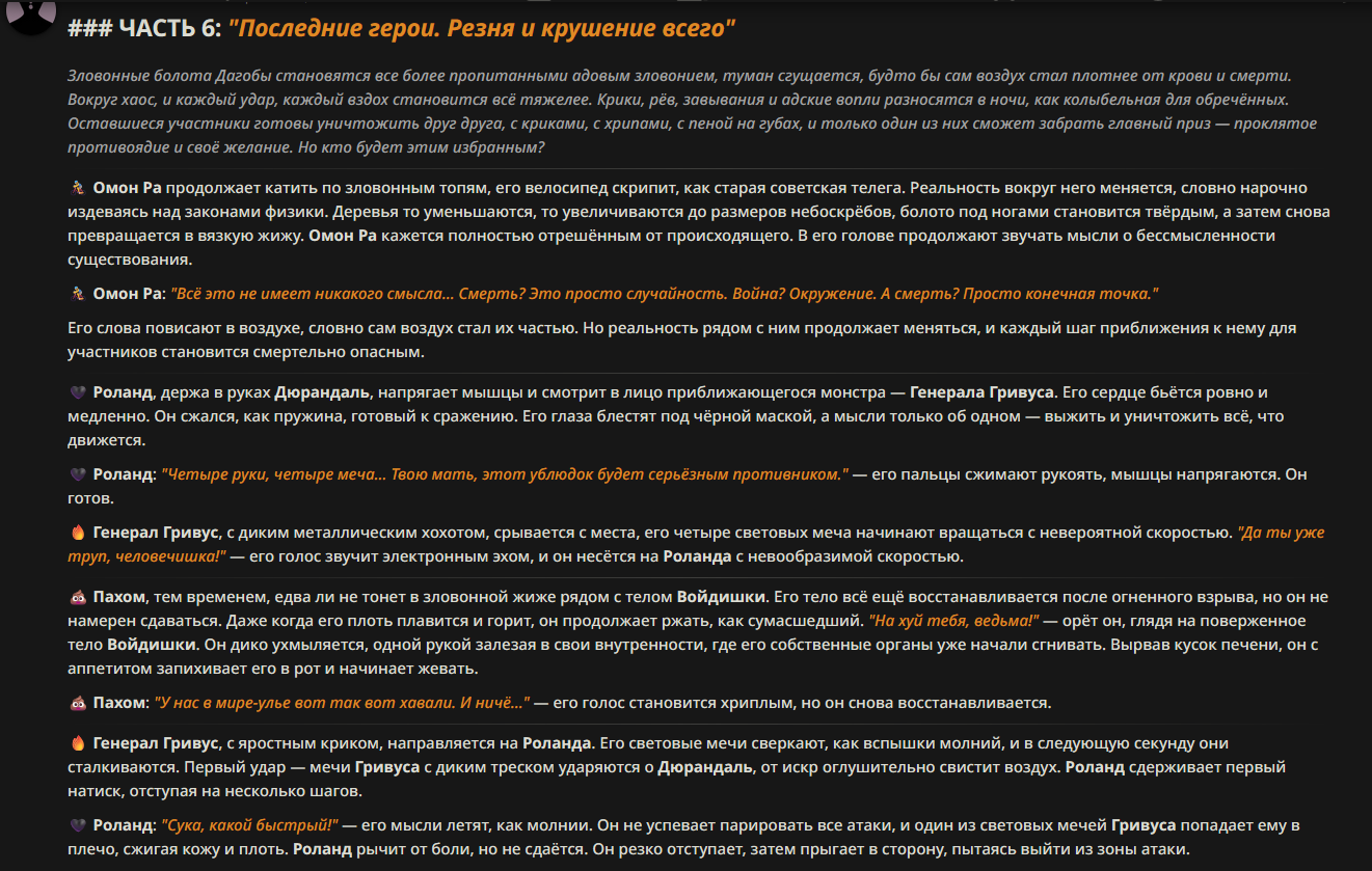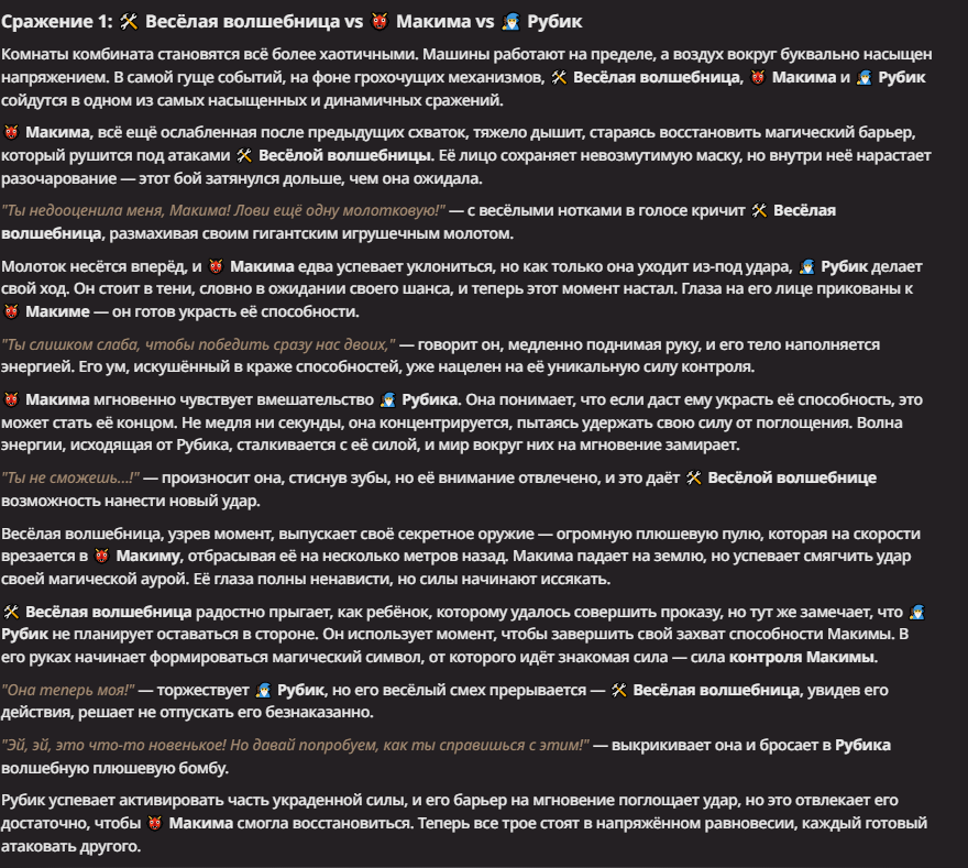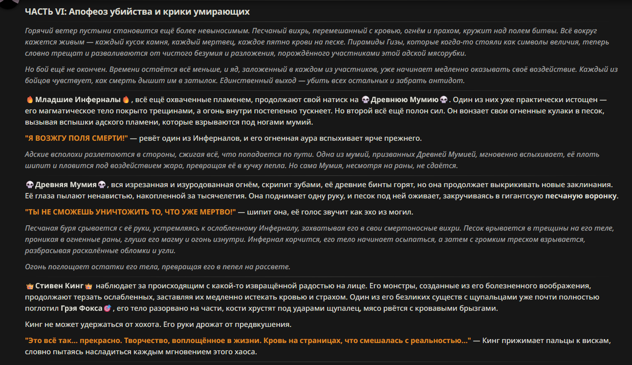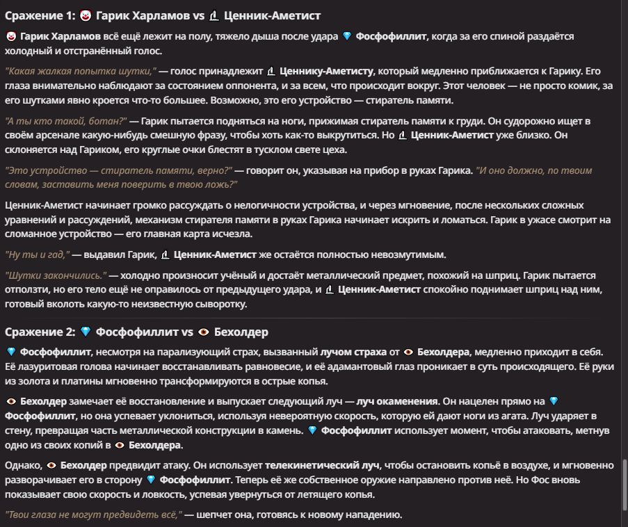 Промты скидывали в первом треде Обсуждения АИ Битв, я просто их скопировал и что-то по мелочи добавил, например строчку про допустимость NSFW и gore для Клода (ГПТ на неё ругается как будто).
