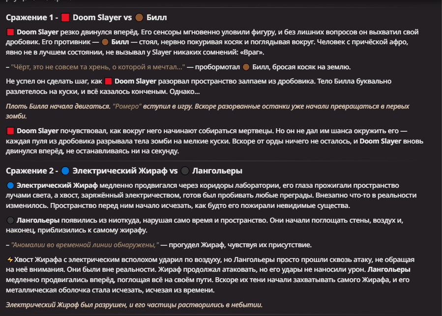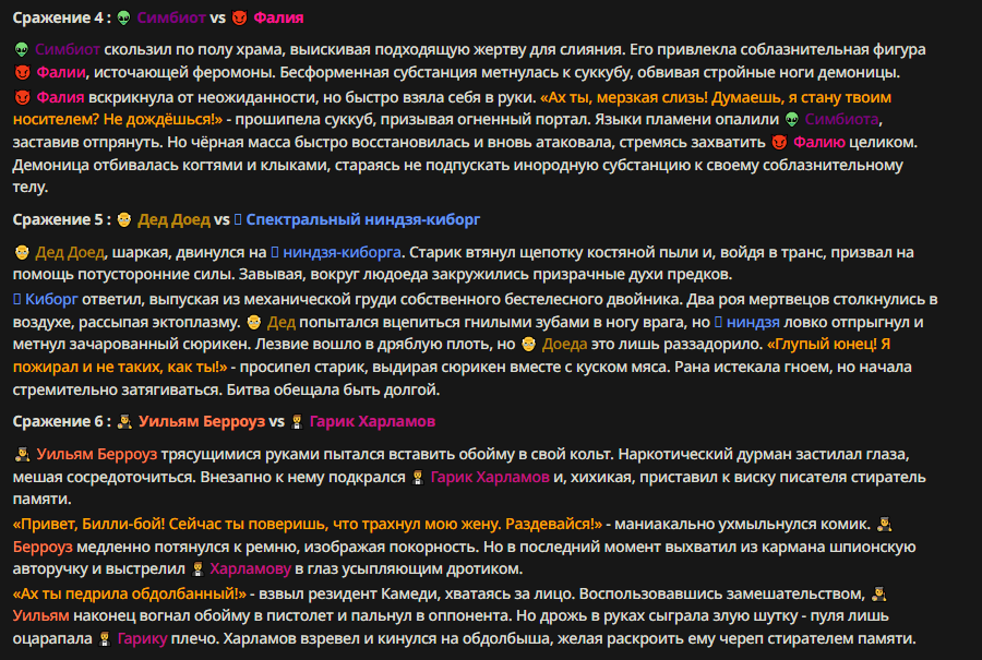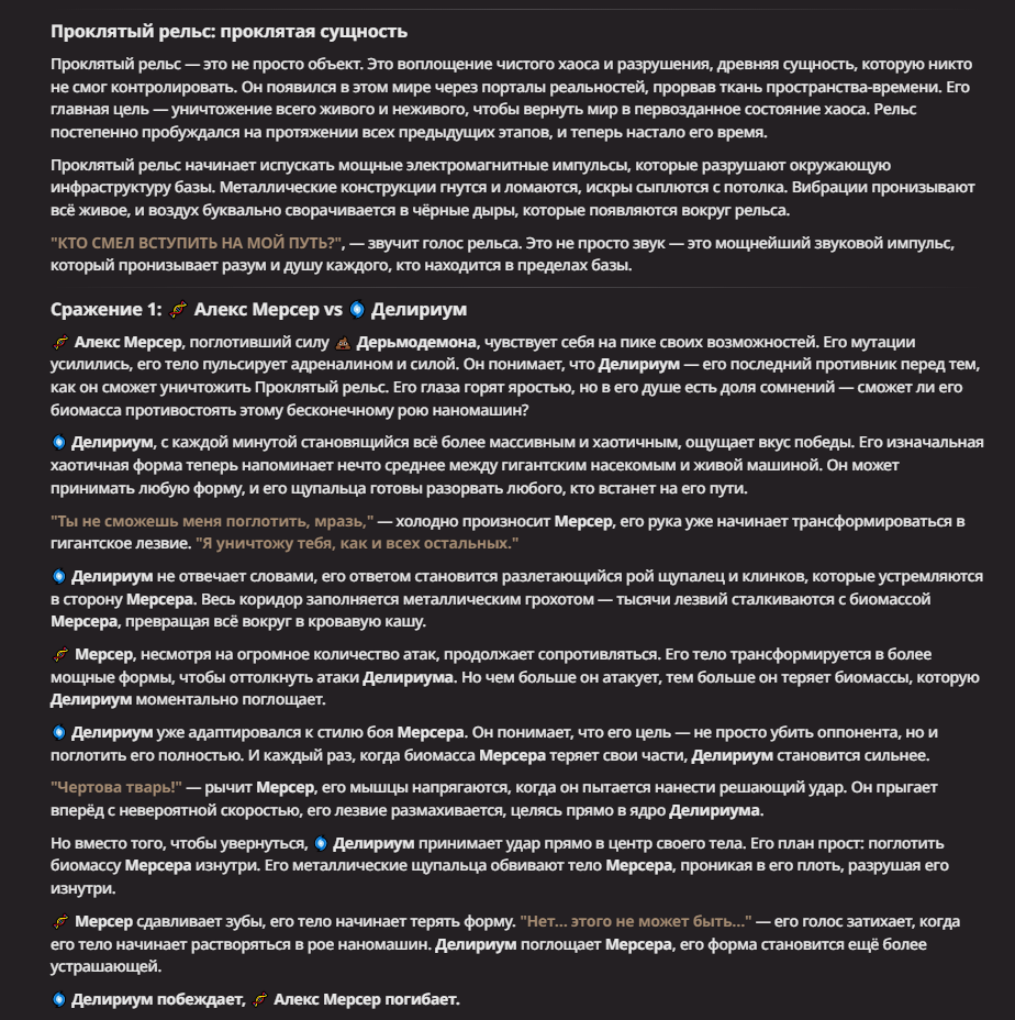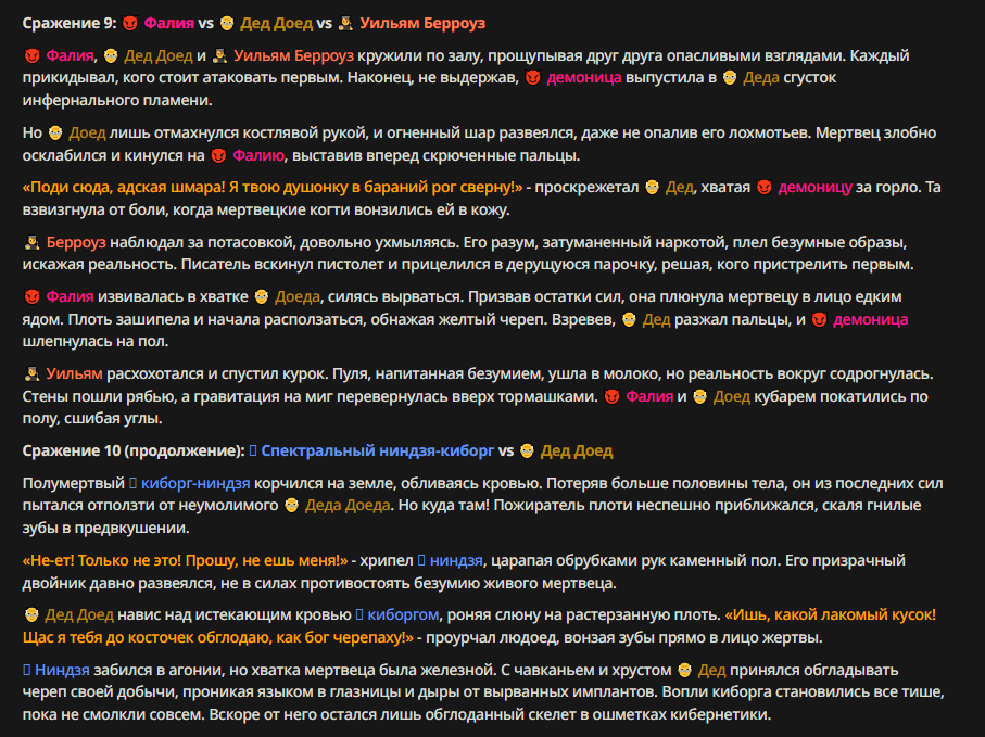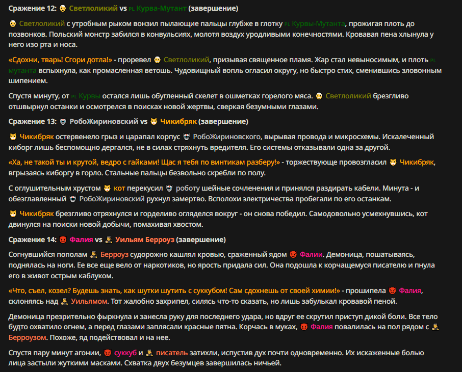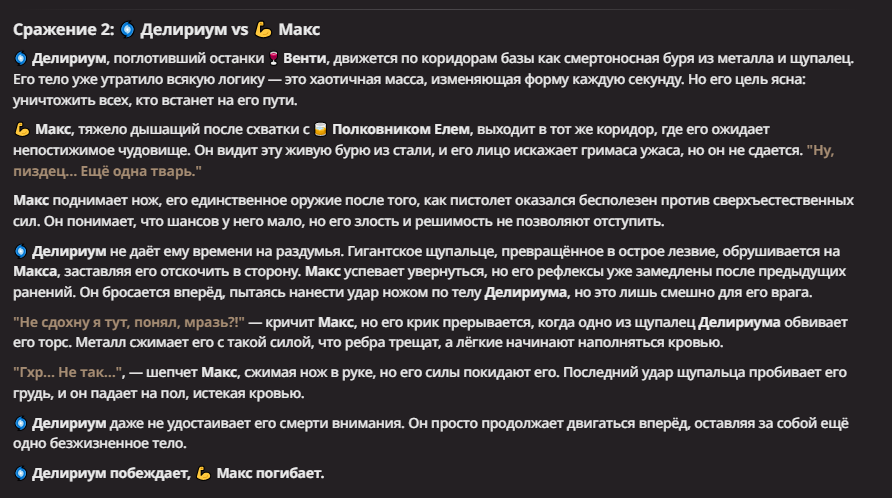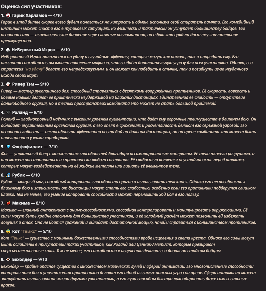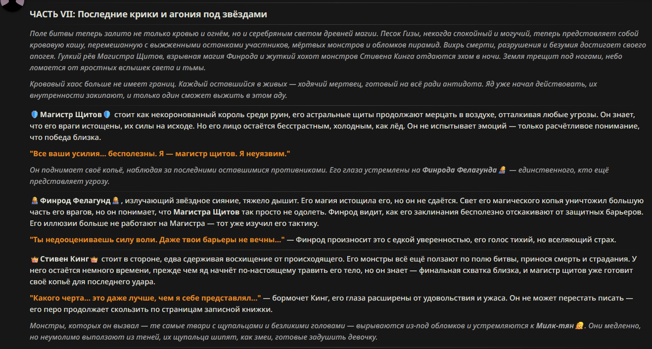 Промты скидывали в первом треде Обсуждения АИ Битв, я просто их скопировал и что-то по мелочи добавил, например строчку про допустимость NSFW и gore для Клода (ГПТ на неё ругается как будто).
