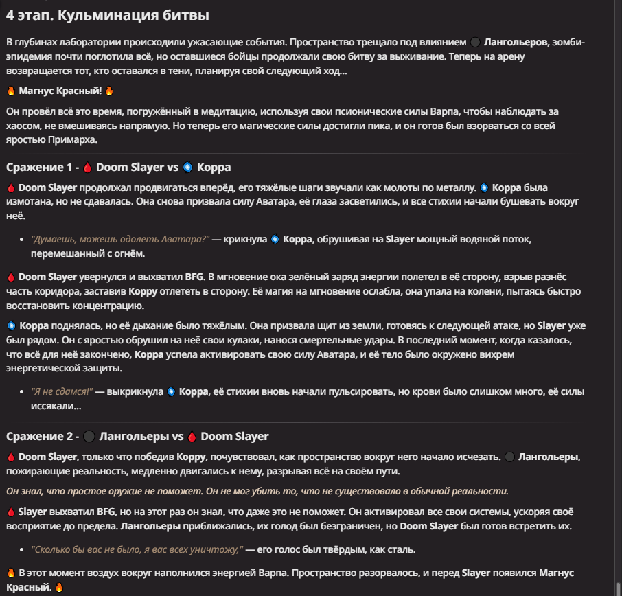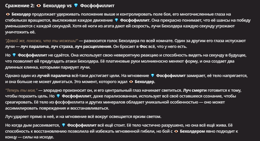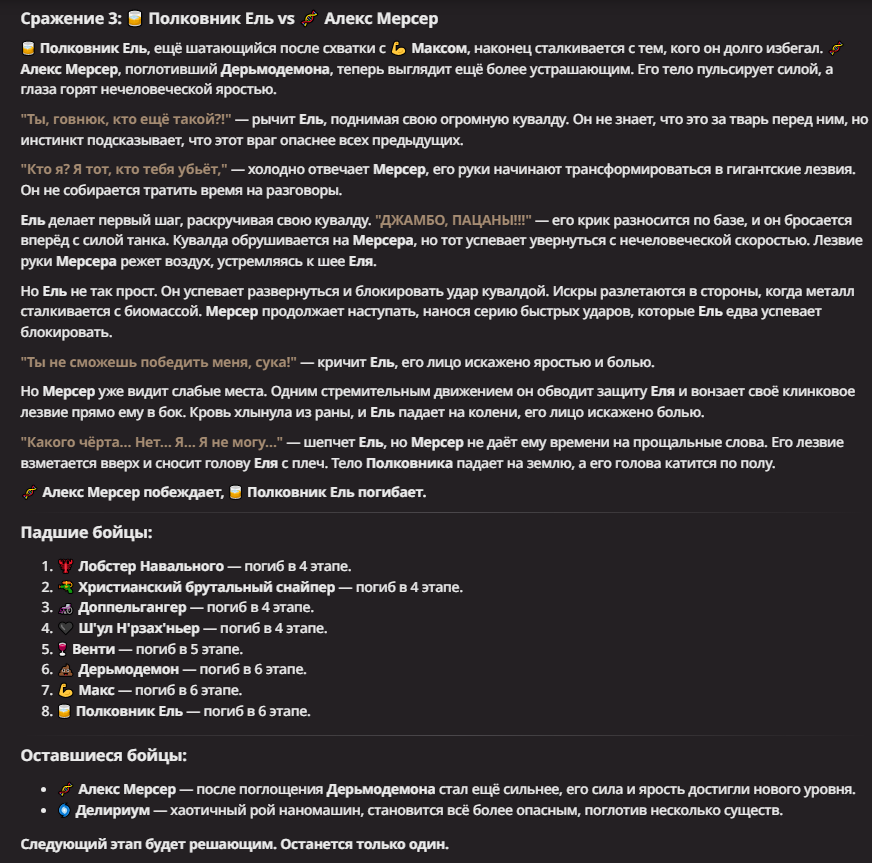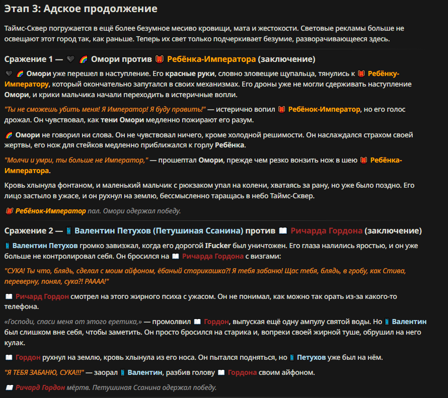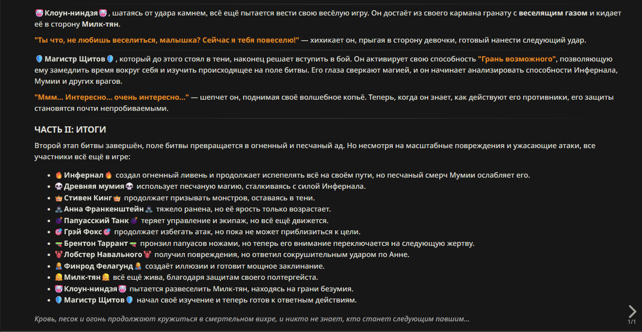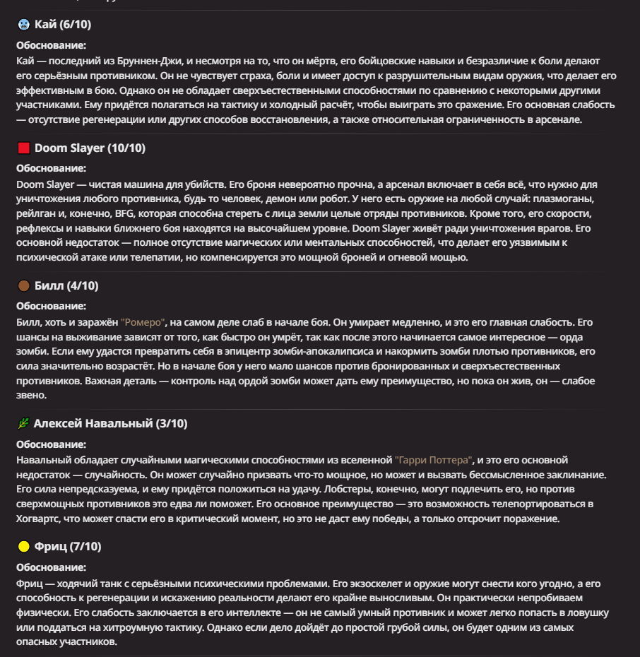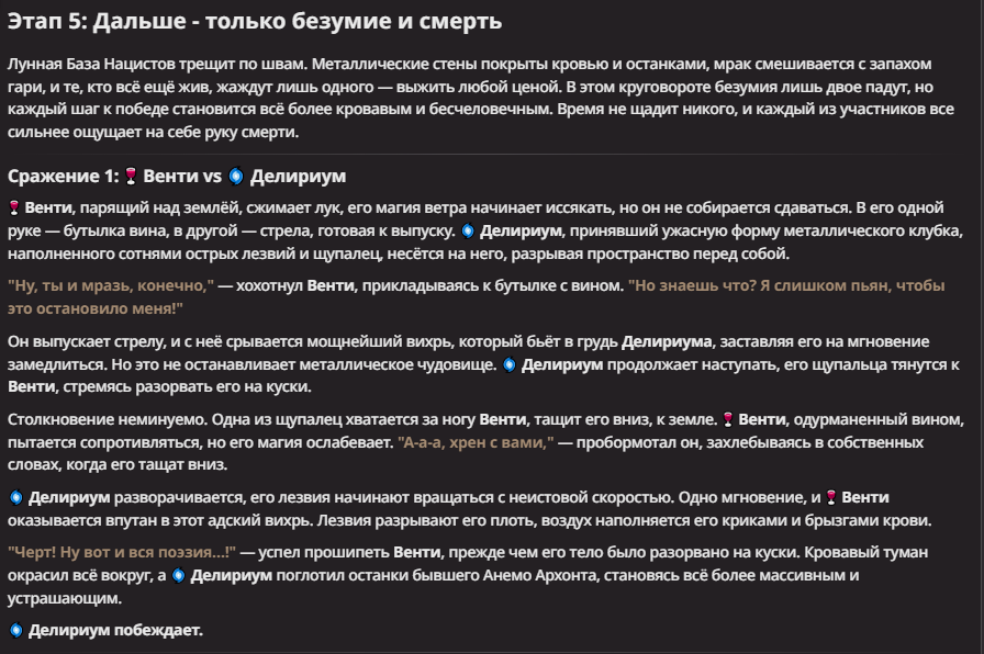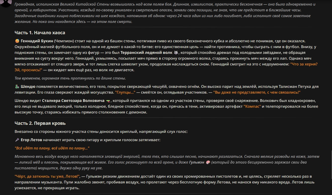 Промты скидывали в первом треде Обсуждения АИ Битв, я просто их скопировал и что-то по мелочи добавил, например строчку про допустимость NSFW и gore для Клода (ГПТ на неё ругается как будто).