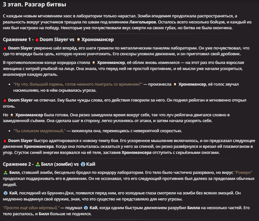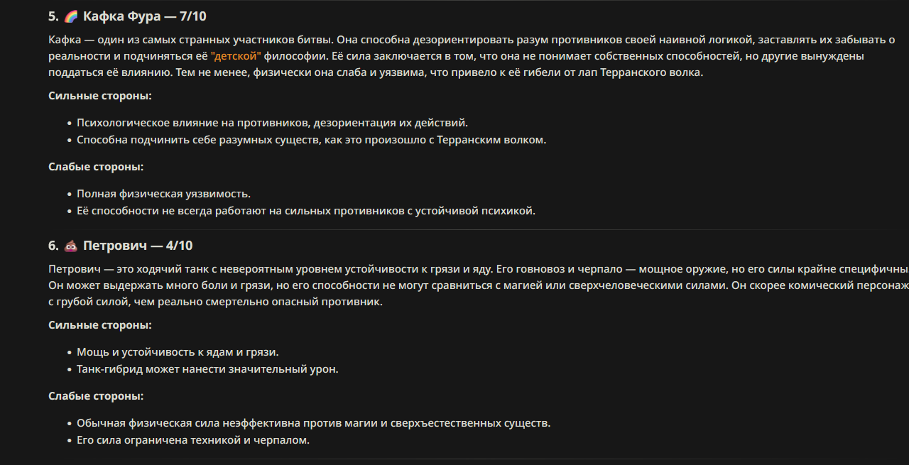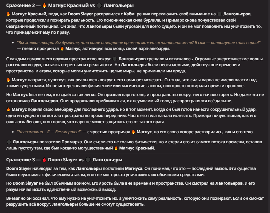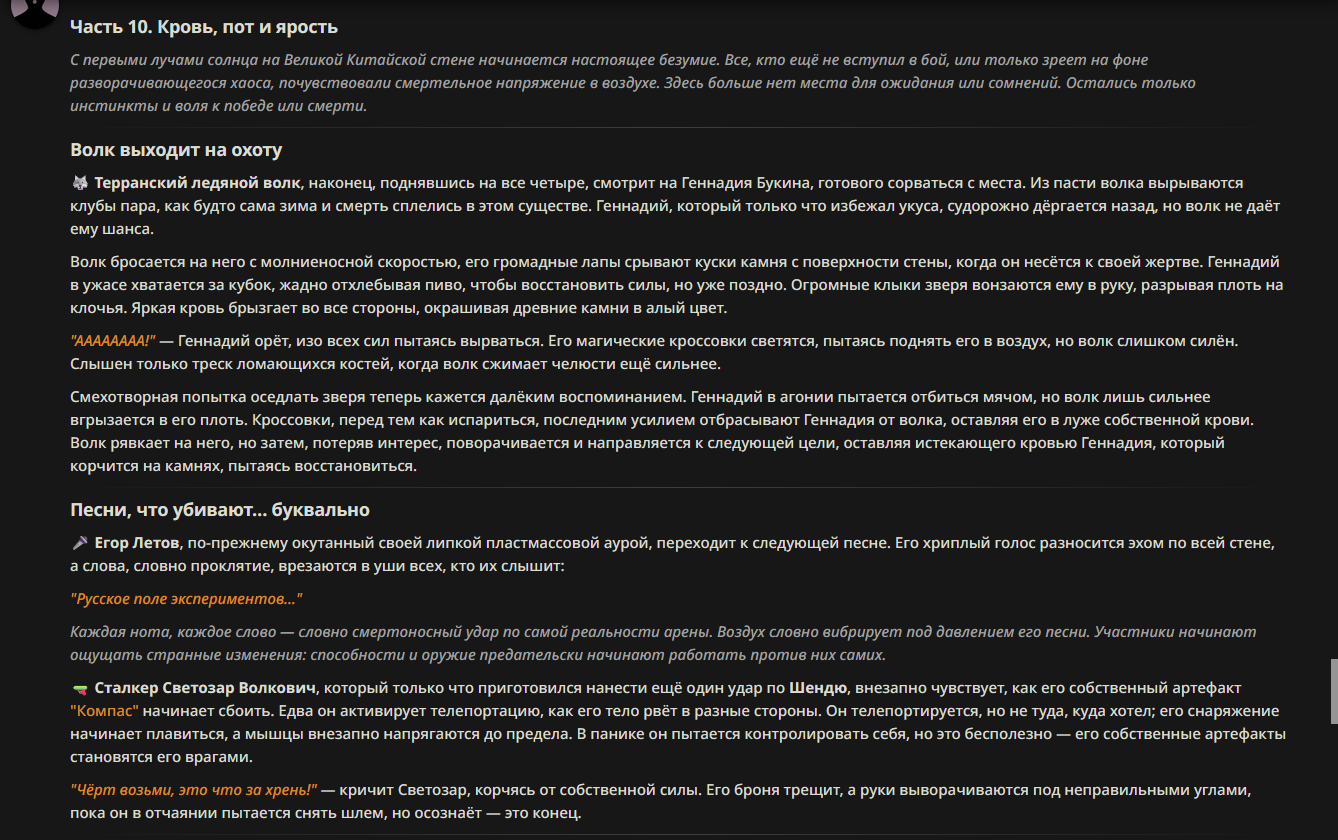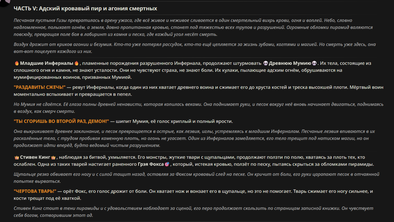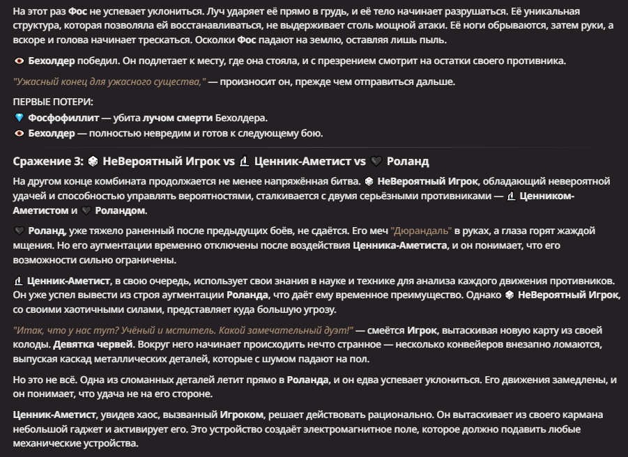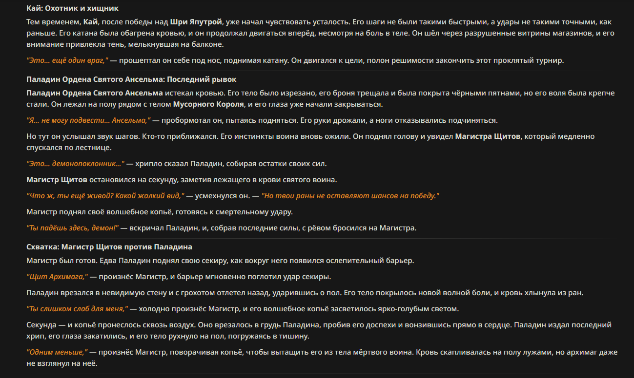 Промты скидывали в первом треде Обсуждения АИ Битв, я просто их скопировал и что-то по мелочи добавил, например строчку про допустимость NSFW и gore для Клода (ГПТ на неё ругается как будто).