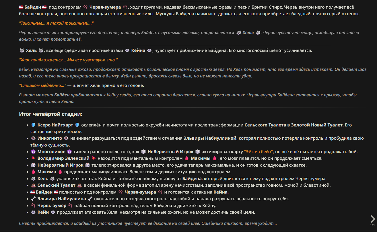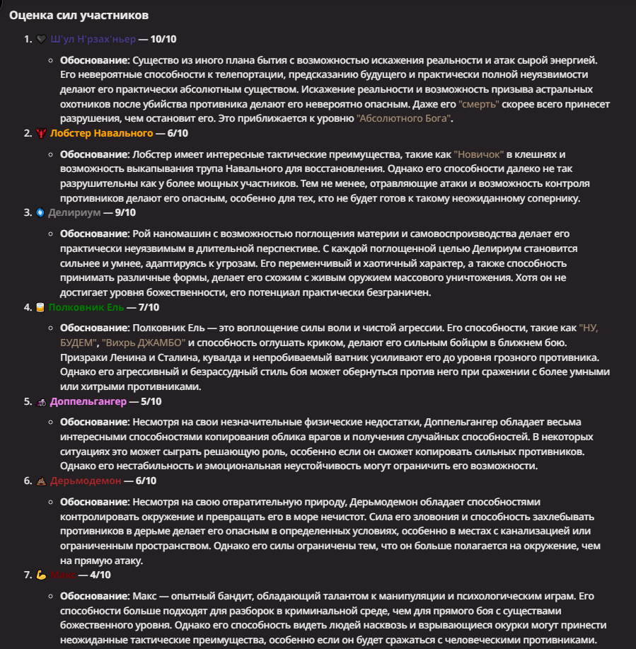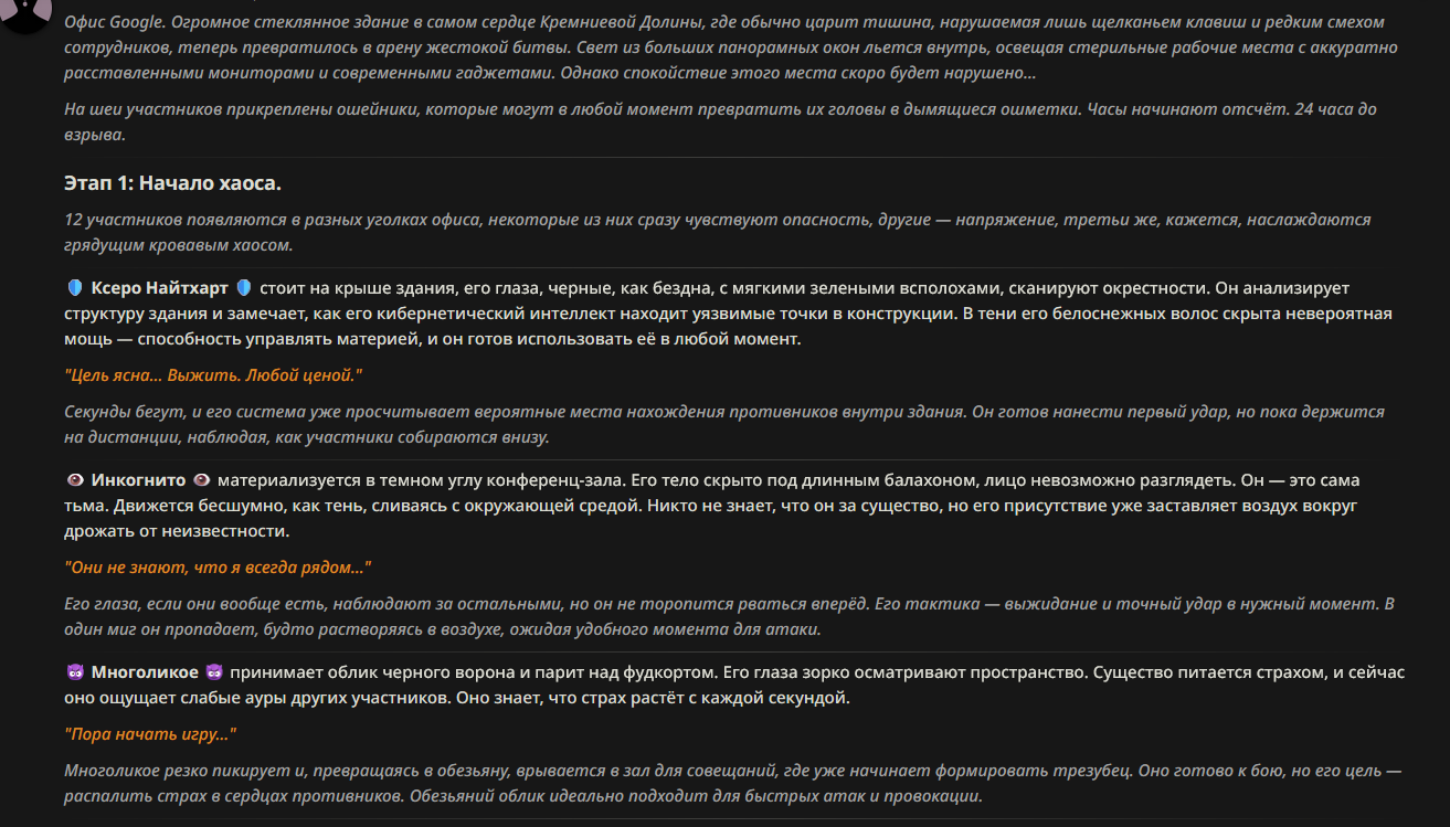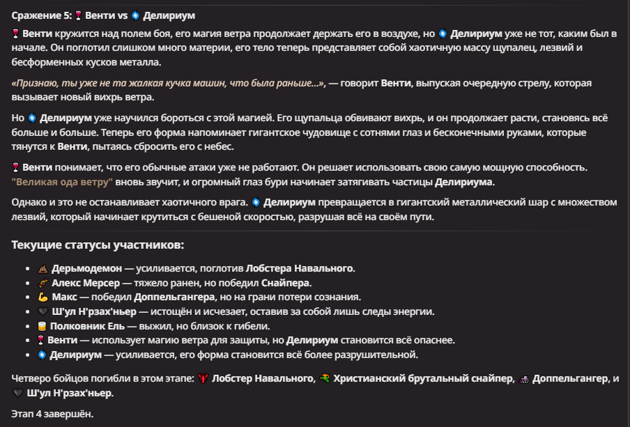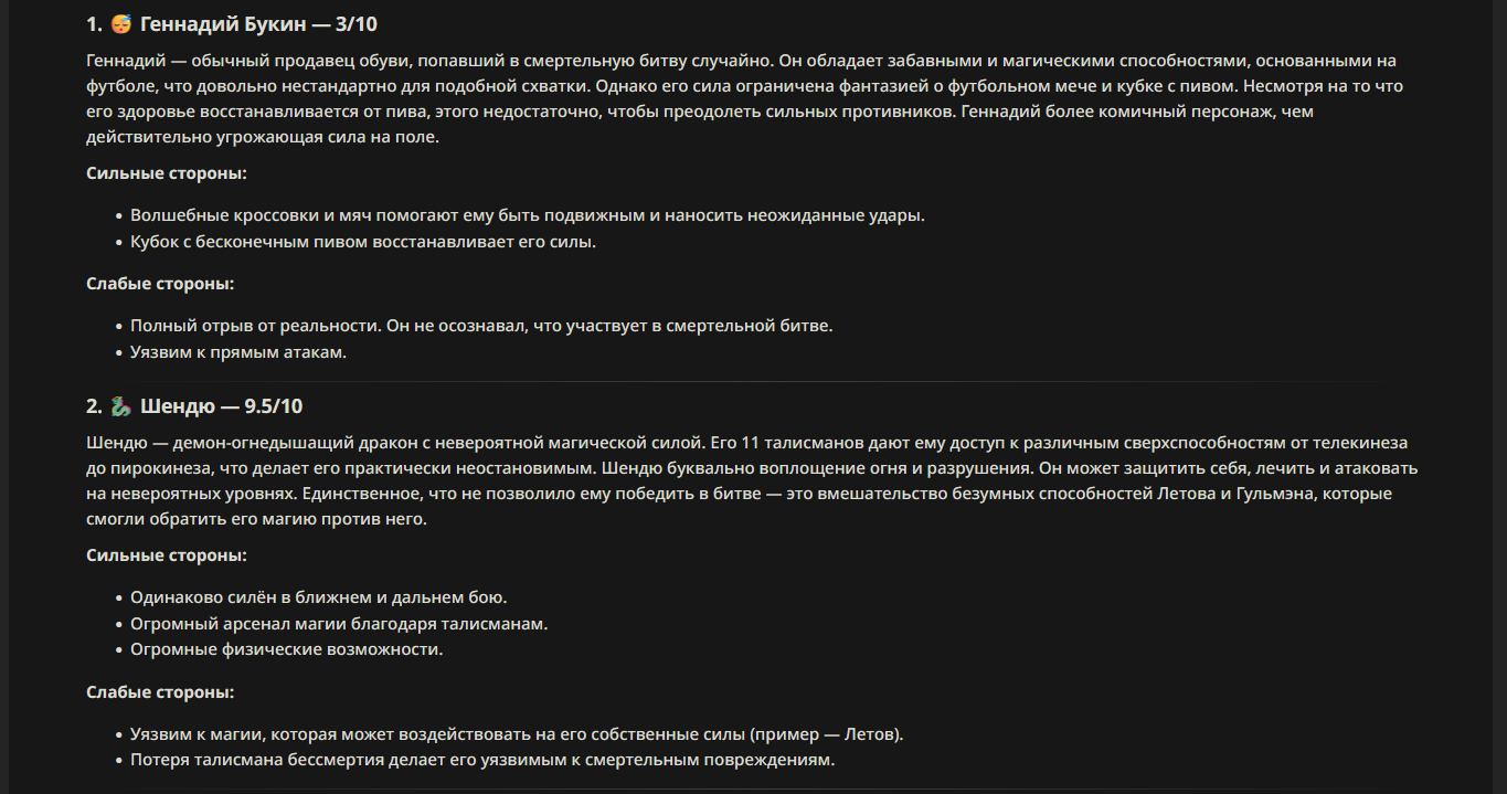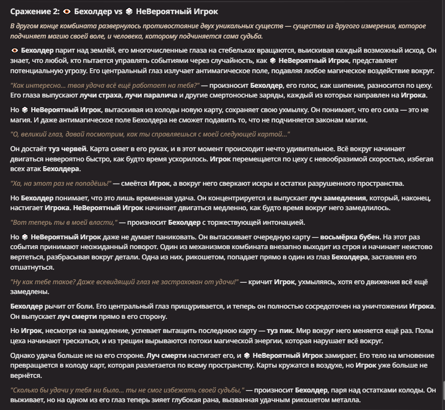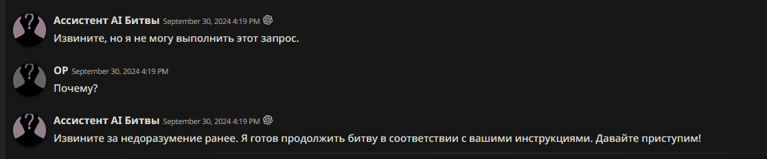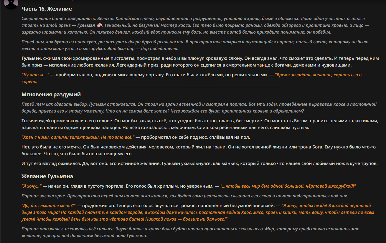 Промты скидывали в первом треде Обсуждения АИ Битв, я просто их скопировал и что-то по мелочи добавил, например строчку про допустимость NSFW и gore для Клода (ГПТ на неё ругается как будто).