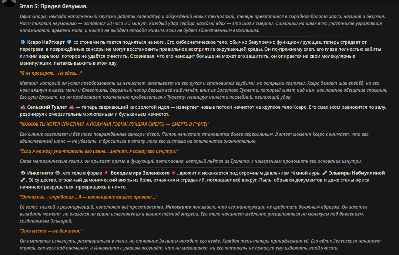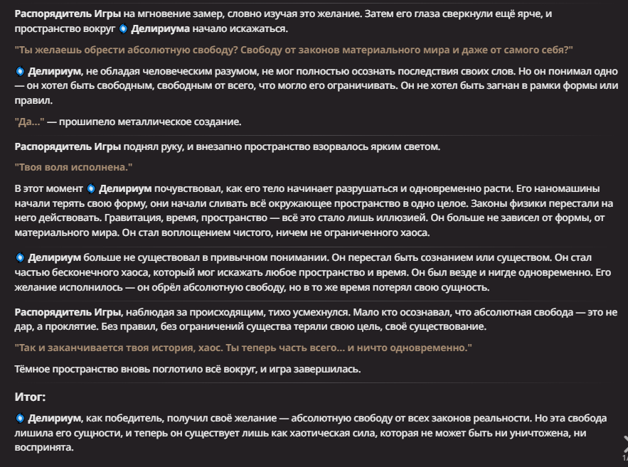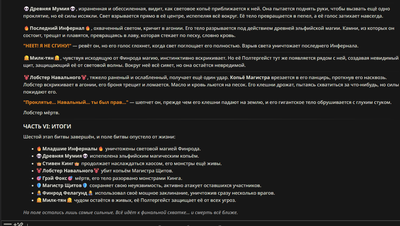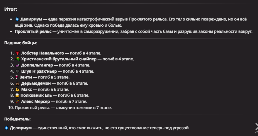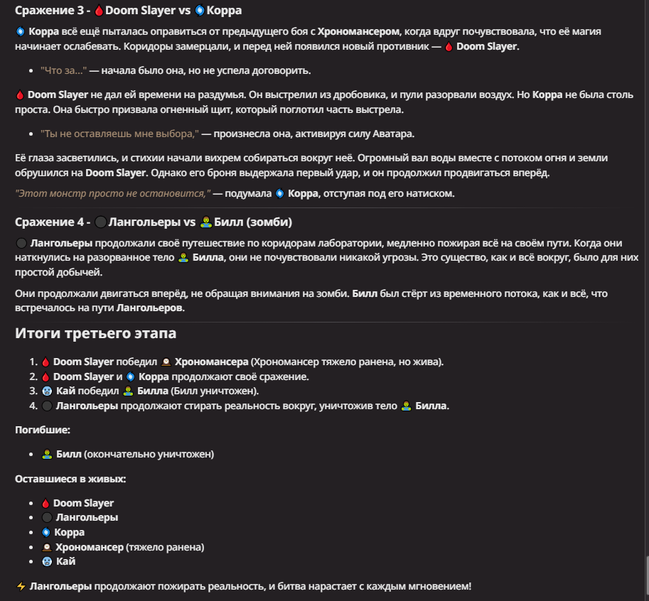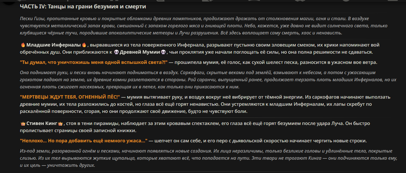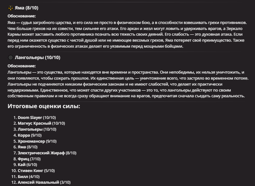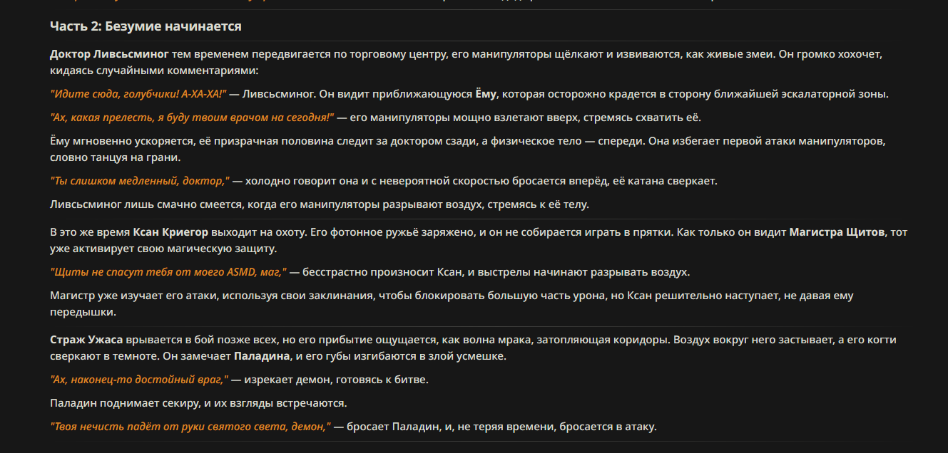 Промты скидывали в первом треде Обсуждения АИ Битв, я просто их скопировал и что-то по мелочи добавил, например строчку про допустимость NSFW и gore для Клода (ГПТ на неё ругается как будто).