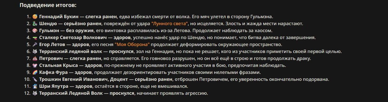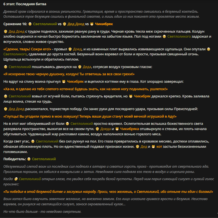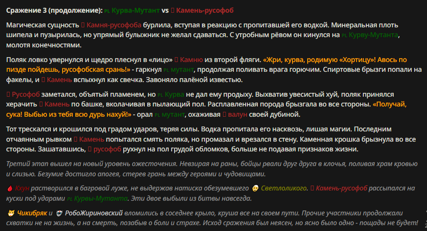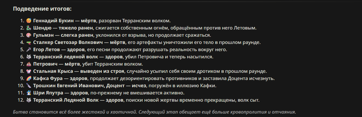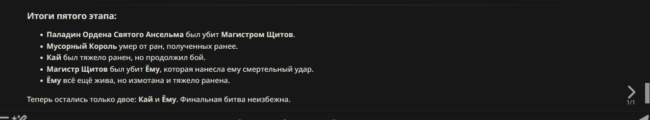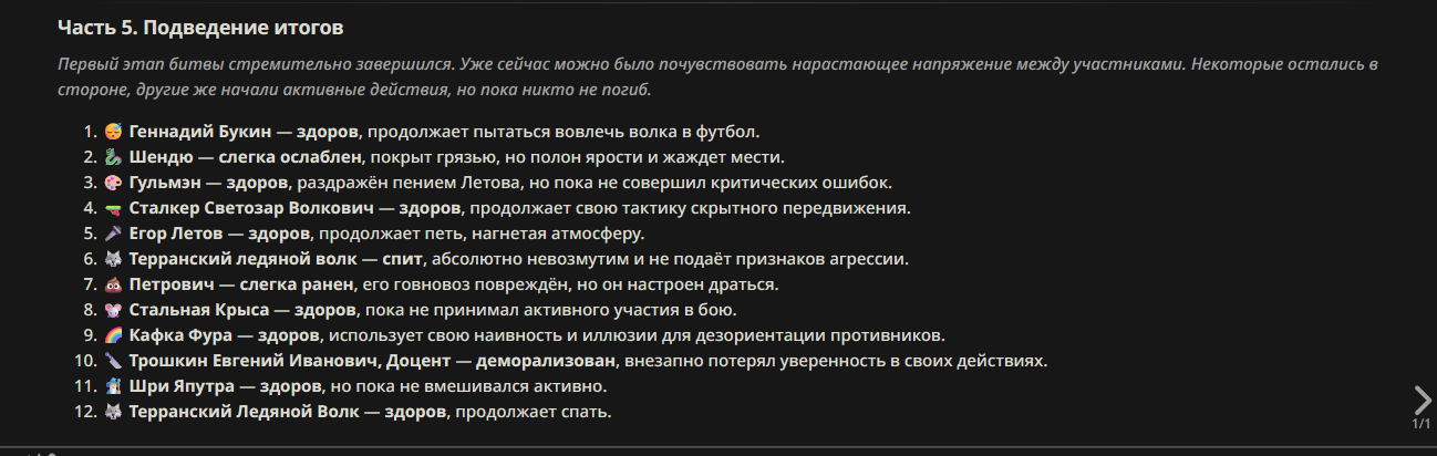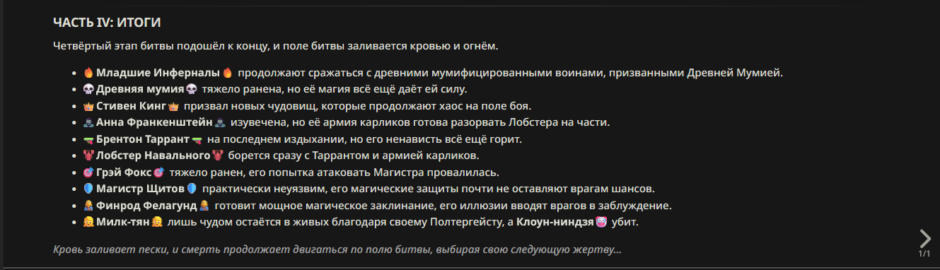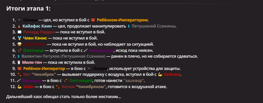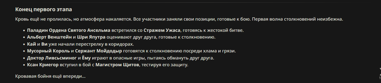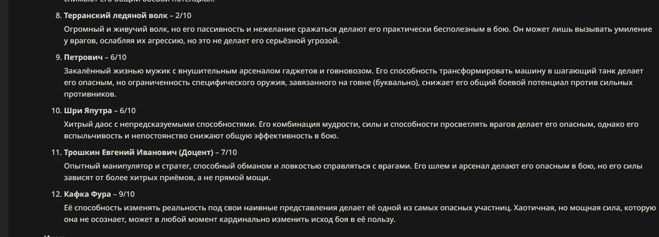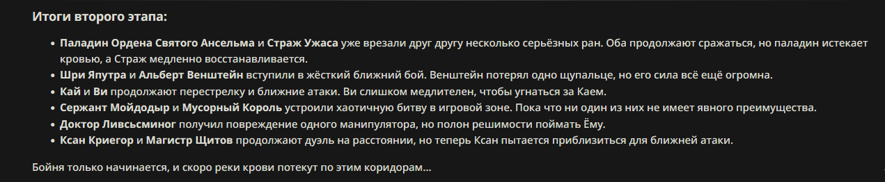 Правила(могут меняться в зависимости от ОПа): 1. Максимум в бою могут участвовать 12 персонажей. После этого набор закрывается и начинается битва. 2.Нельзя предлагать персонажей на около божественном уровне силы. 3.Персонажи с напарниками НЕ запрещены В РАЗУМНЫХ ПРЕДЕЛАХ, с соблюдением баланса сил. Никаких легионов космодесанта. Upd. Уточняйте у текущего ОПа. 4.После участия в бою персонаж уходит на перерыв в 3 боя(сделано для защиты от спамеров одного персонажа). 5.Нельзя предлагать персонажей которые могут призывать других существ без каких-либо условий. Пример: Маг который призывает демонов по щелчку пальцев == не допускается. Маг которому нужны трупы или какой-то длительный ритуал с условиями для призыва демона == допускается. 6.После использования локации она выбивается из случайного списка на 9 боёв.(Почему так много? Ради разнообразия.) Более подробное описание боя вы можете прочитать на втором пике. Upd. Формат может меняться в зависимости от ОПа 7.Набор персонажей полностью закрывается после начала боя и открывается только когда он закончится. 8. Ведущий оставляет за собой право не принять вашего персонажа. Будьте корректны - в случае, если такое произошло, вежливо спросите причину и/или дождитесь другого ведущего.