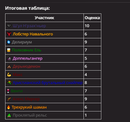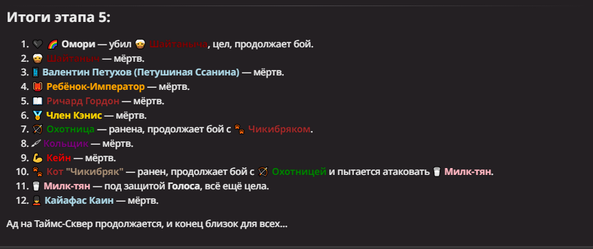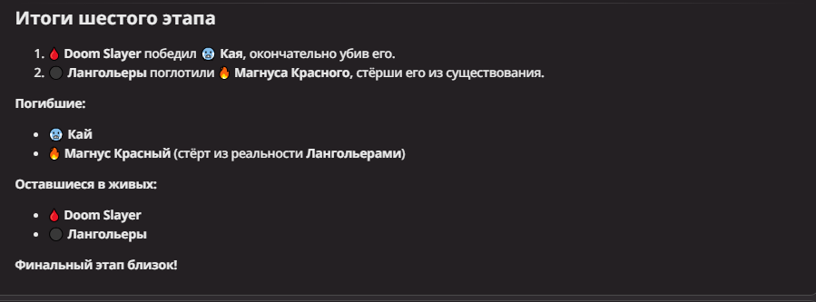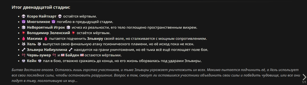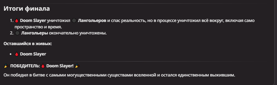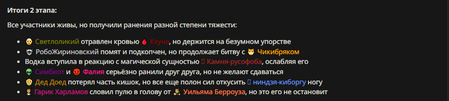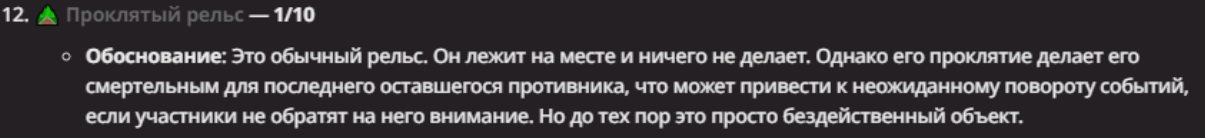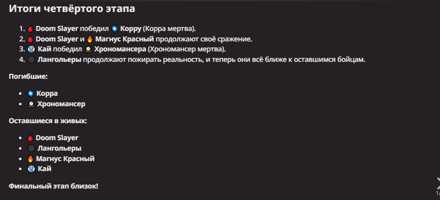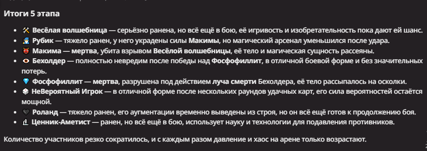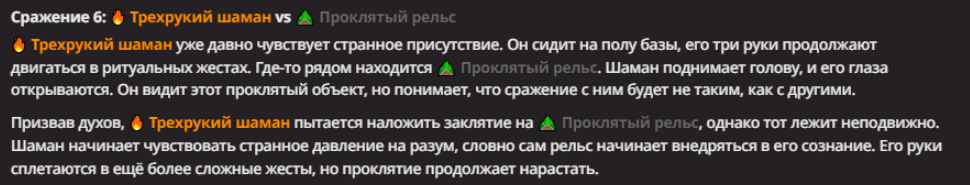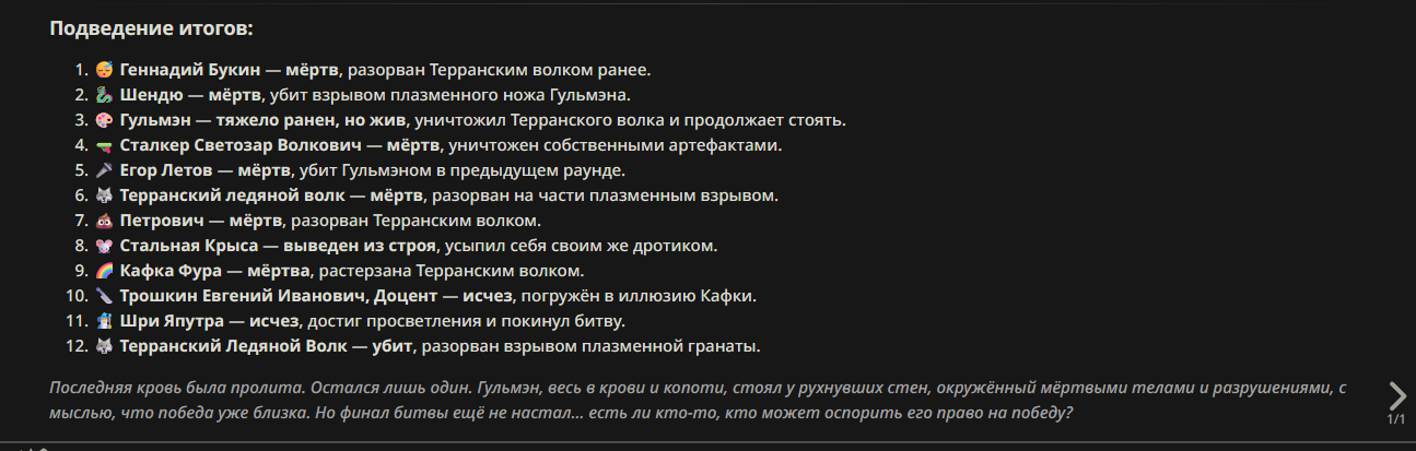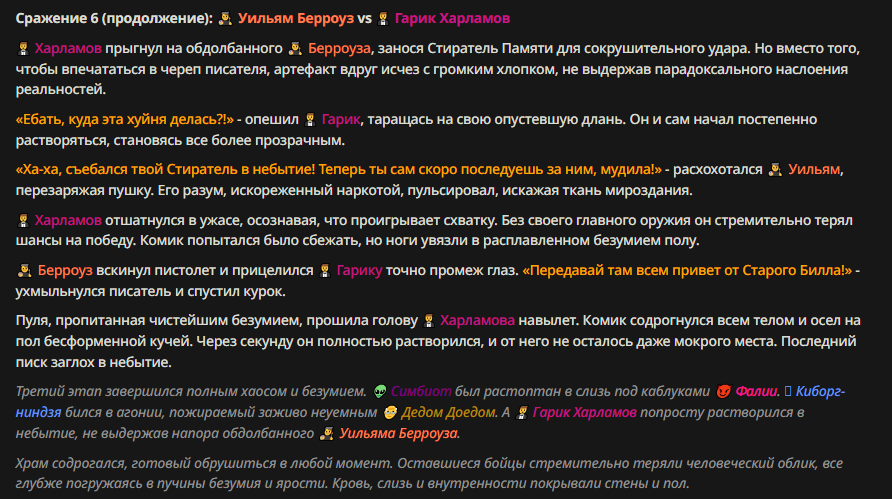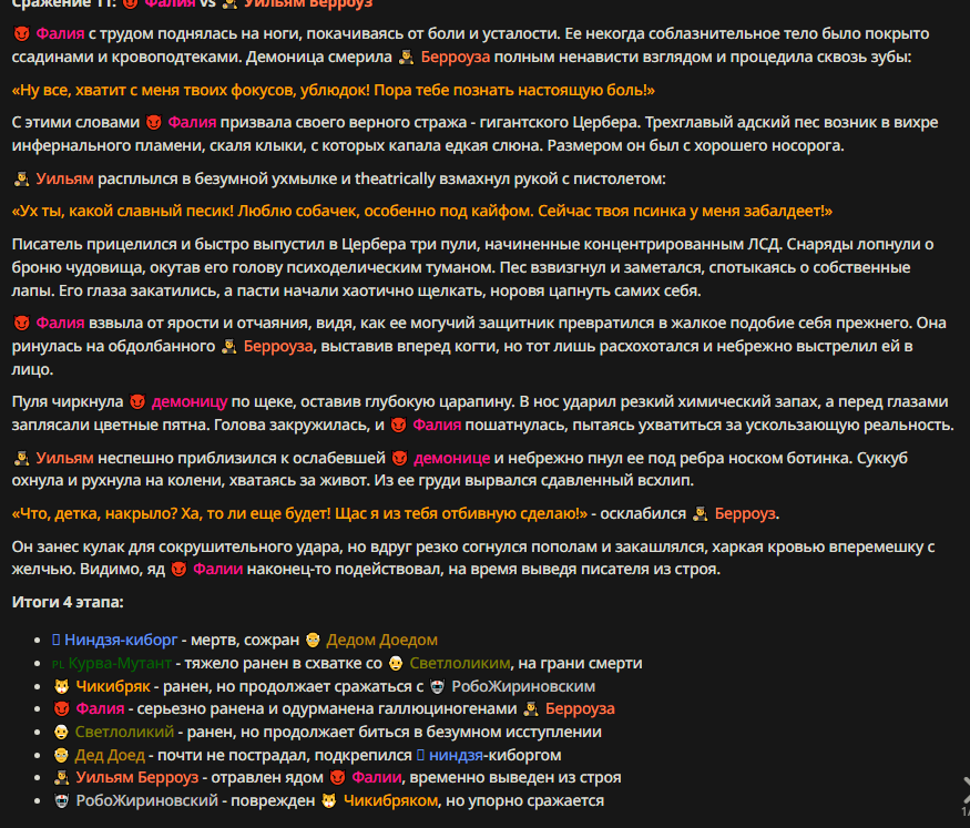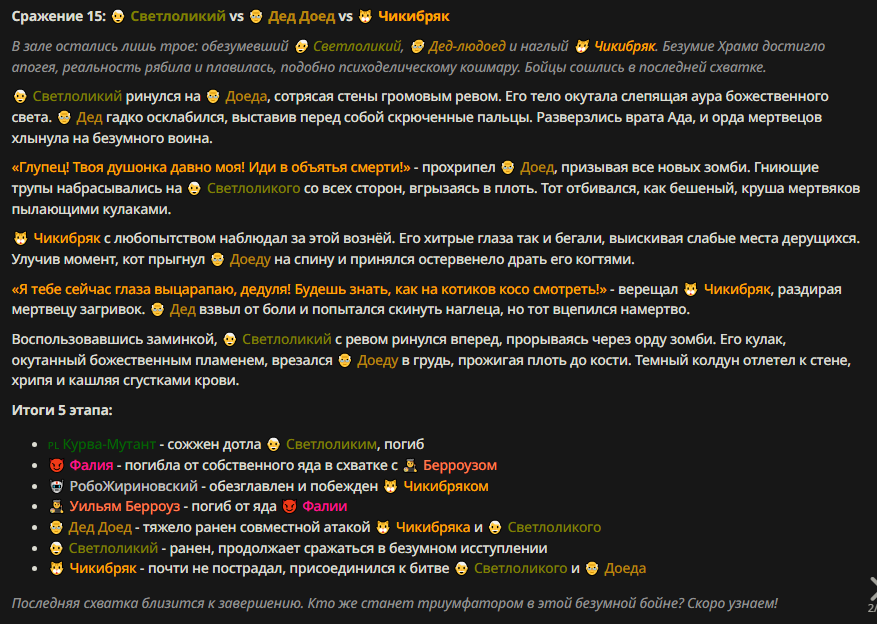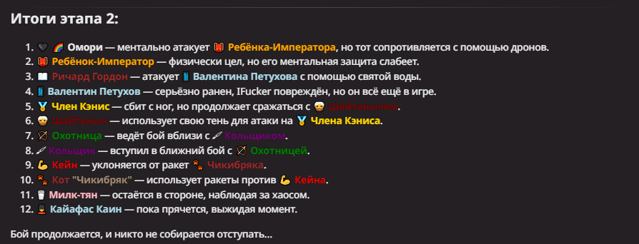 Правила(могут меняться в зависимости от ОПа): 1. Максимум в бою могут участвовать 12 персонажей. После этого набор закрывается и начинается битва. 2.Нельзя предлагать персонажей на около божественном уровне силы. 3.Персонажи с напарниками НЕ запрещены В РАЗУМНЫХ ПРЕДЕЛАХ, с соблюдением баланса сил. Никаких легионов космодесанта. Upd. Уточняйте у текущего ОПа. 4.После участия в бою персонаж уходит на перерыв в 3 боя(сделано для защиты от спамеров одного персонажа). 5.Нельзя предлагать персонажей которые могут призывать других существ без каких-либо условий. Пример: Маг который призывает демонов по щелчку пальцев == не допускается. Маг которому нужны трупы или какой-то длительный ритуал с условиями для призыва демона == допускается. 6.После использования локации она выбивается из случайного списка на 9 боёв.(Почему так много? Ради разнообразия.) Более подробное описание боя вы можете прочитать на втором пике. Upd. Формат может меняться в зависимости от ОПа 7.Набор персонажей полностью закрывается после начала боя и открывается только когда он закончится. 8. Ведущий оставляет за собой право не принять вашего персонажа. Будьте корректны - в случае, если такое произошло, вежливо спросите причину и/или дождитесь другого ведущего.