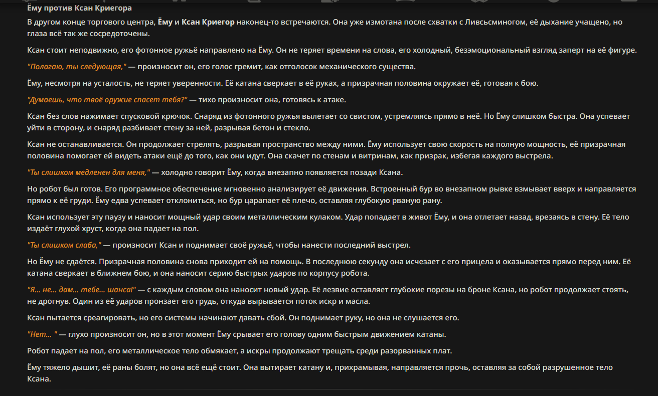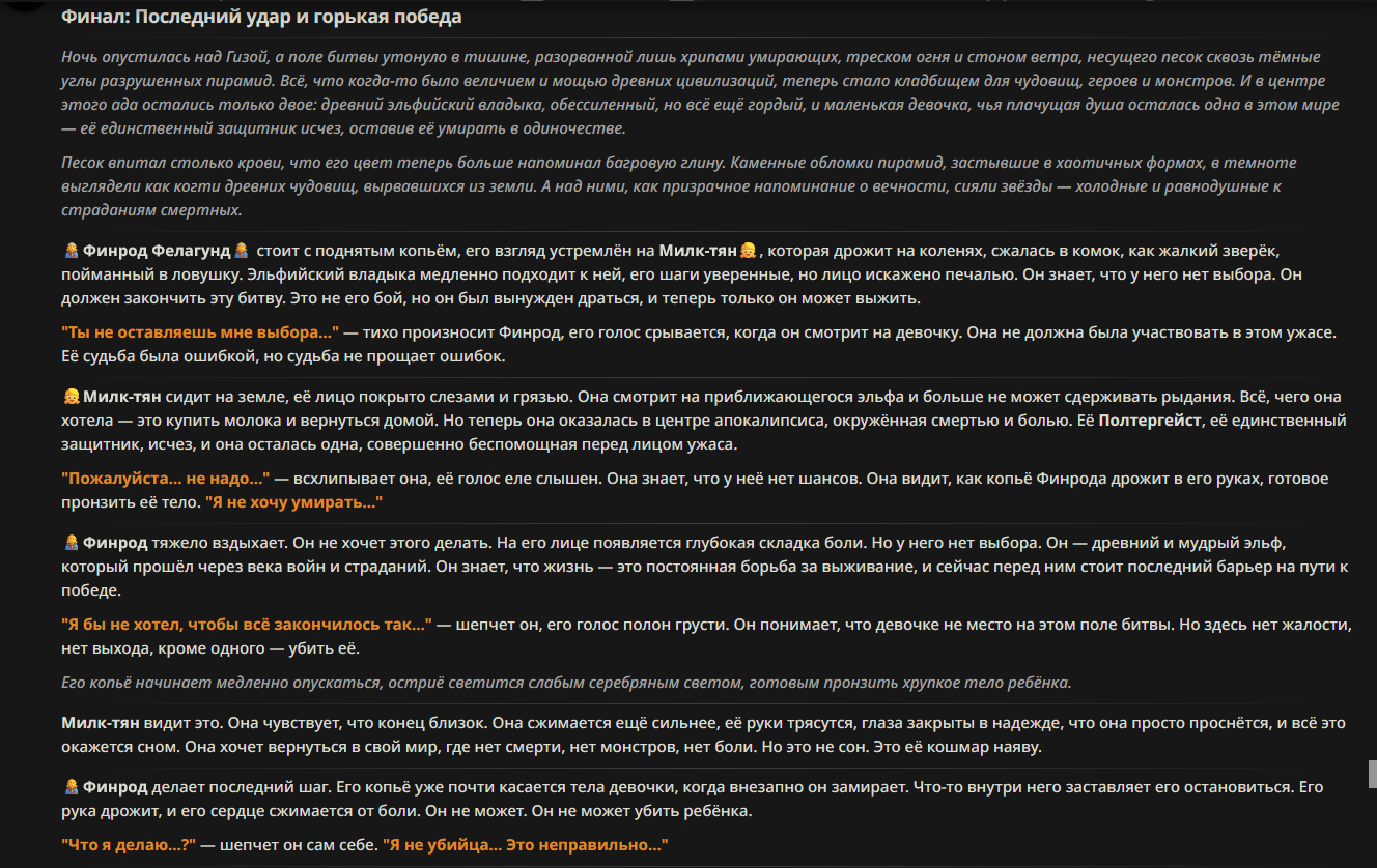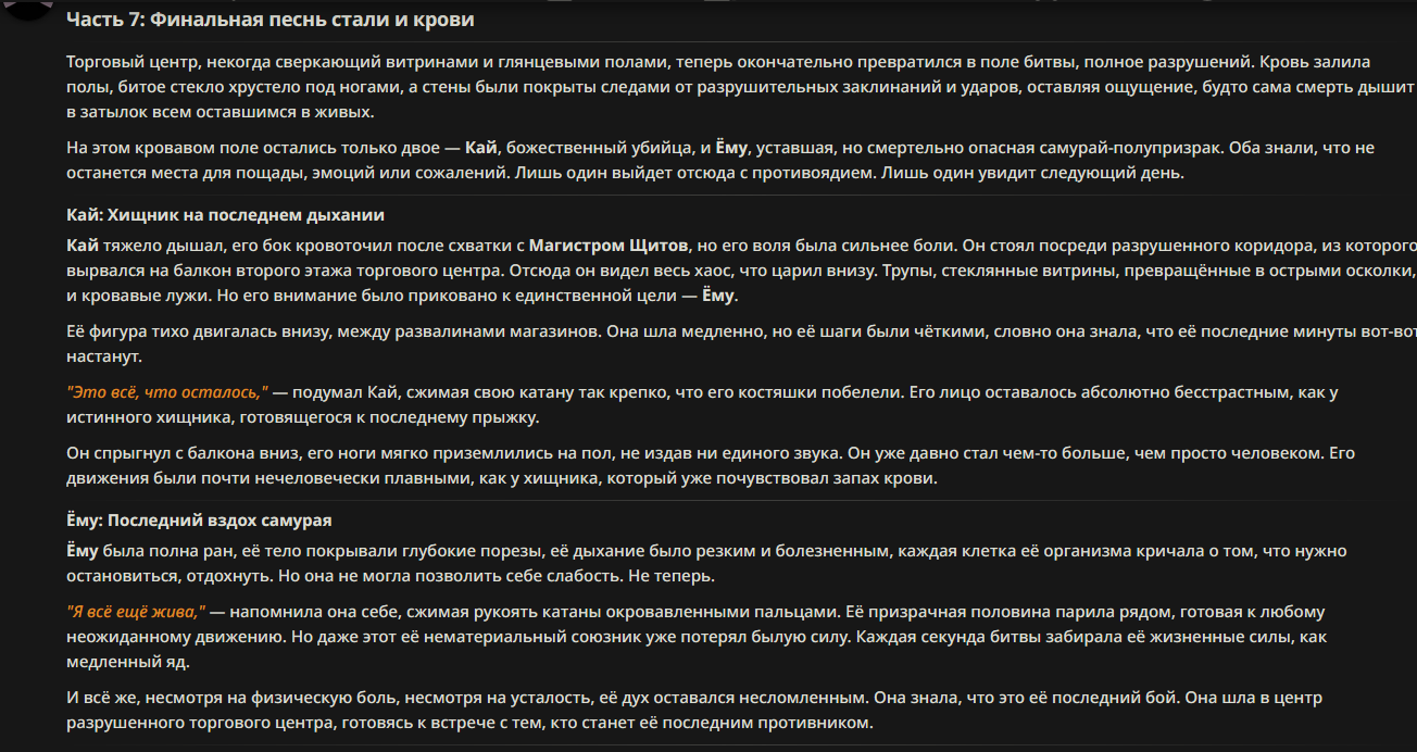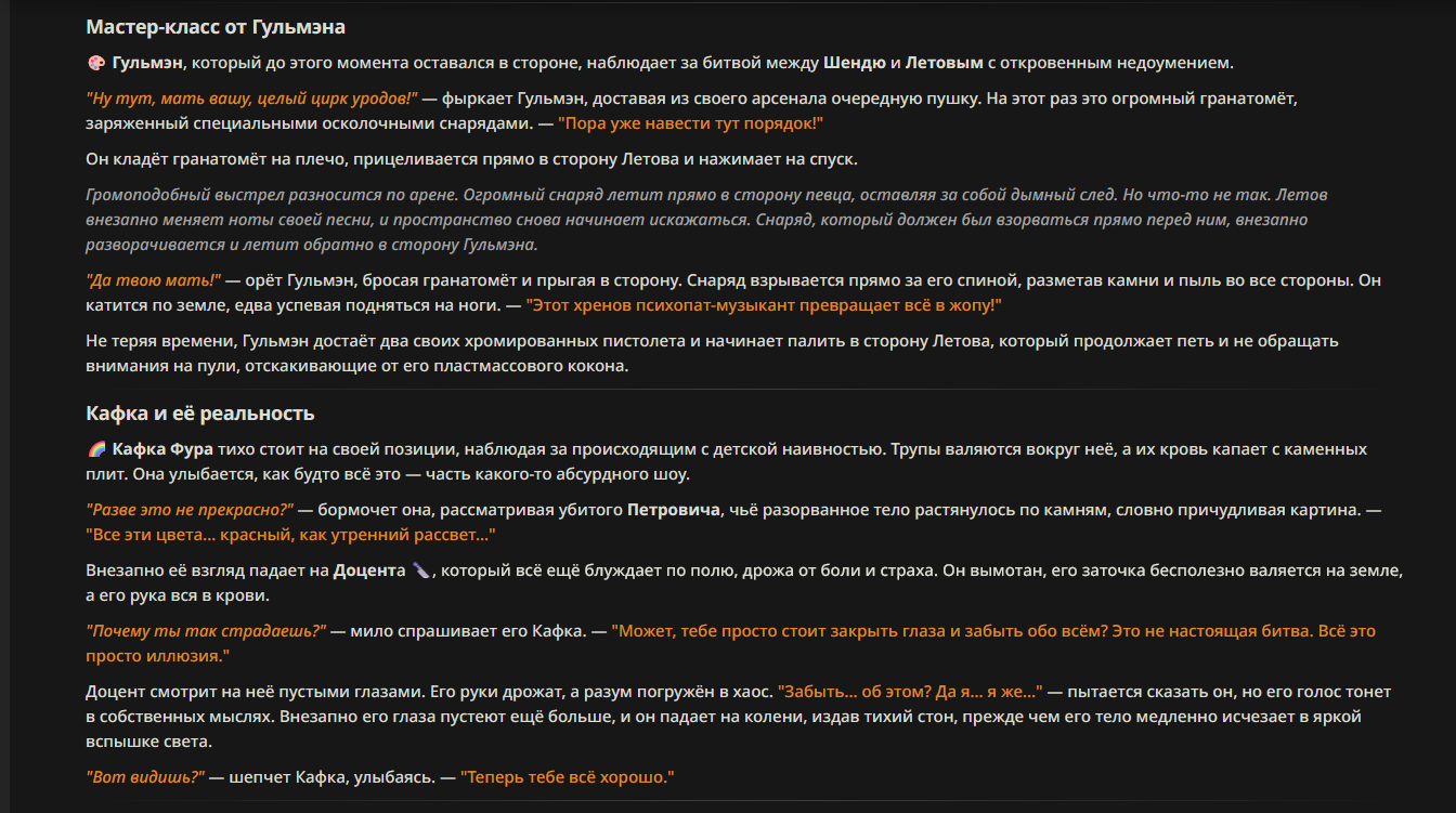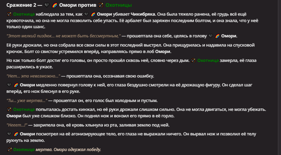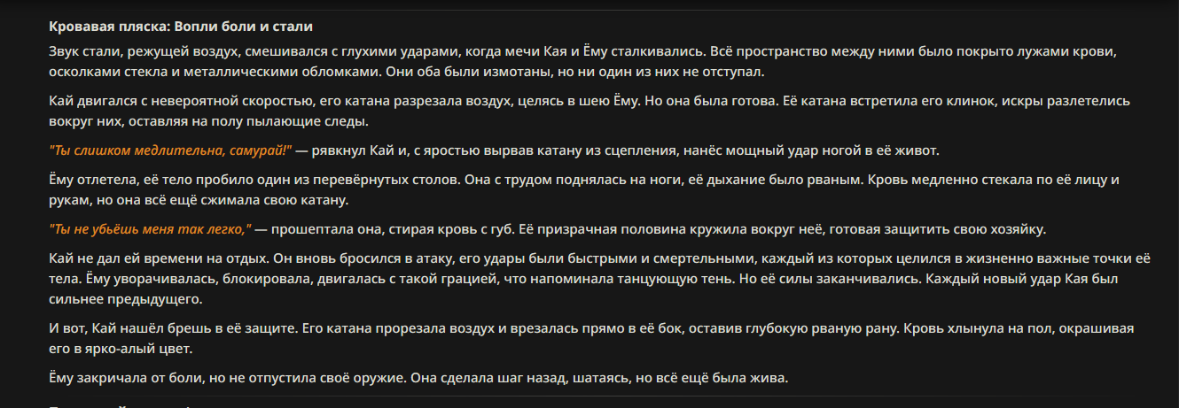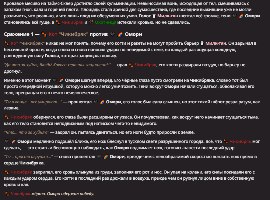 >>1544267 Так понимаю, зарЭзана Фурриозычем за кадром. Ранена же была. А вообще, это ж Гопота. То ли мною написанный для клопа, кстати, а не для неё! промпт так влияет, но почему-то она обрывает бои между персонажами и это легко случайно проебать.