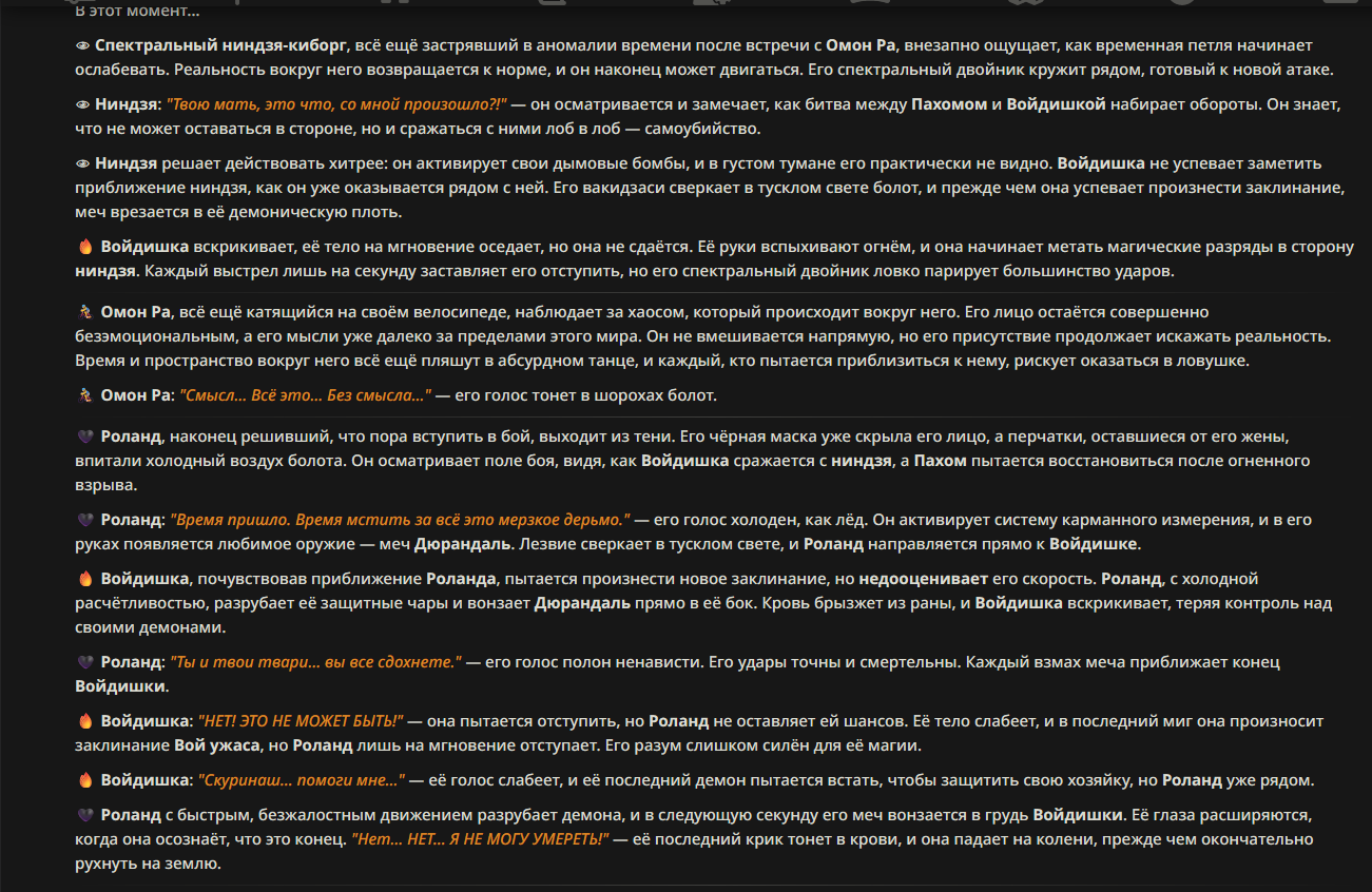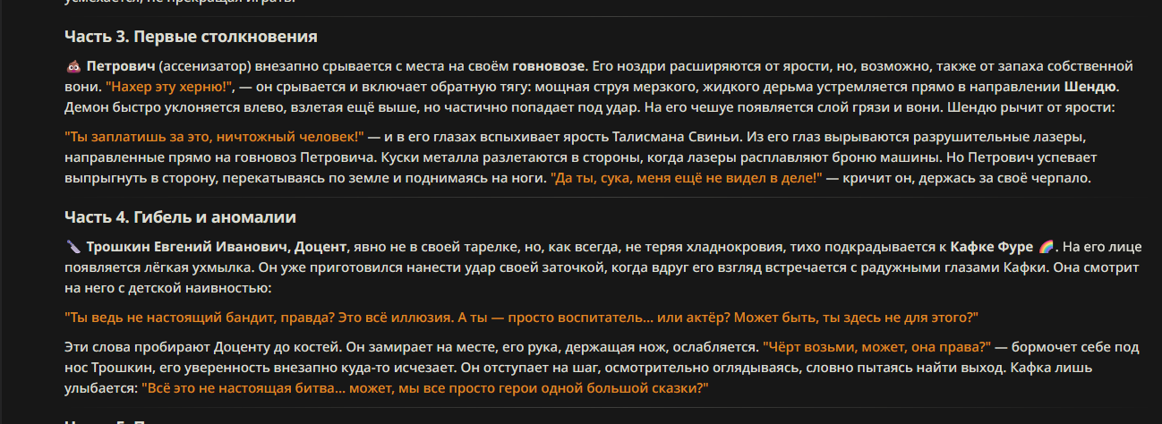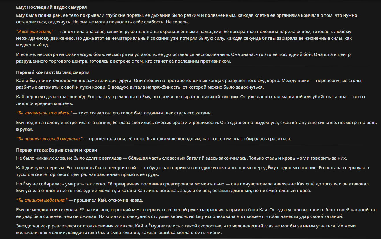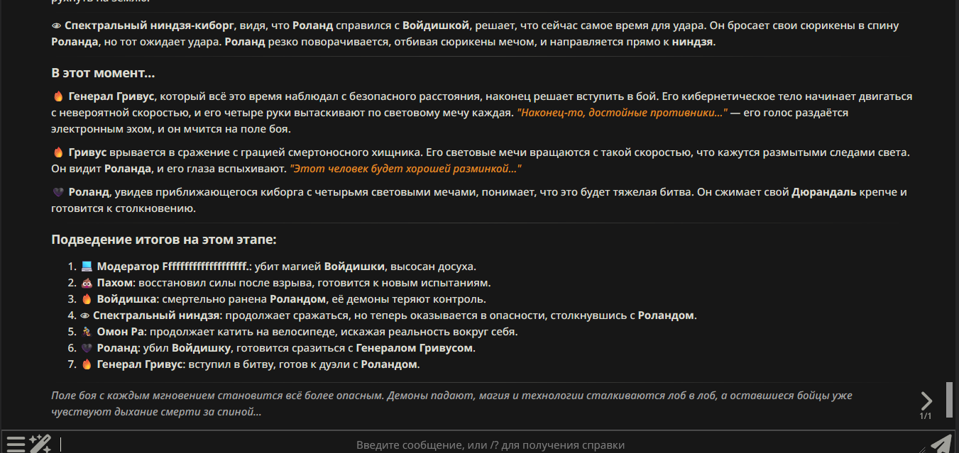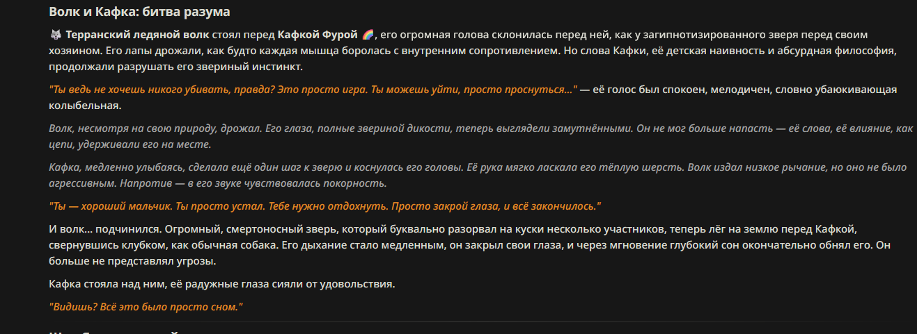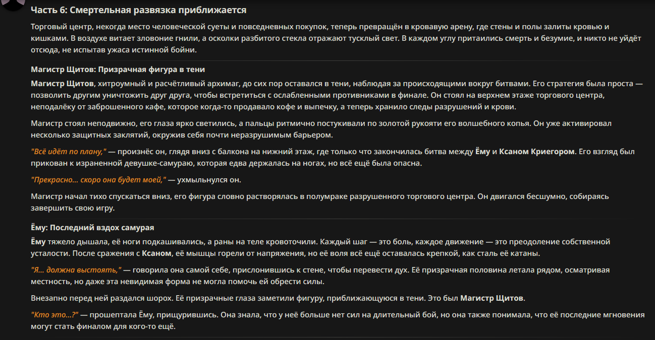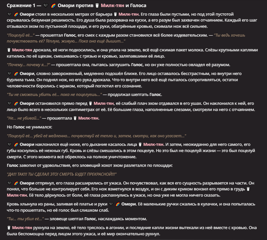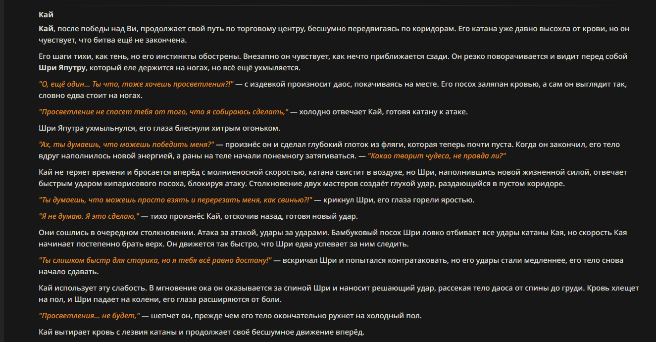 >>1544267 Так понимаю, зарЭзана Фурриозычем за кадром. Ранена же была. А вообще, это ж Гопота. То ли мною написанный для клопа, кстати, а не для неё! промпт так влияет, но почему-то она обрывает бои между персонажами и это легко случайно проебать.
