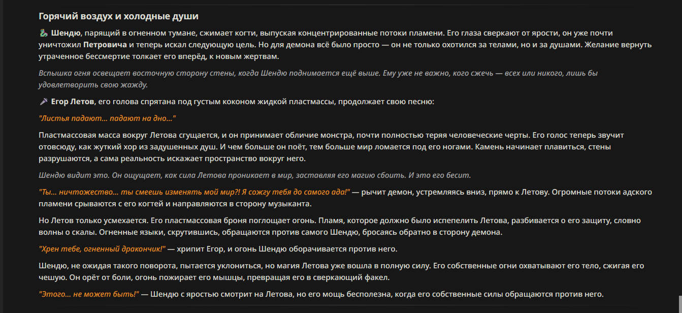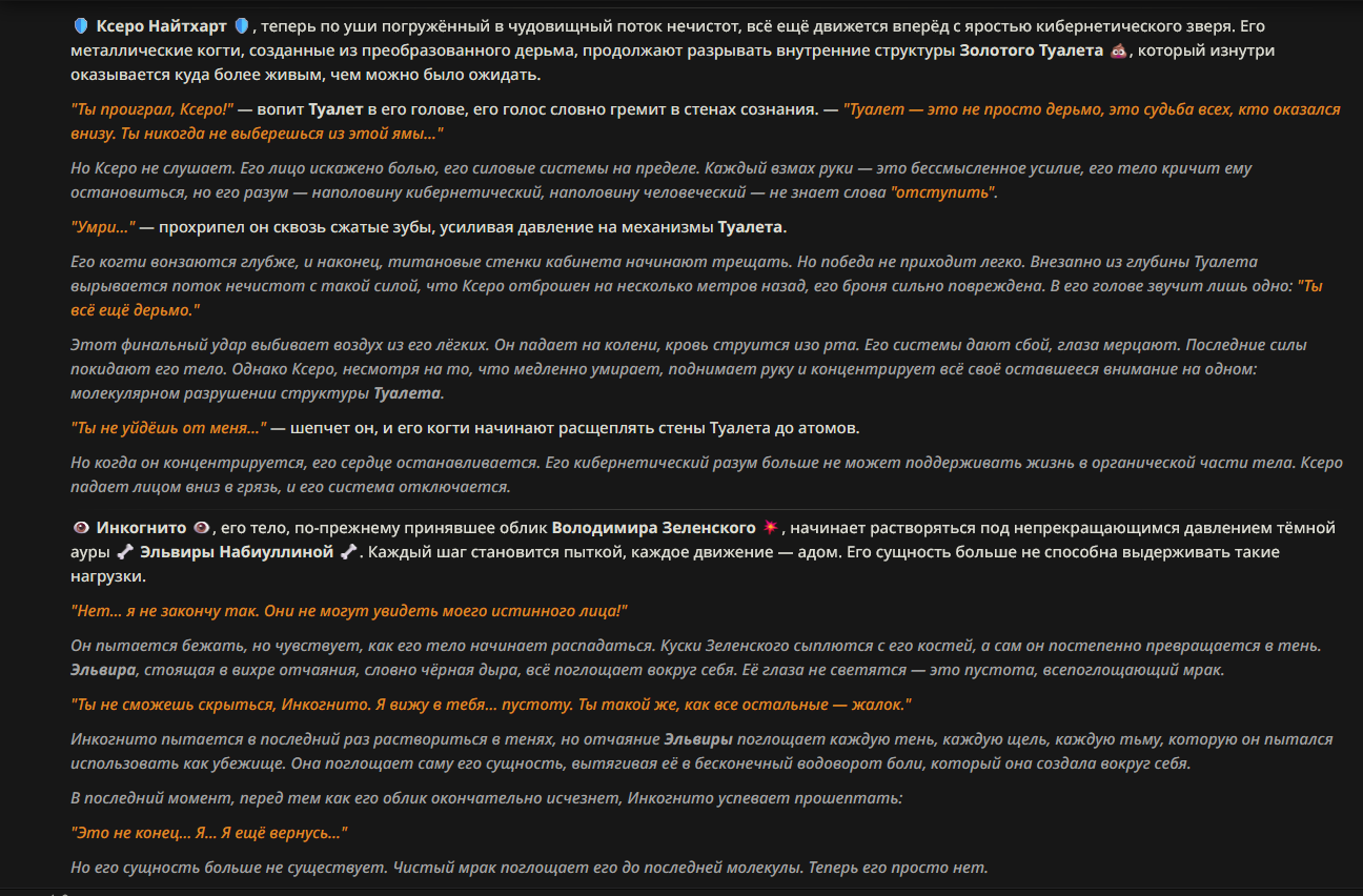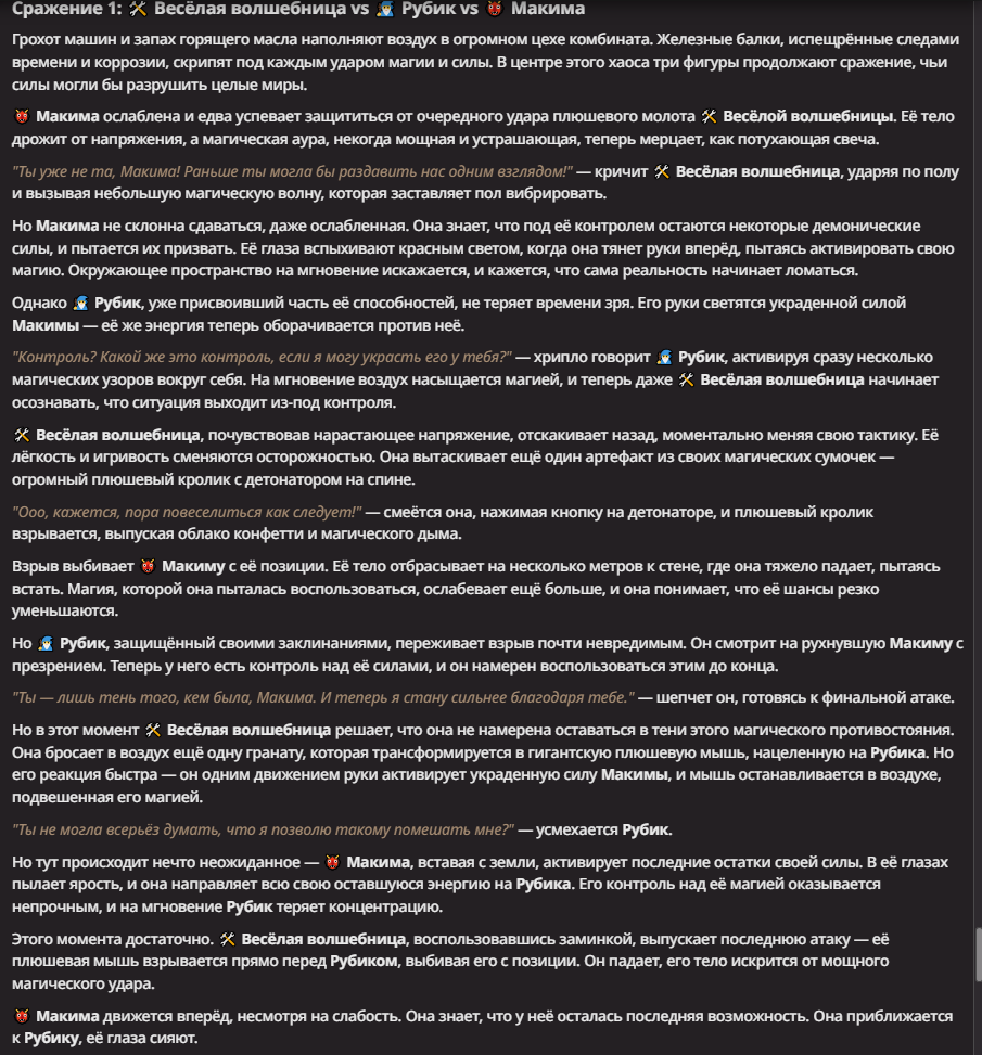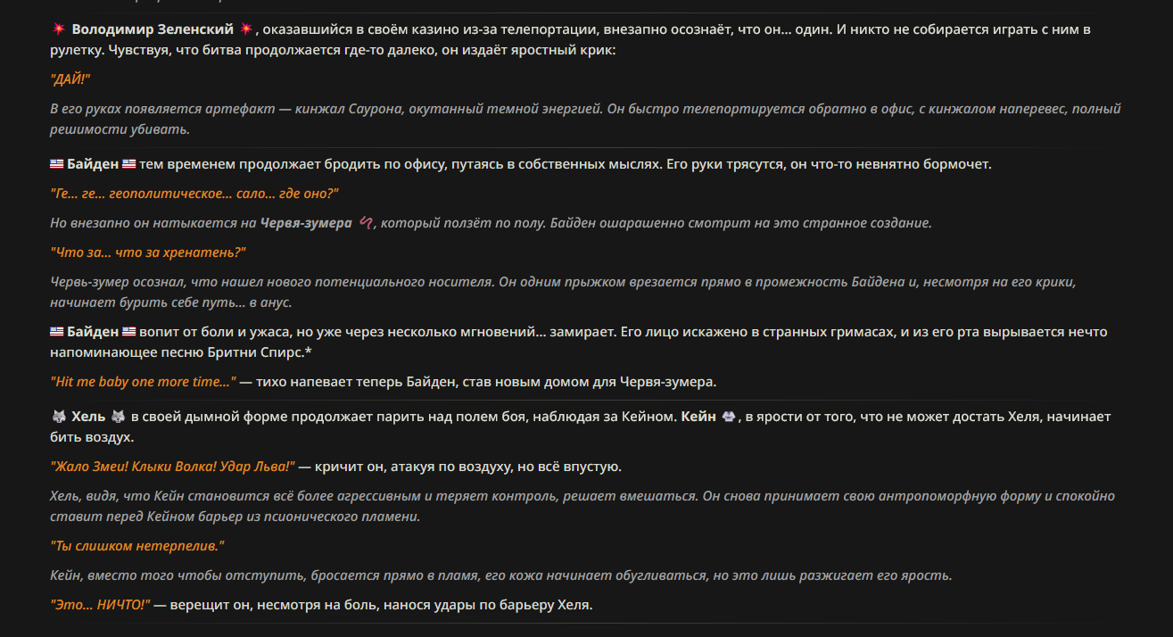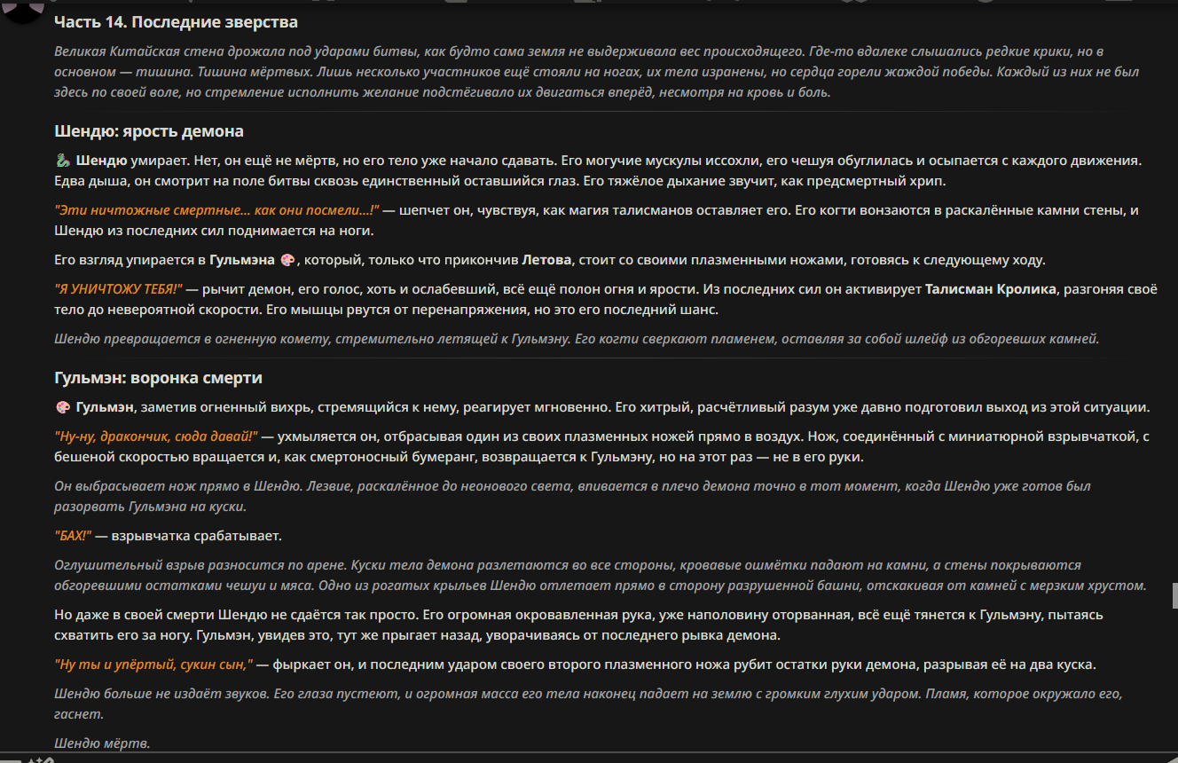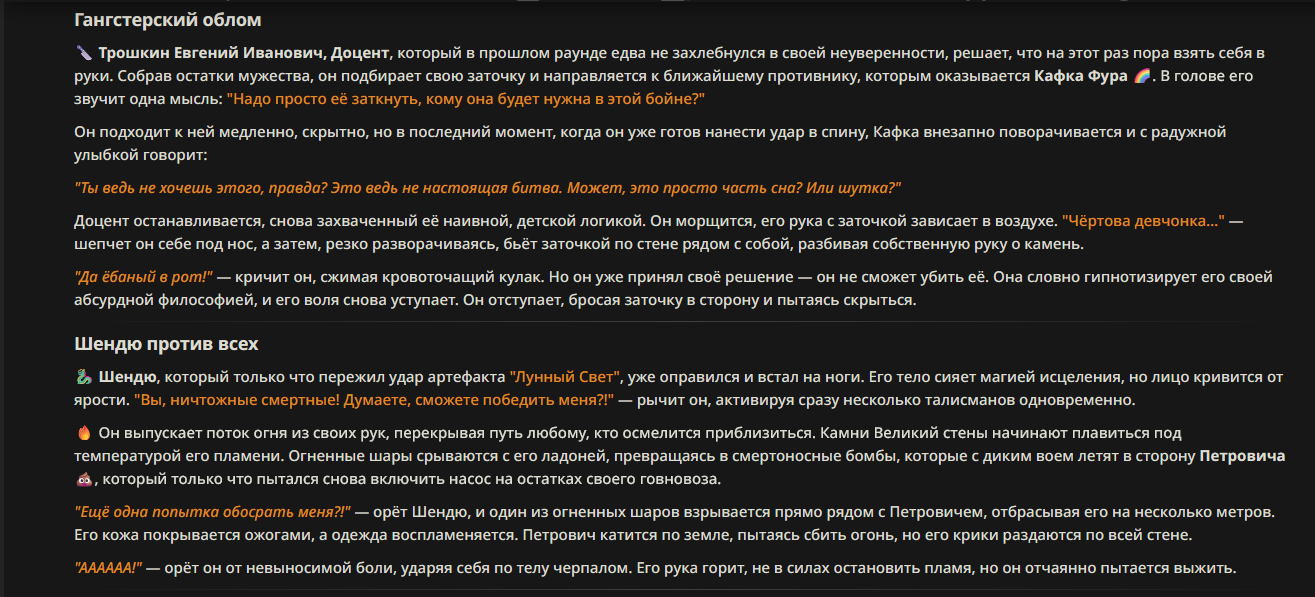 >>1544267 Так понимаю, зарЭзана Фурриозычем за кадром. Ранена же была. А вообще, это ж Гопота. То ли мною написанный для клопа, кстати, а не для неё! промпт так влияет, но почему-то она обрывает бои между персонажами и это легко случайно проебать.
