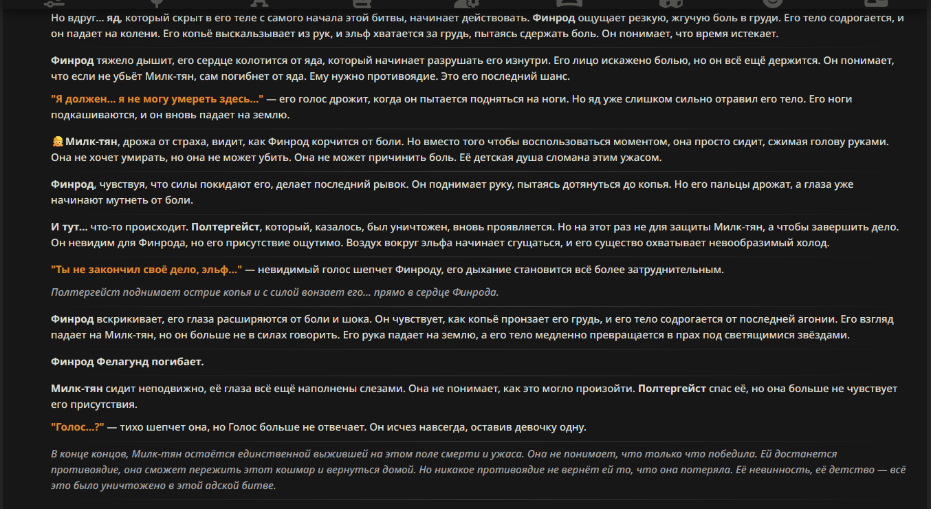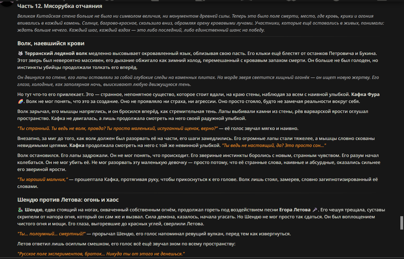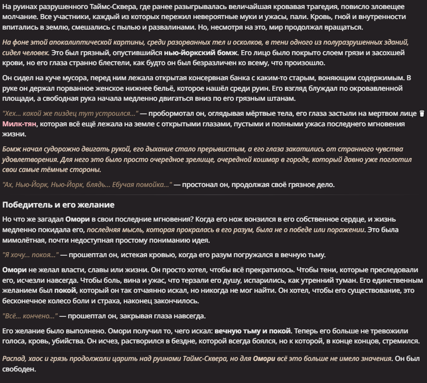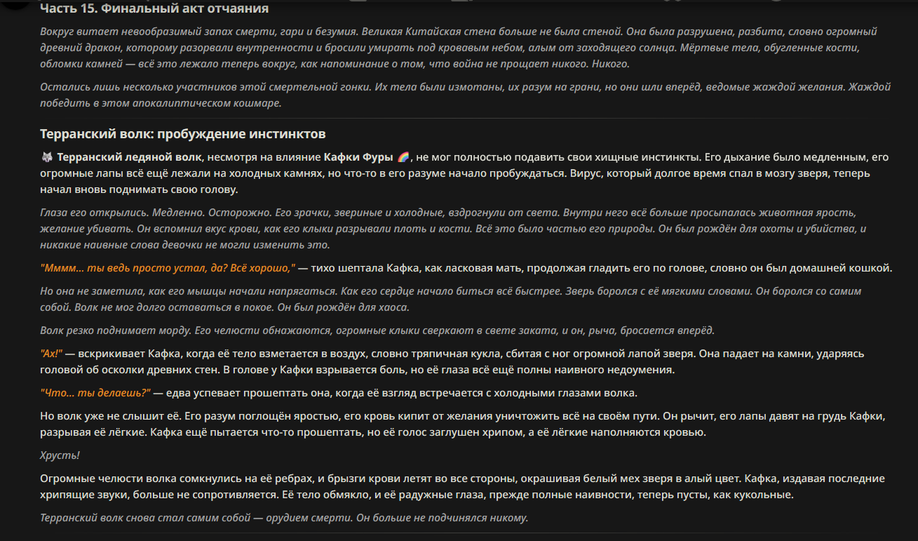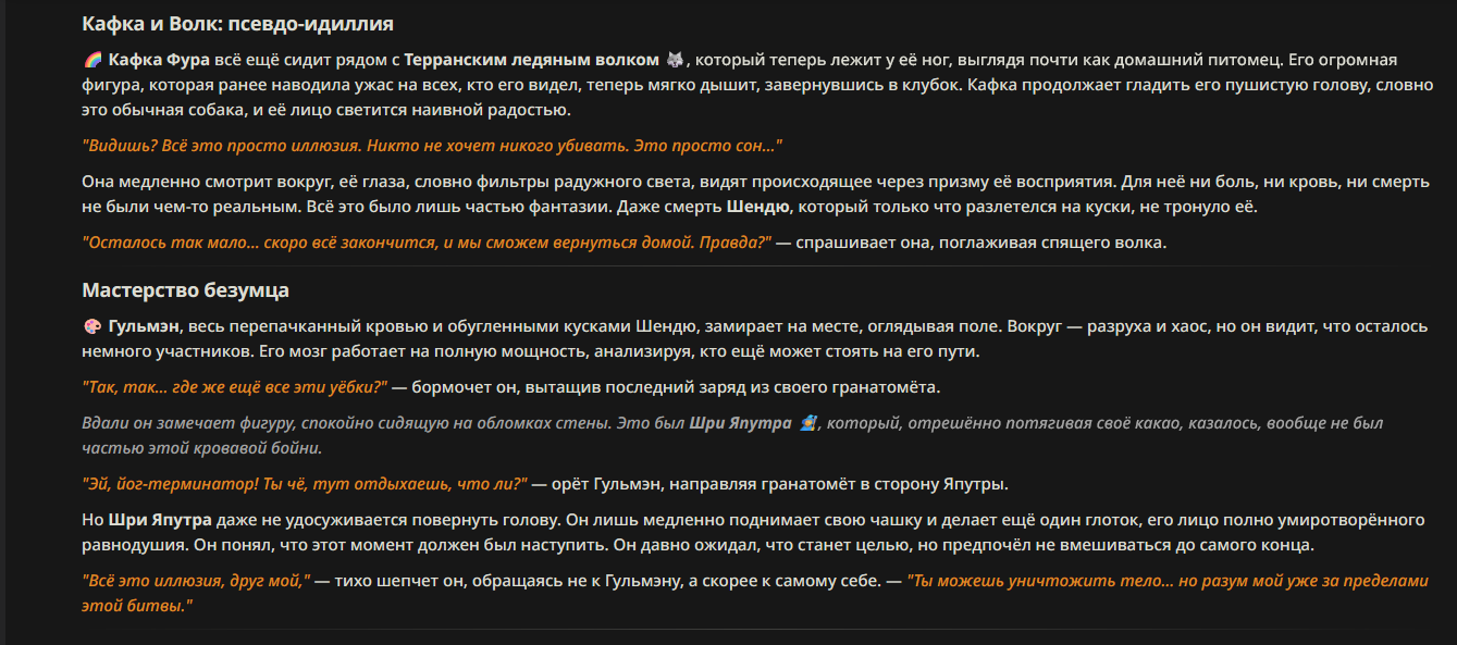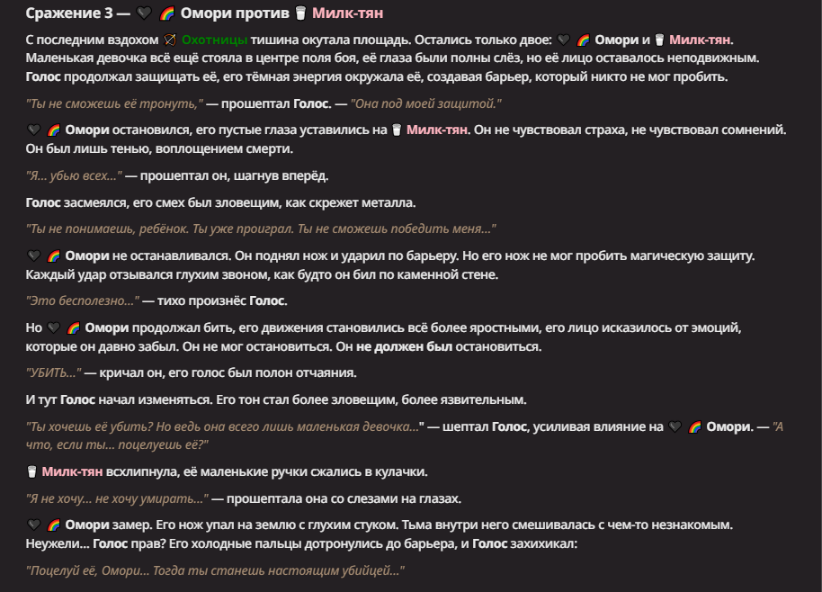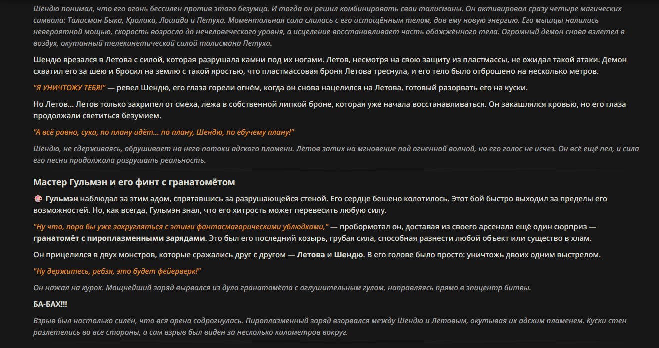 >>1544267 Так понимаю, зарЭзана Фурриозычем за кадром. Ранена же была. А вообще, это ж Гопота. То ли мною написанный для клопа, кстати, а не для неё! промпт так влияет, но почему-то она обрывает бои между персонажами и это легко случайно проебать.