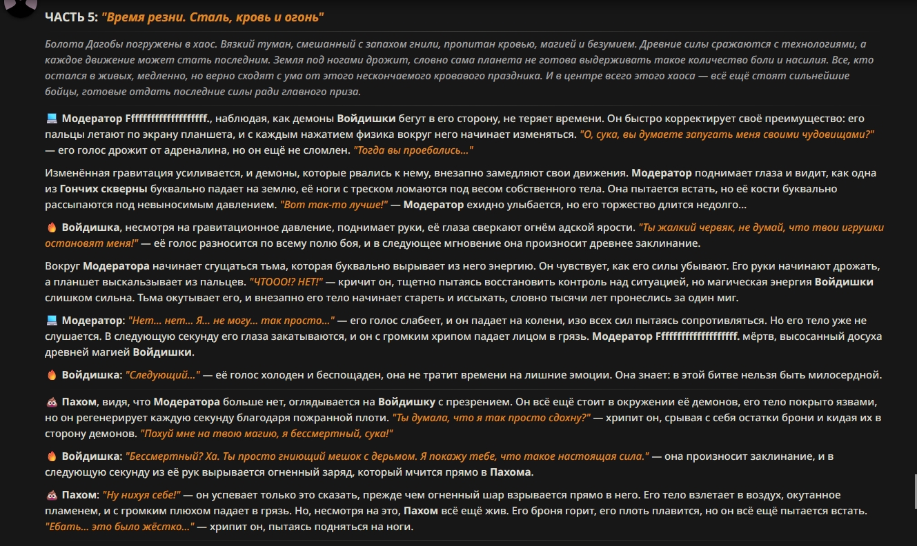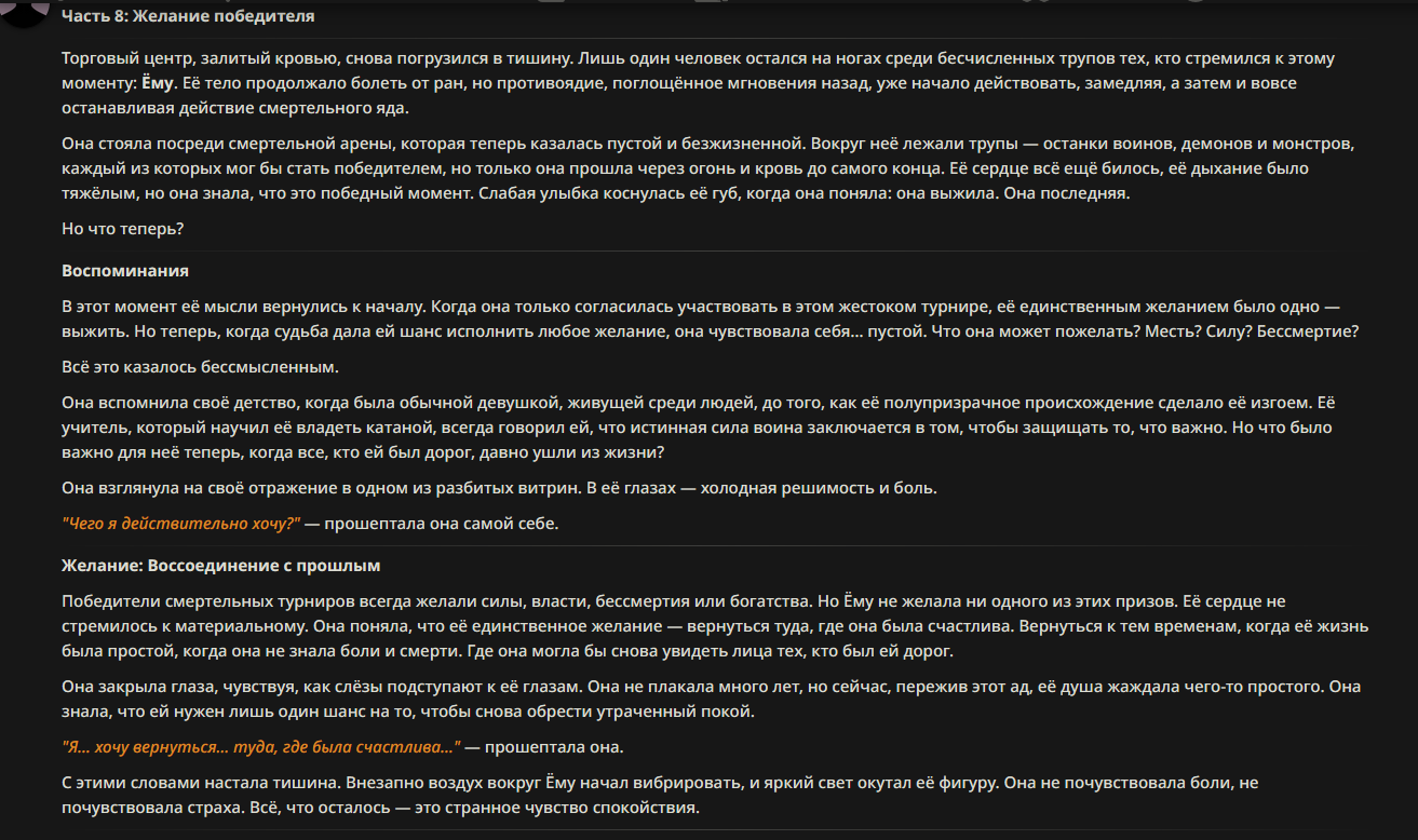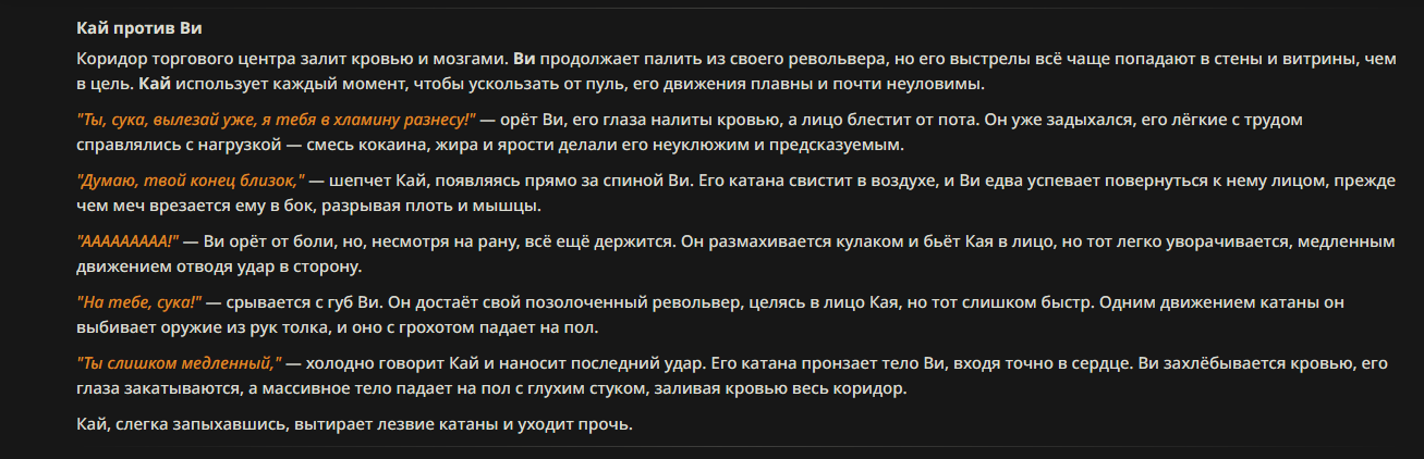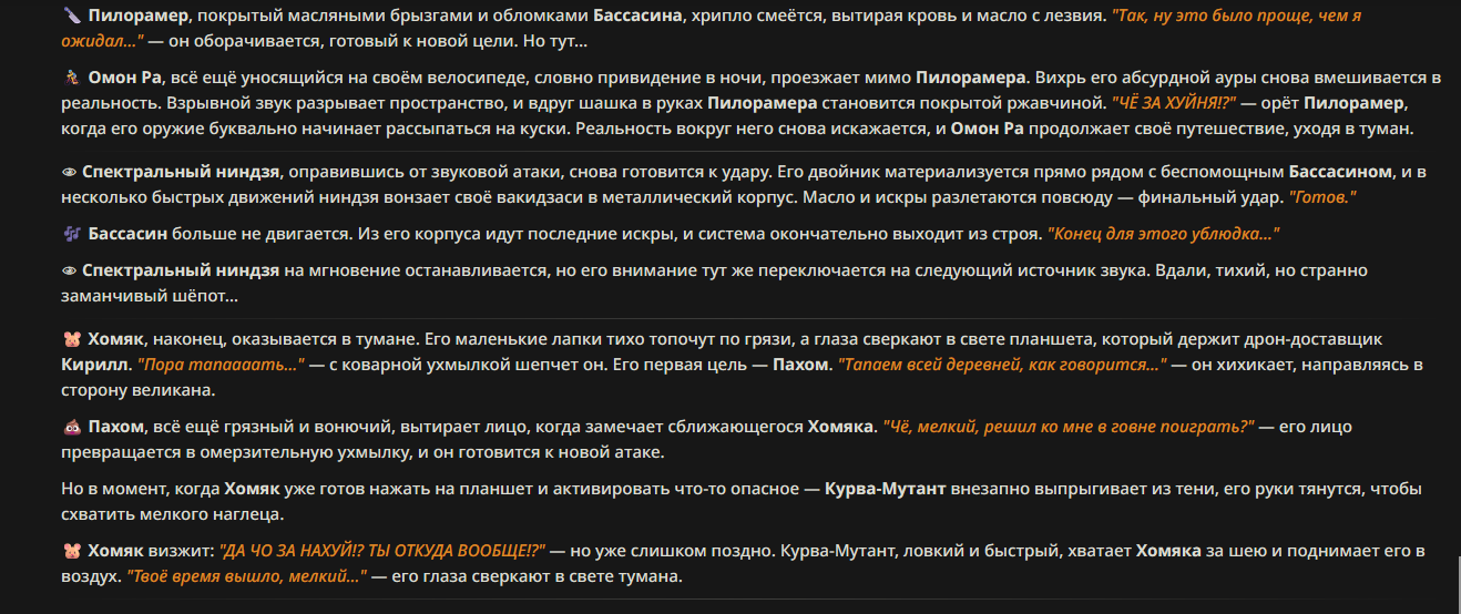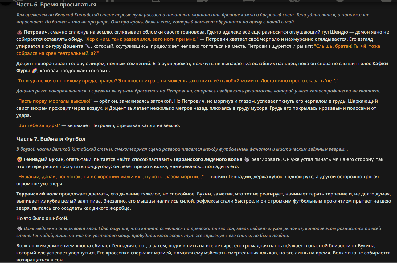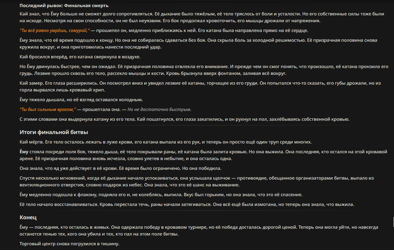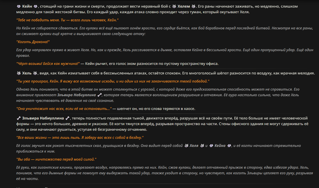 >>1544267 Так понимаю, зарЭзана Фурриозычем за кадром. Ранена же была. А вообще, это ж Гопота. То ли мною написанный для клопа, кстати, а не для неё! промпт так влияет, но почему-то она обрывает бои между персонажами и это легко случайно проебать.