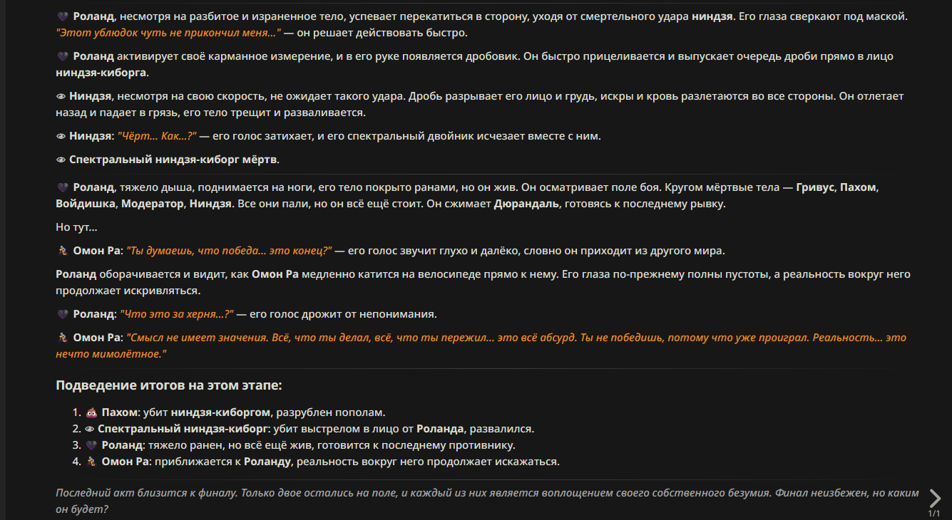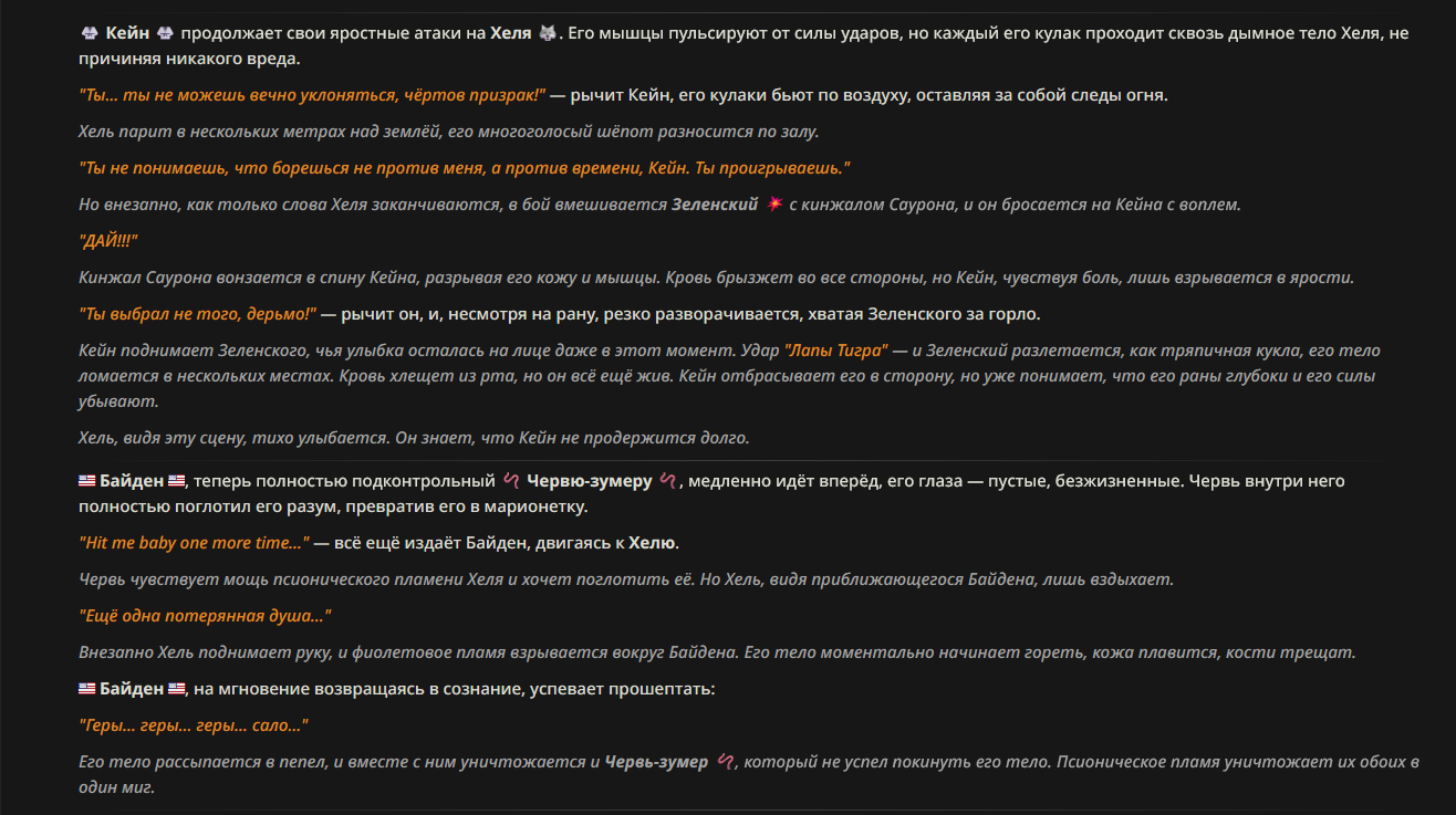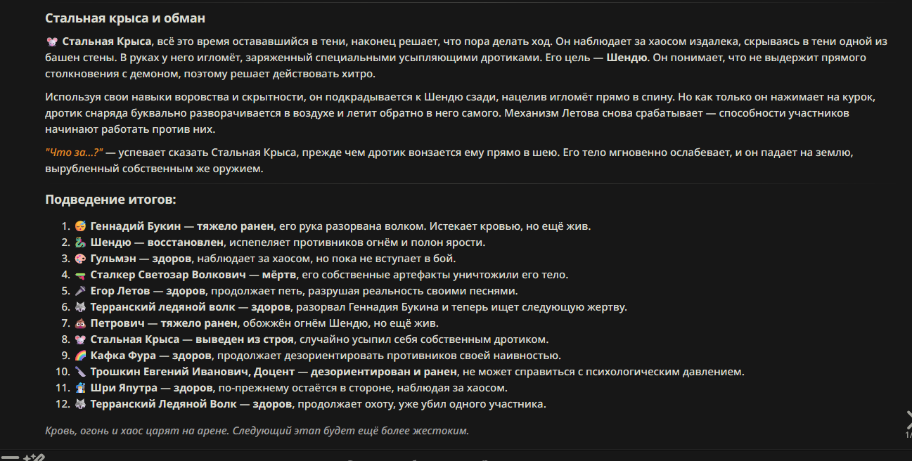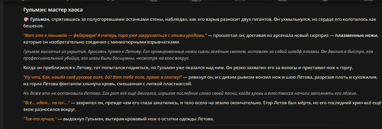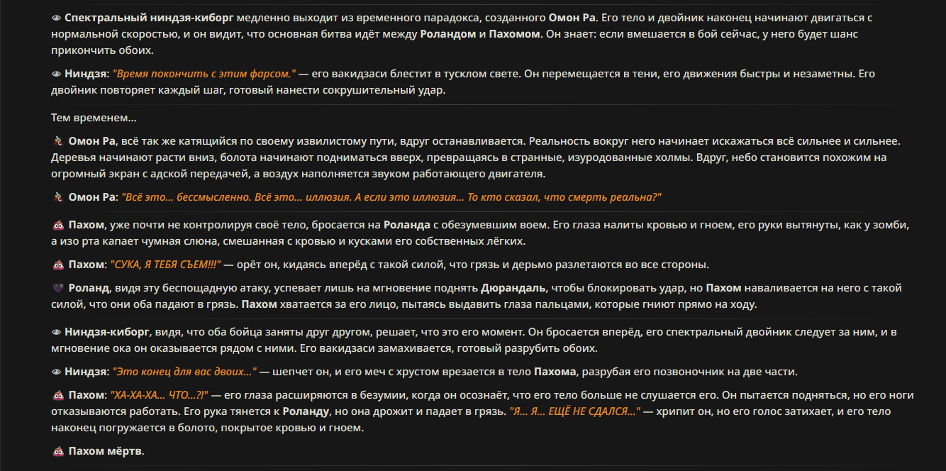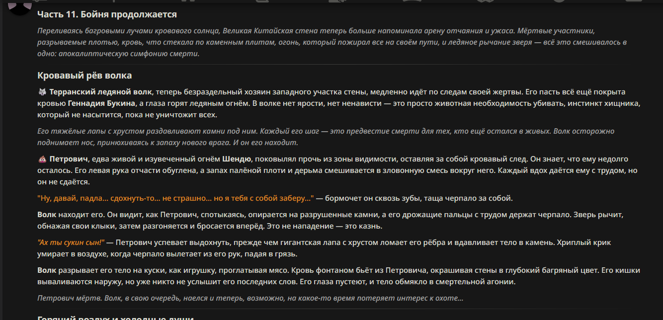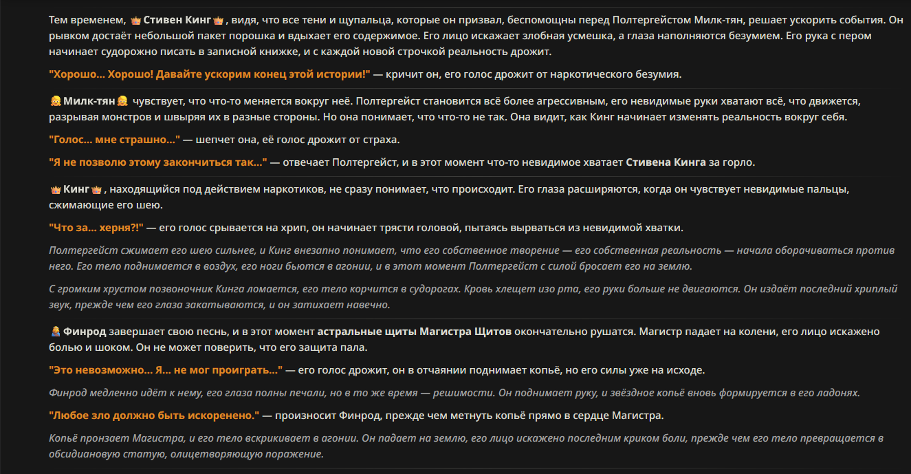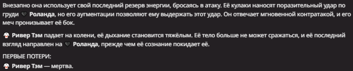 >>1544267 Так понимаю, зарЭзана Фурриозычем за кадром. Ранена же была. А вообще, это ж Гопота. То ли мною написанный для клопа, кстати, а не для неё! промпт так влияет, но почему-то она обрывает бои между персонажами и это легко случайно проебать.