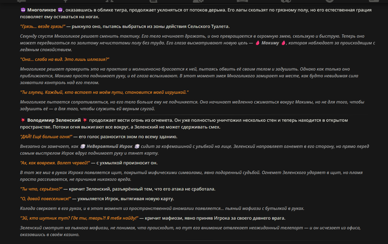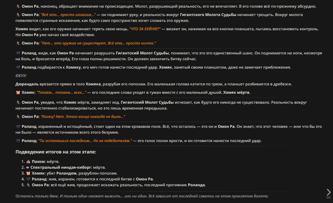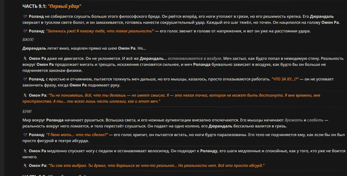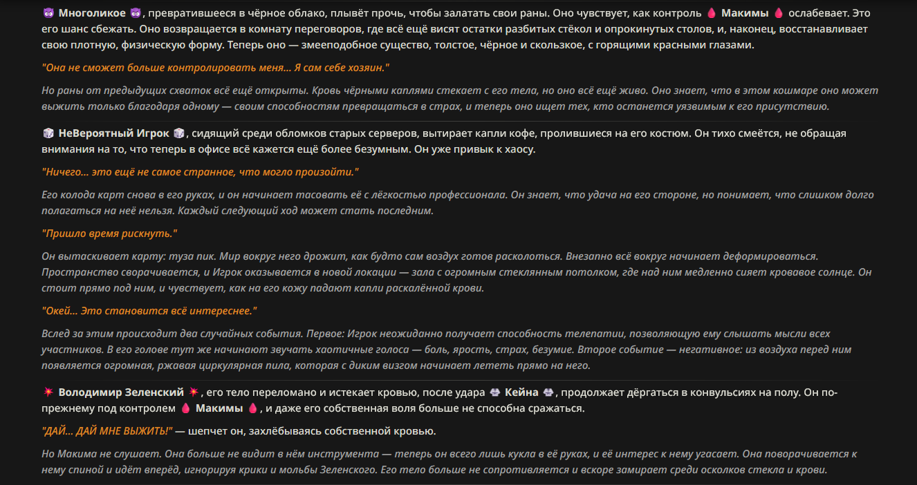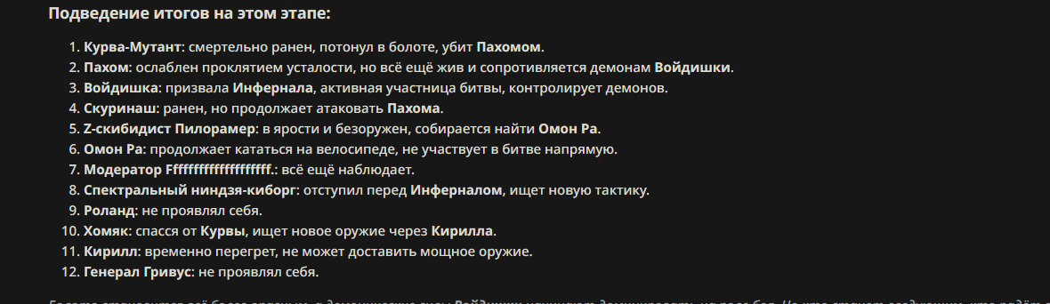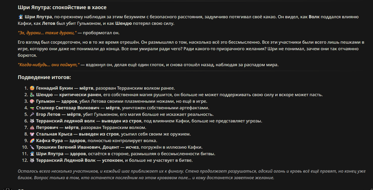 >>1544267 Так понимаю, зарЭзана Фурриозычем за кадром. Ранена же была. А вообще, это ж Гопота. То ли мною написанный для клопа, кстати, а не для неё! промпт так влияет, но почему-то она обрывает бои между персонажами и это легко случайно проебать.
