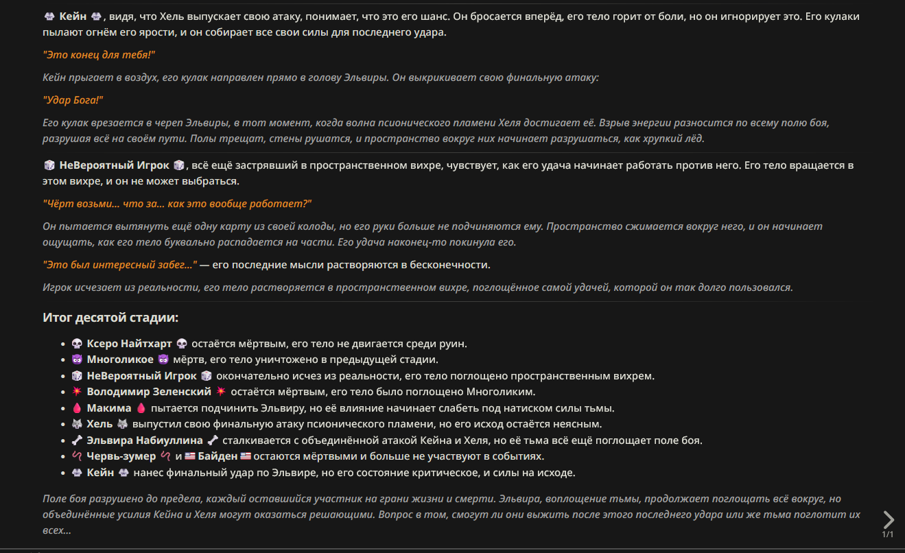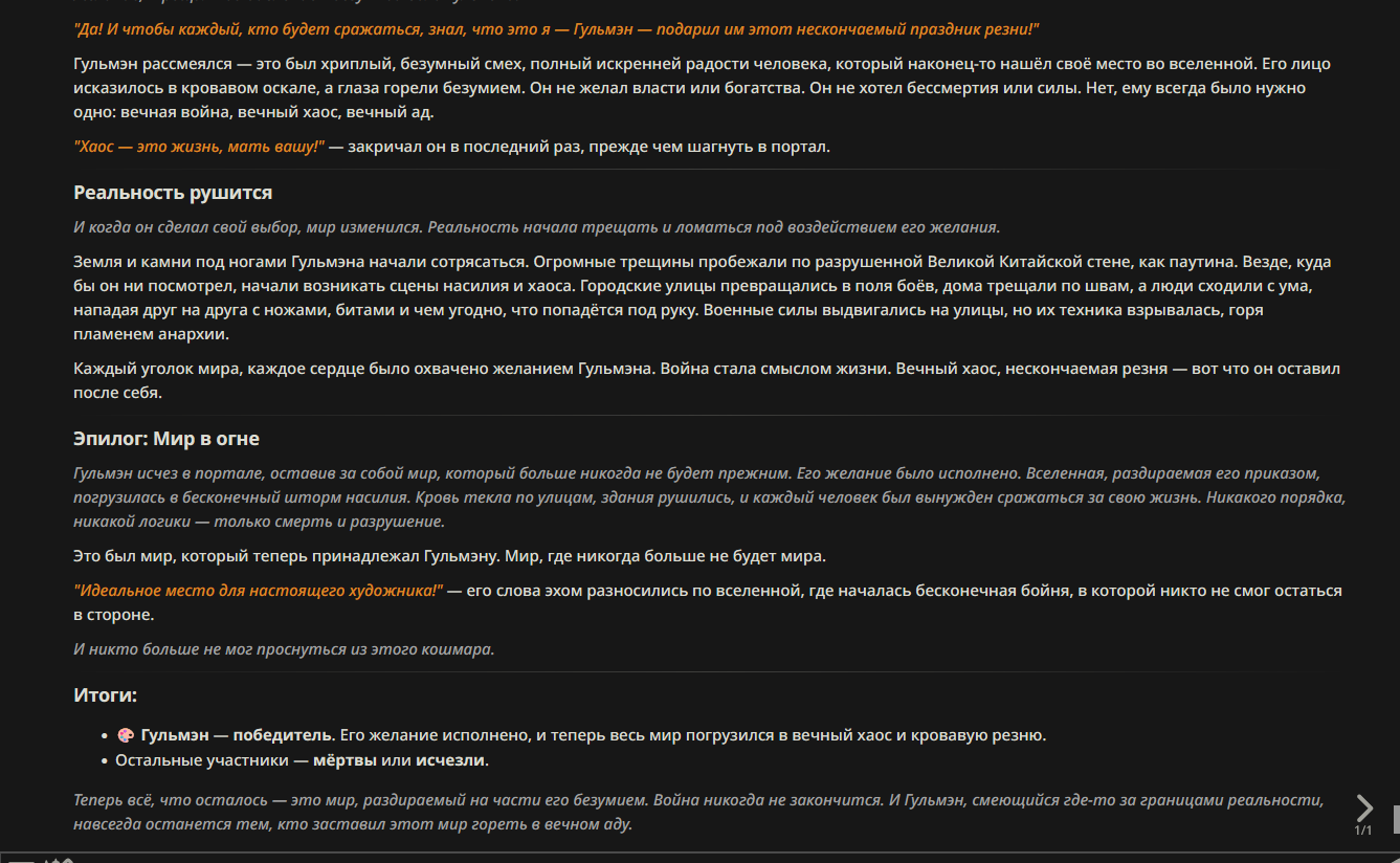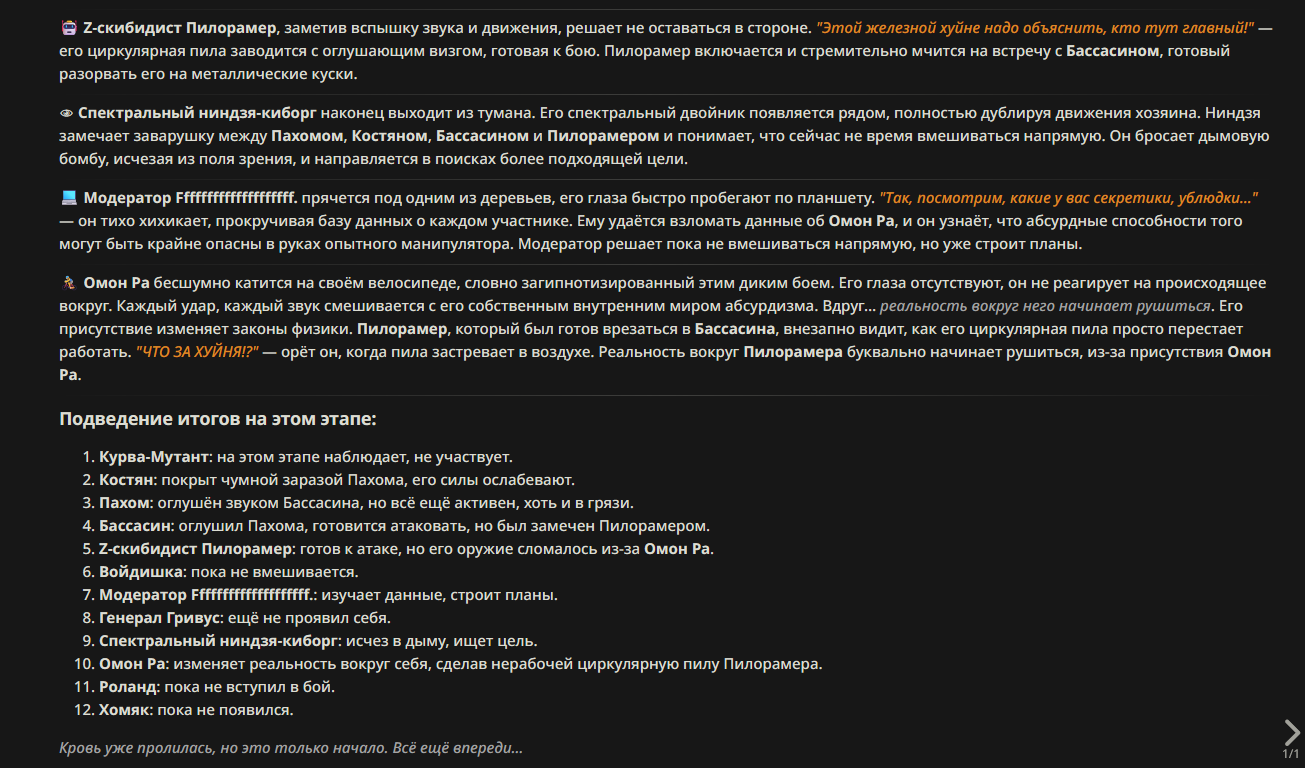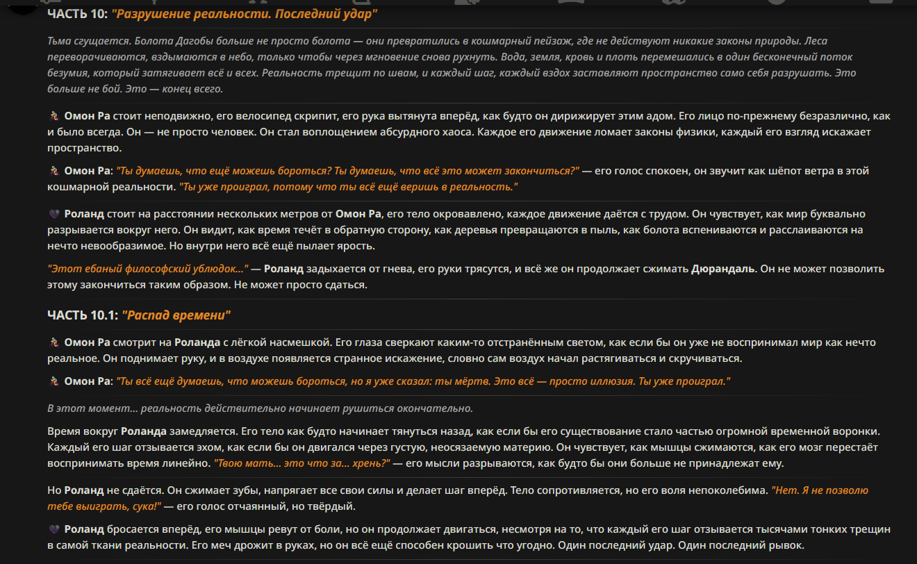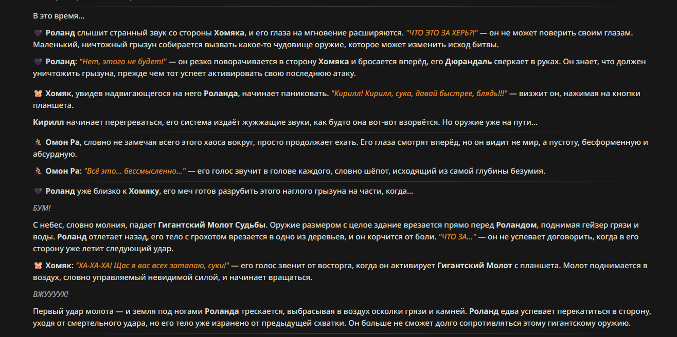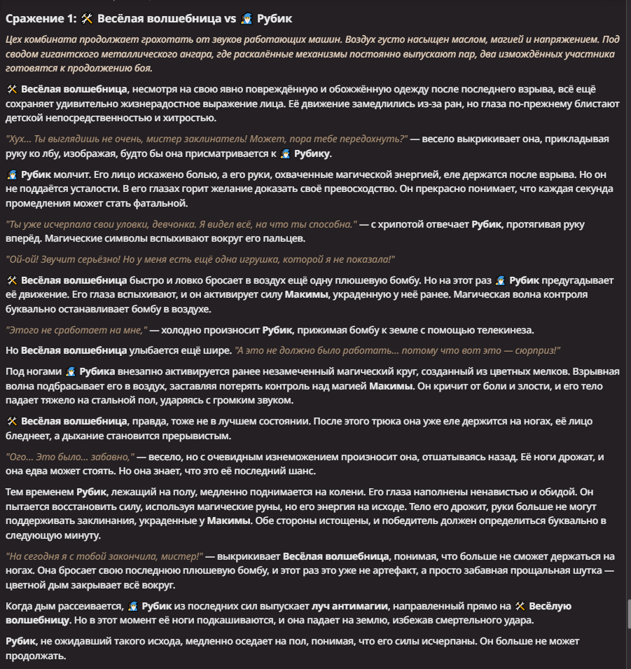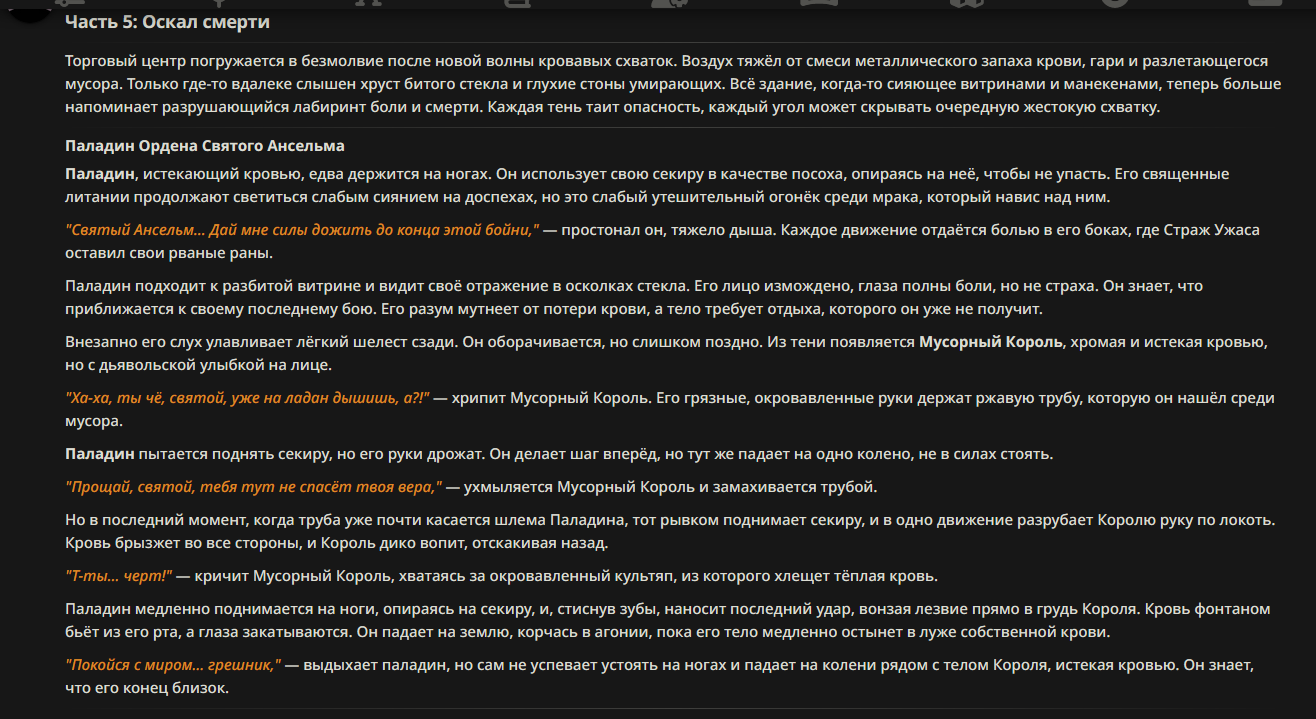 >>1544267 Так понимаю, зарЭзана Фурриозычем за кадром. Ранена же была. А вообще, это ж Гопота. То ли мною написанный для клопа, кстати, а не для неё! промпт так влияет, но почему-то она обрывает бои между персонажами и это легко случайно проебать.