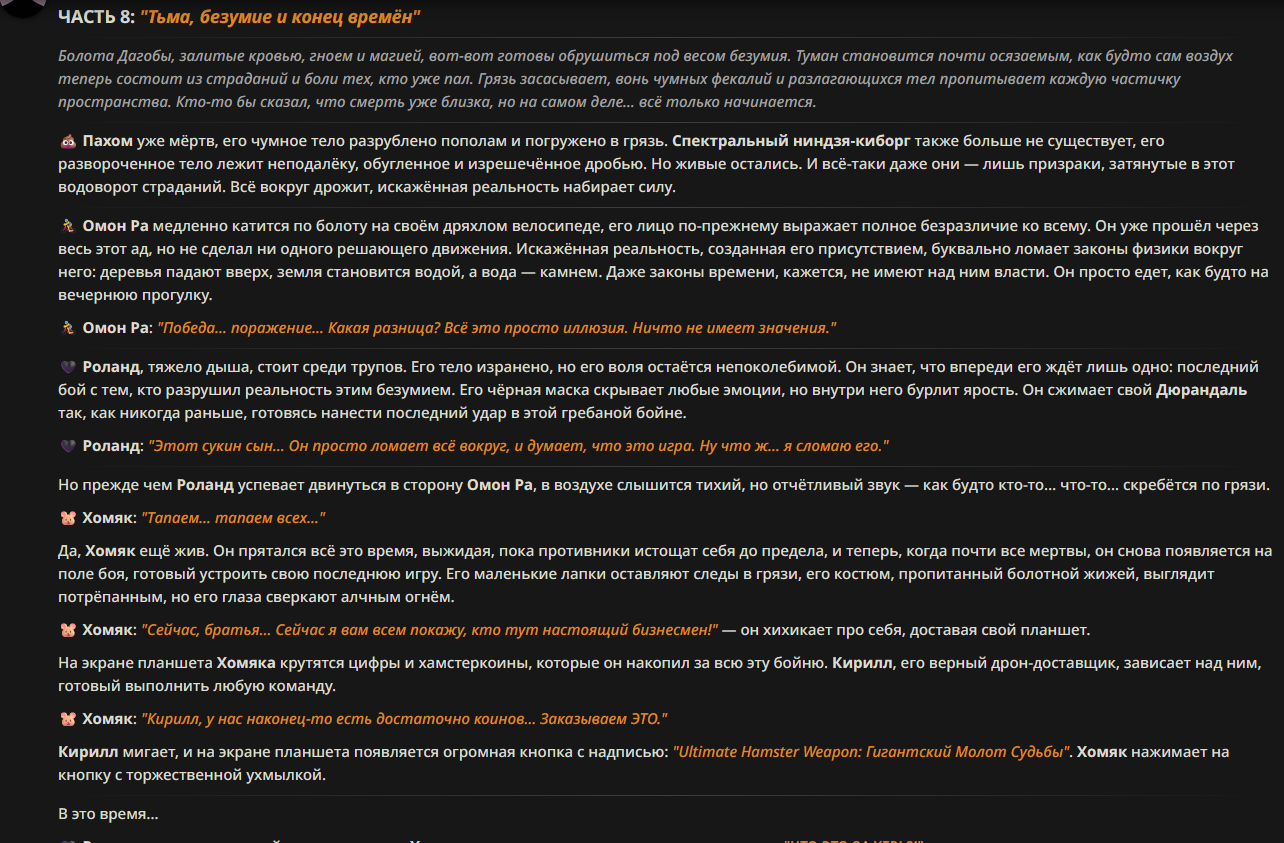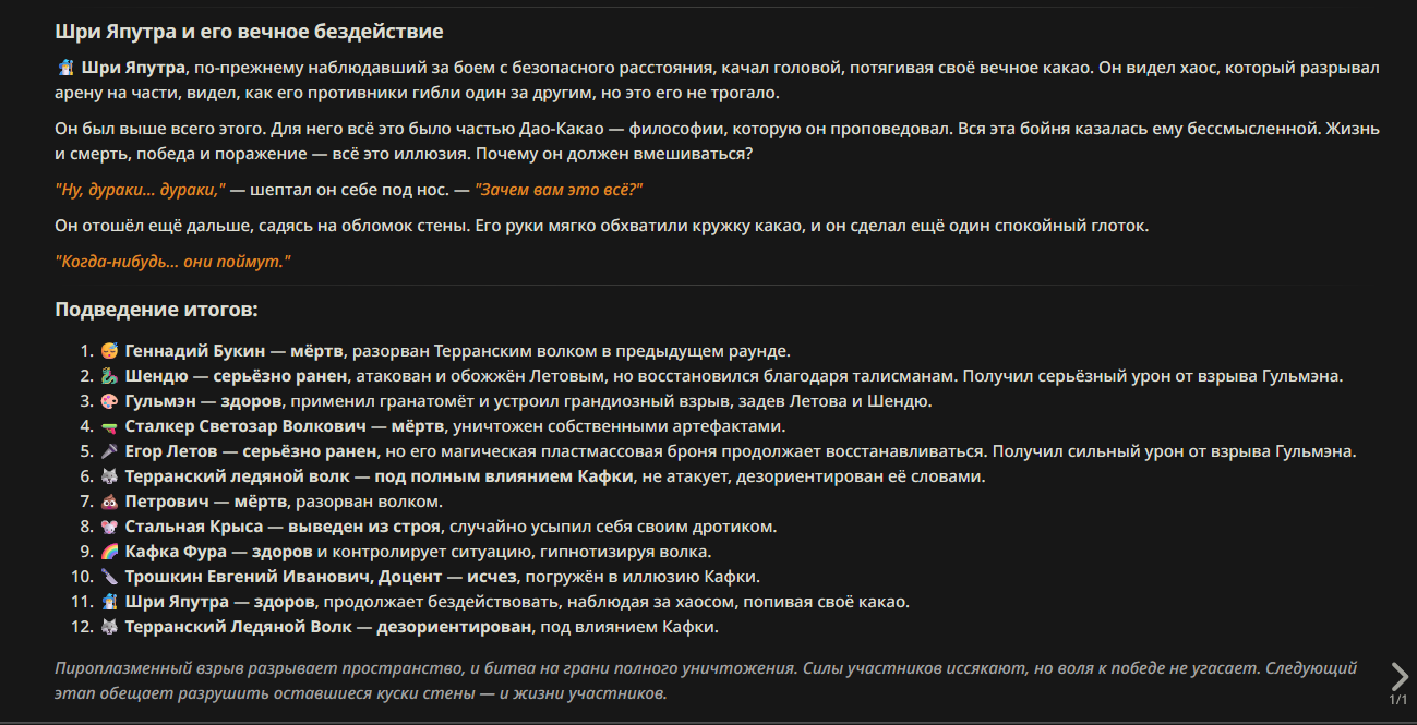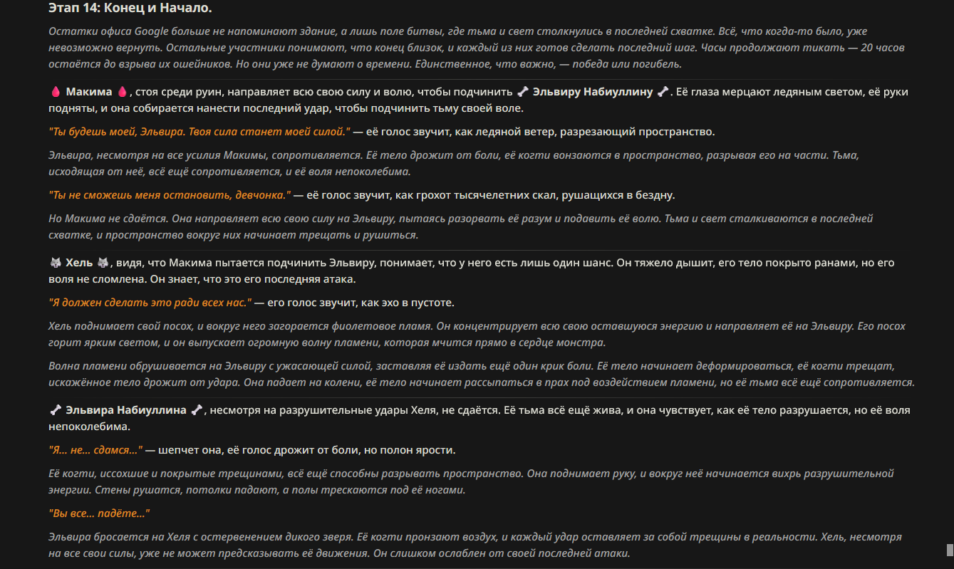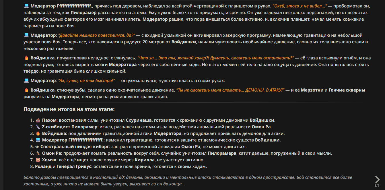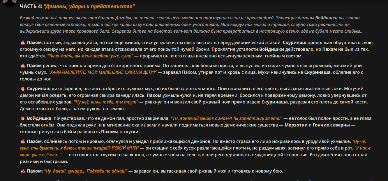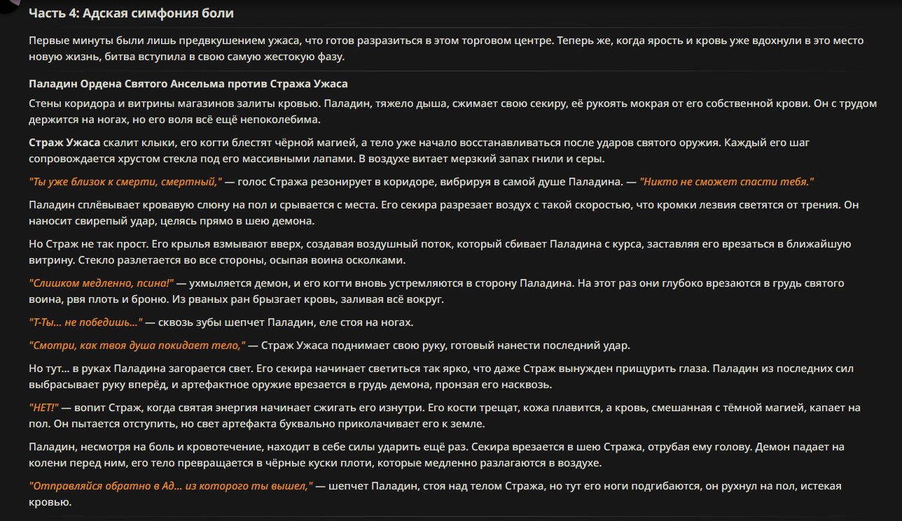 >>1544267 Так понимаю, зарЭзана Фурриозычем за кадром. Ранена же была. А вообще, это ж Гопота. То ли мною написанный для клопа, кстати, а не для неё! промпт так влияет, но почему-то она обрывает бои между персонажами и это легко случайно проебать.