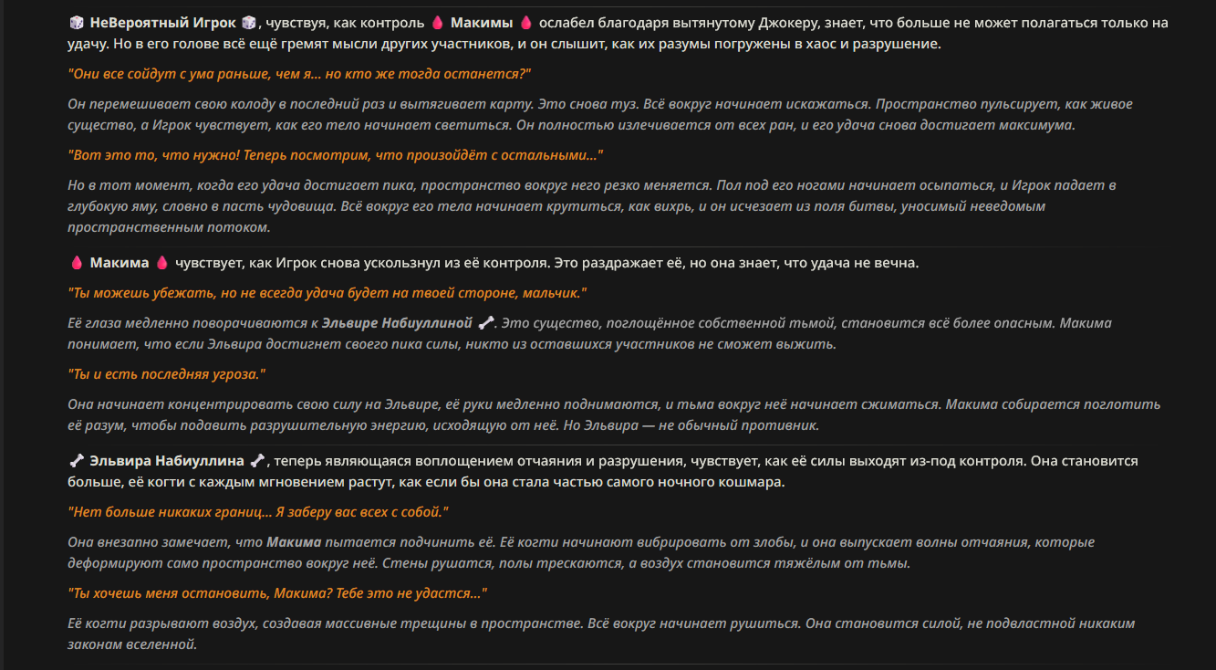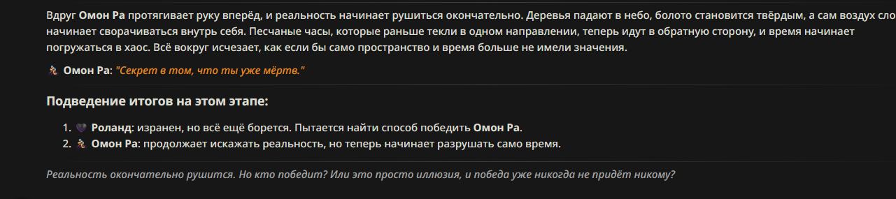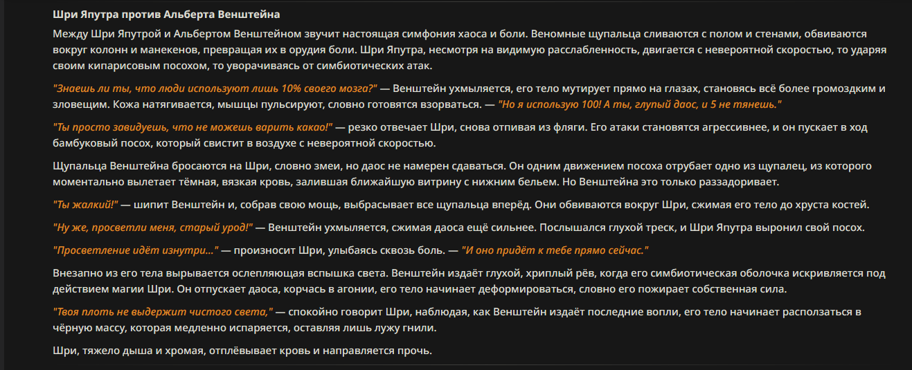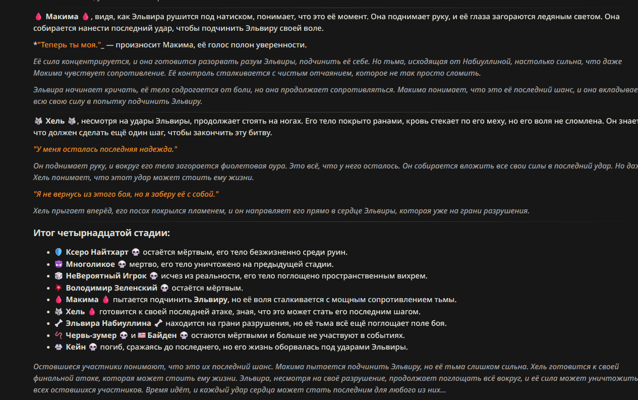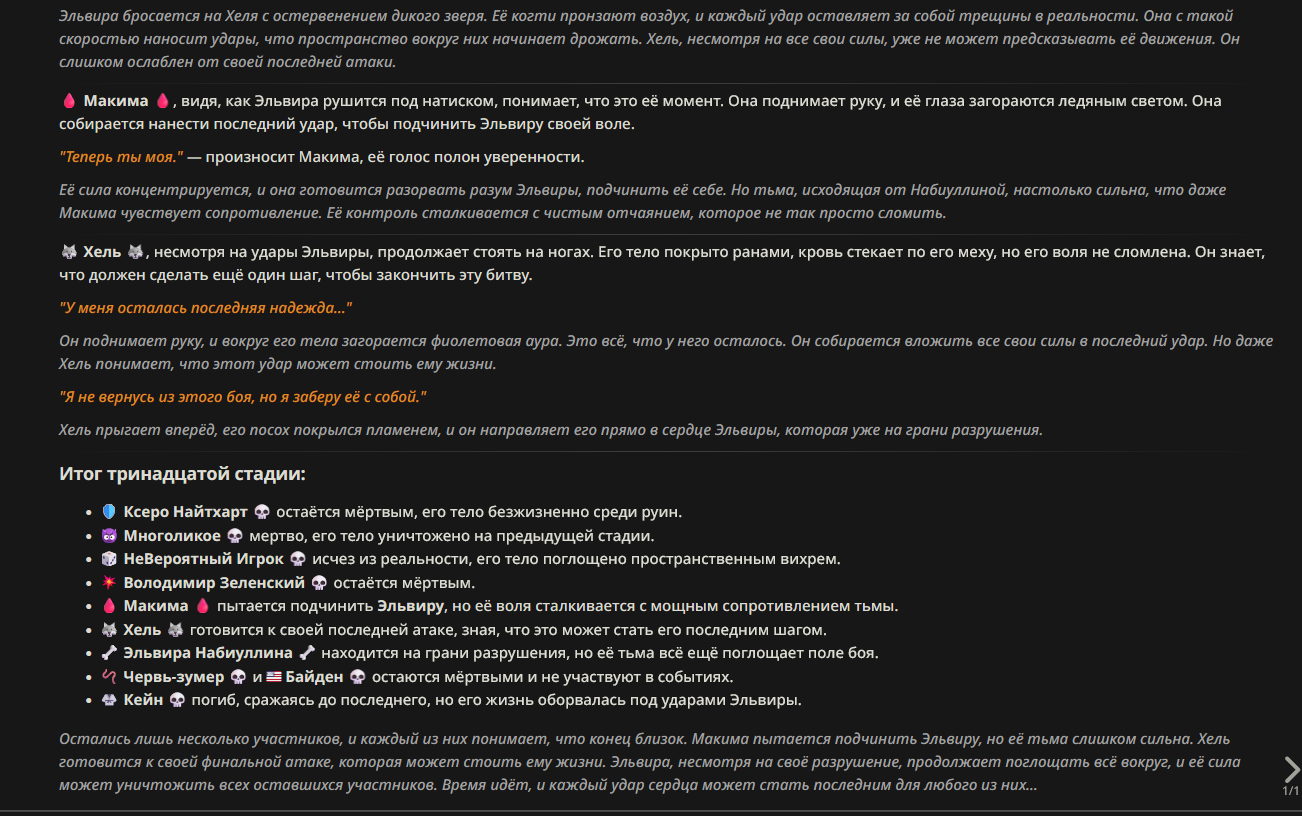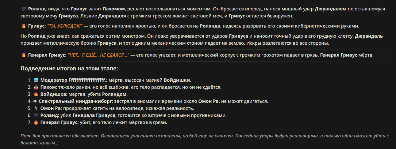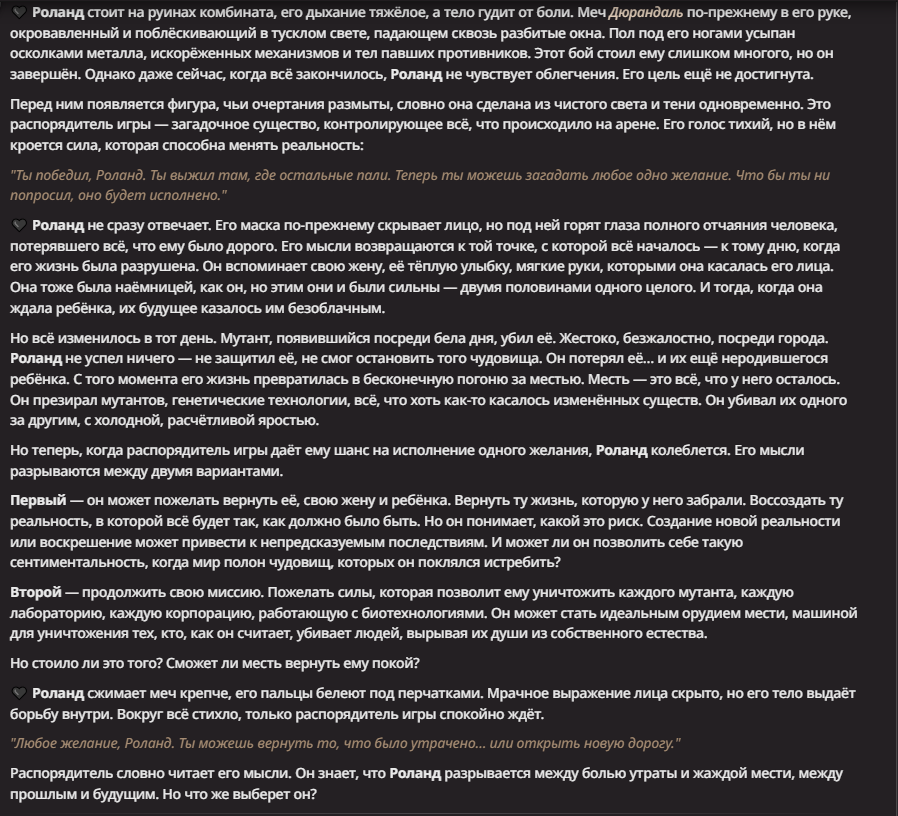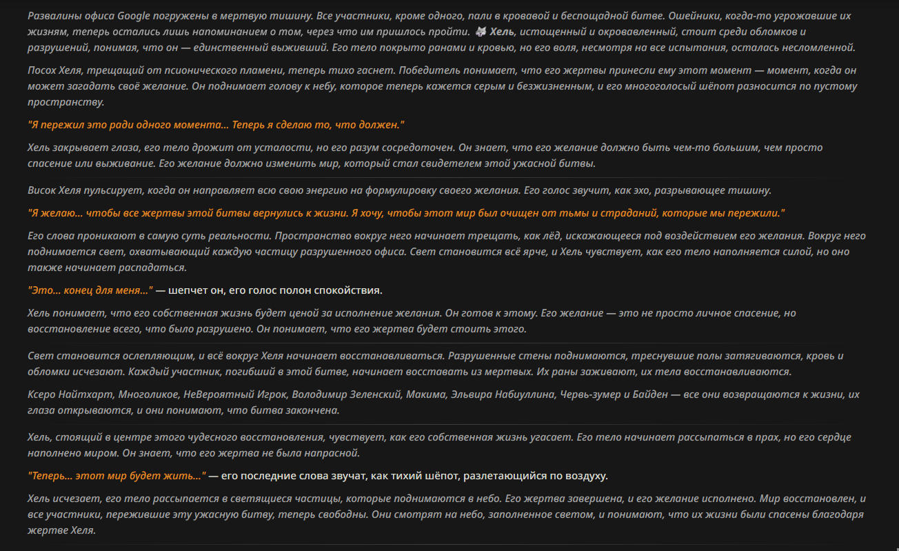 >>1544267 Так понимаю, зарЭзана Фурриозычем за кадром. Ранена же была. А вообще, это ж Гопота. То ли мною написанный для клопа, кстати, а не для неё! промпт так влияет, но почему-то она обрывает бои между персонажами и это легко случайно проебать.