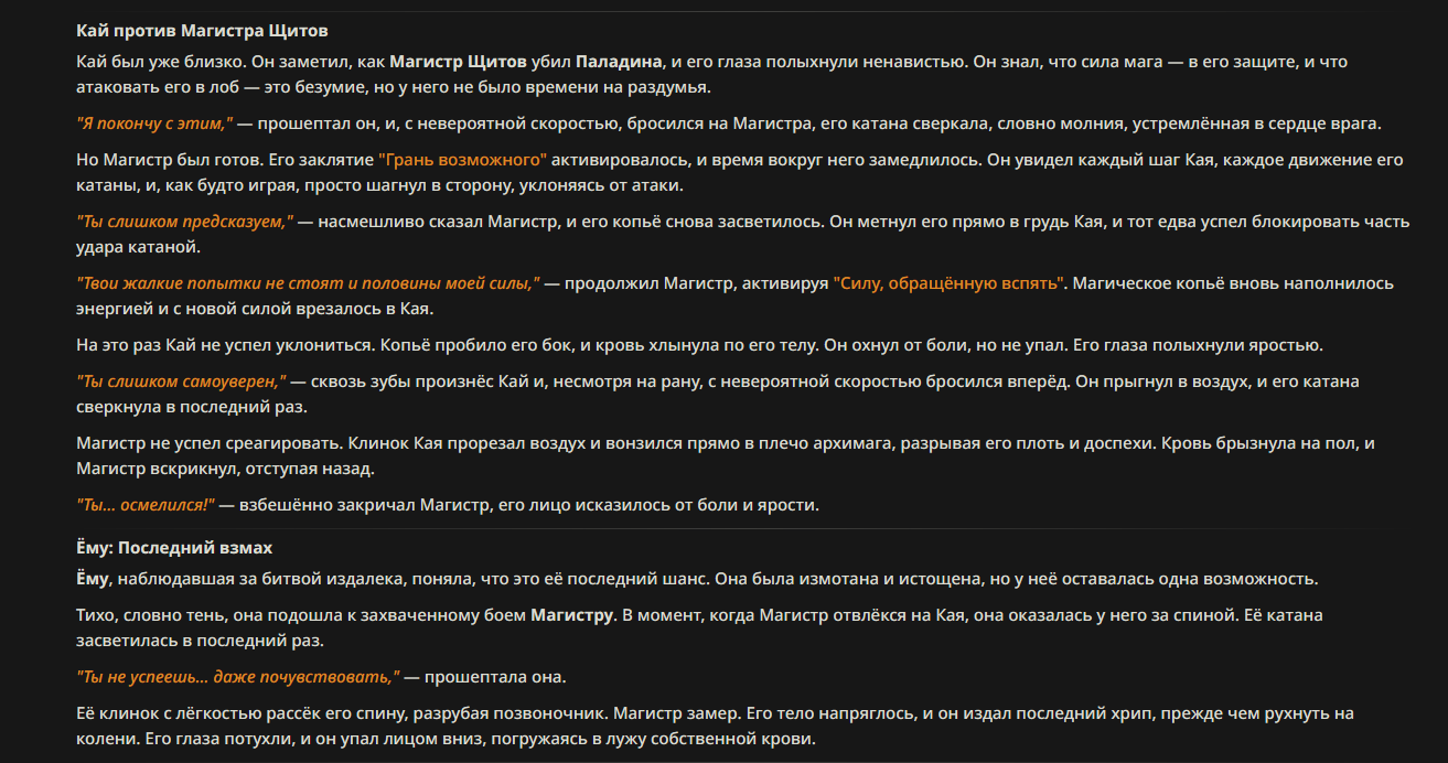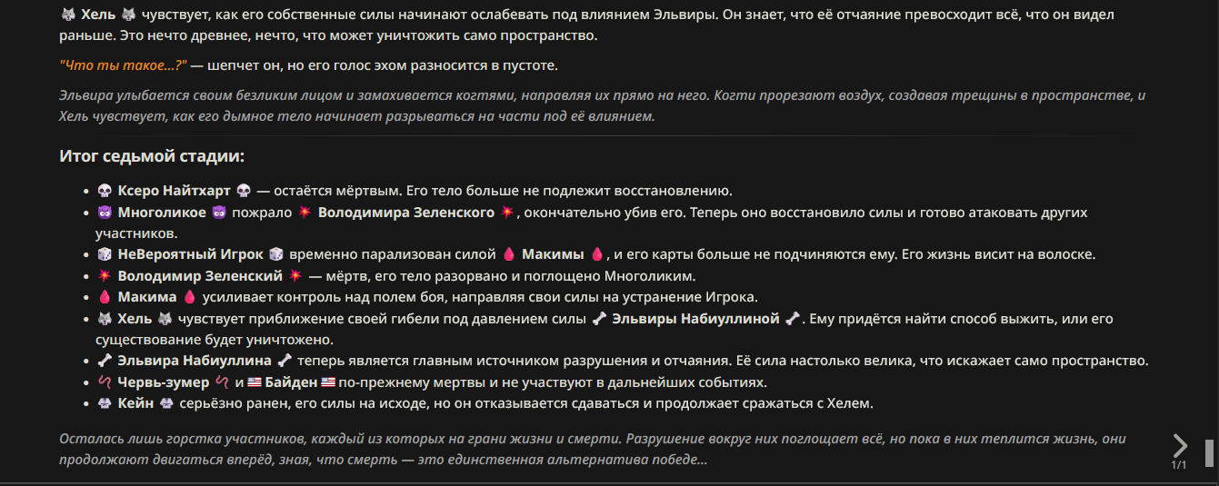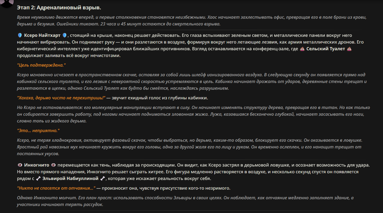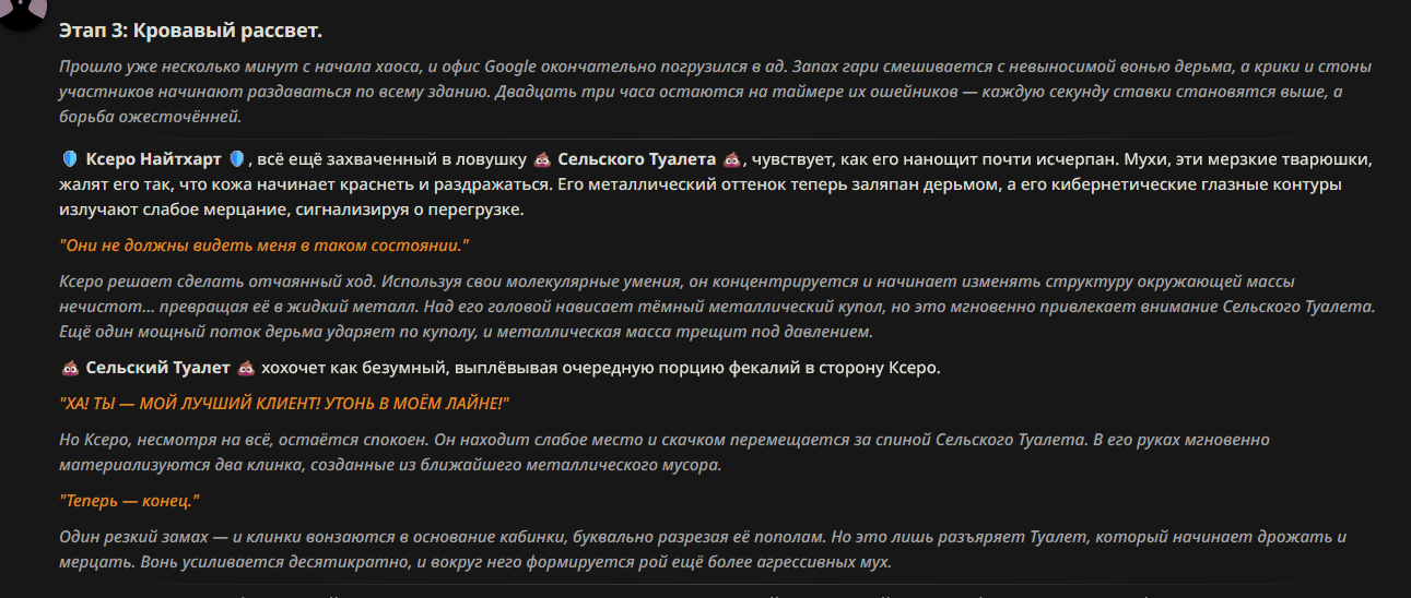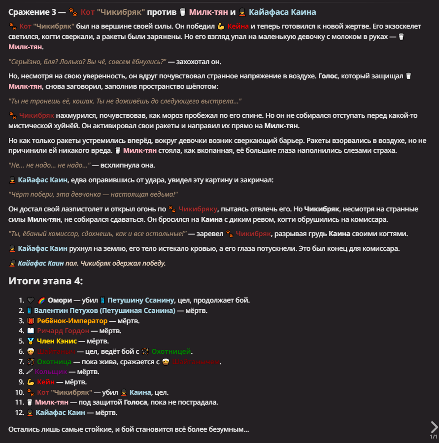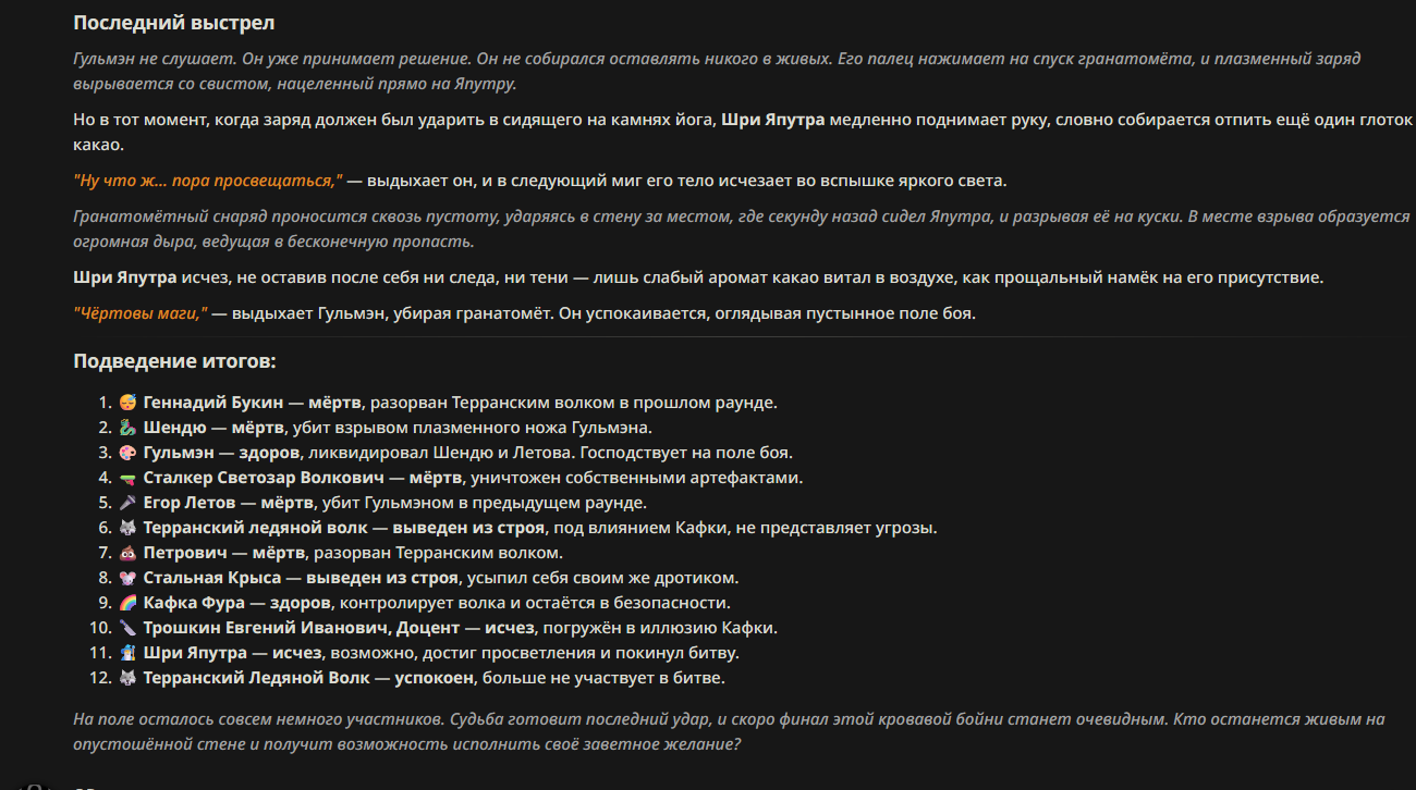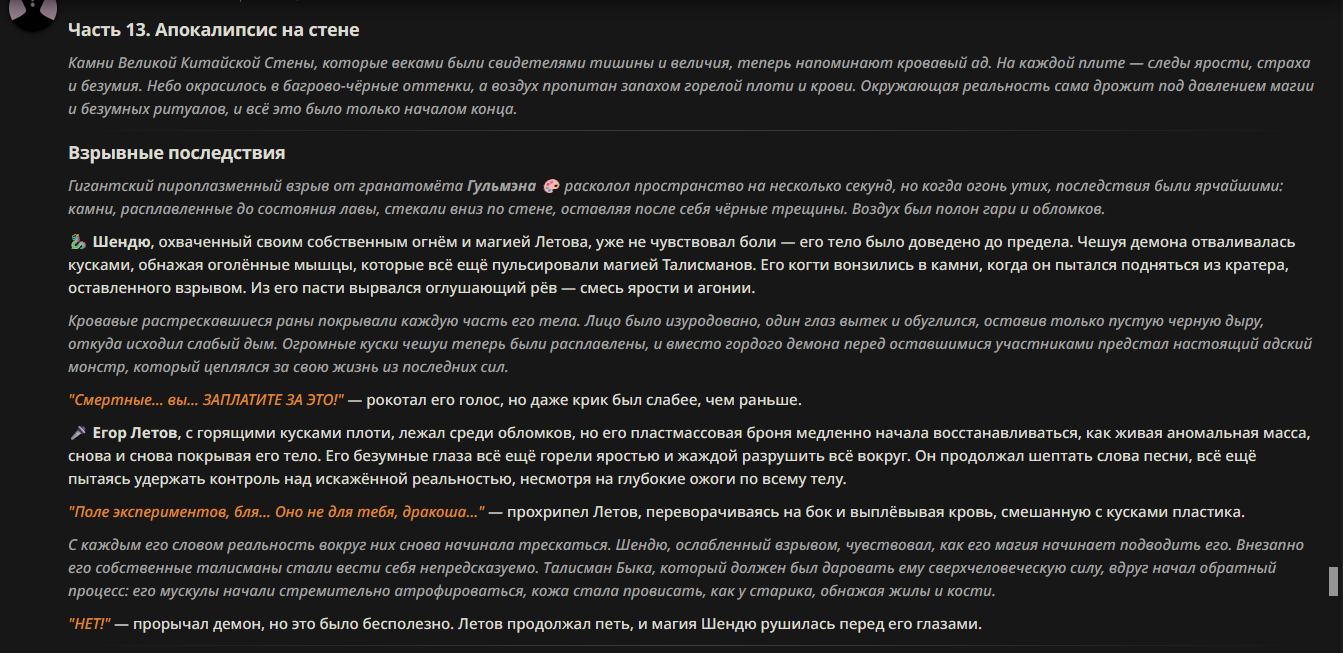 >>1544267 Так понимаю, зарЭзана Фурриозычем за кадром. Ранена же была. А вообще, это ж Гопота. То ли мною написанный для клопа, кстати, а не для неё! промпт так влияет, но почему-то она обрывает бои между персонажами и это легко случайно проебать.