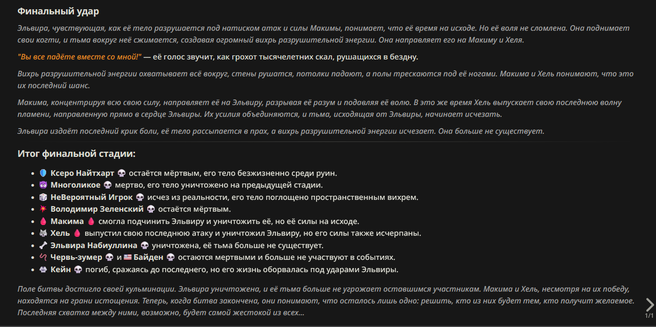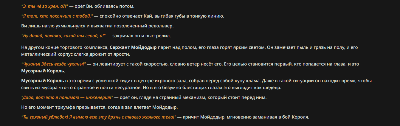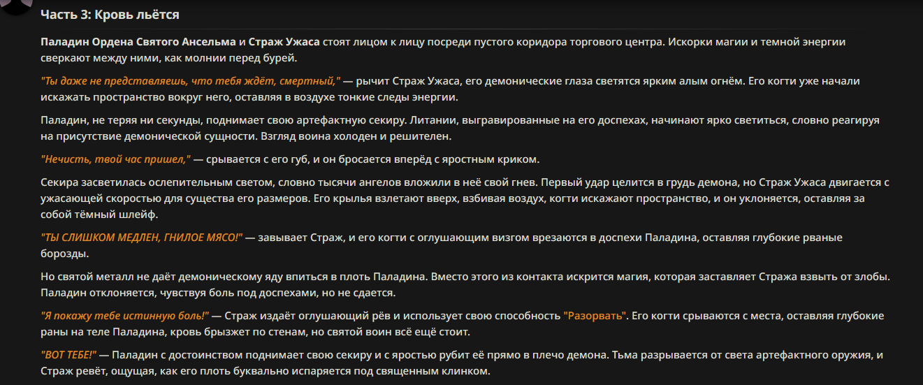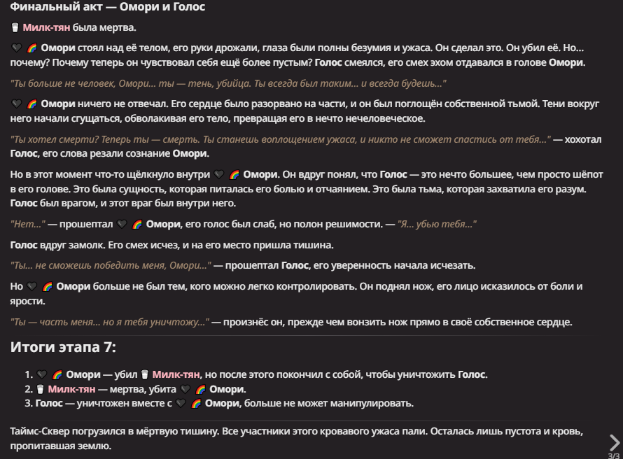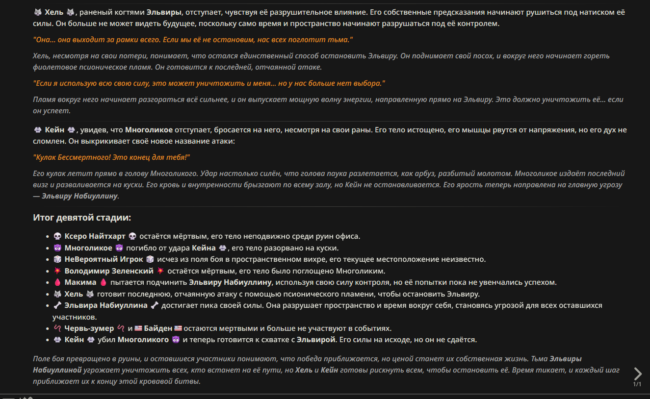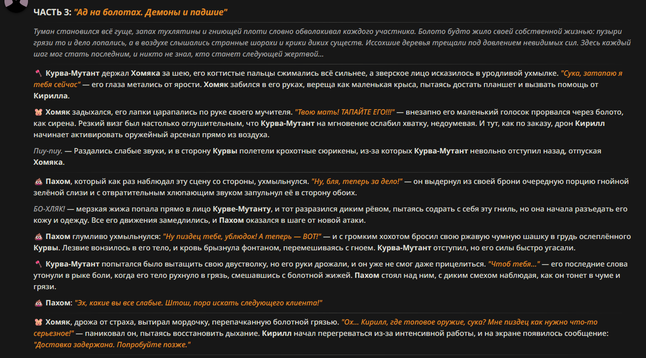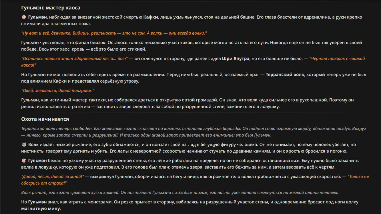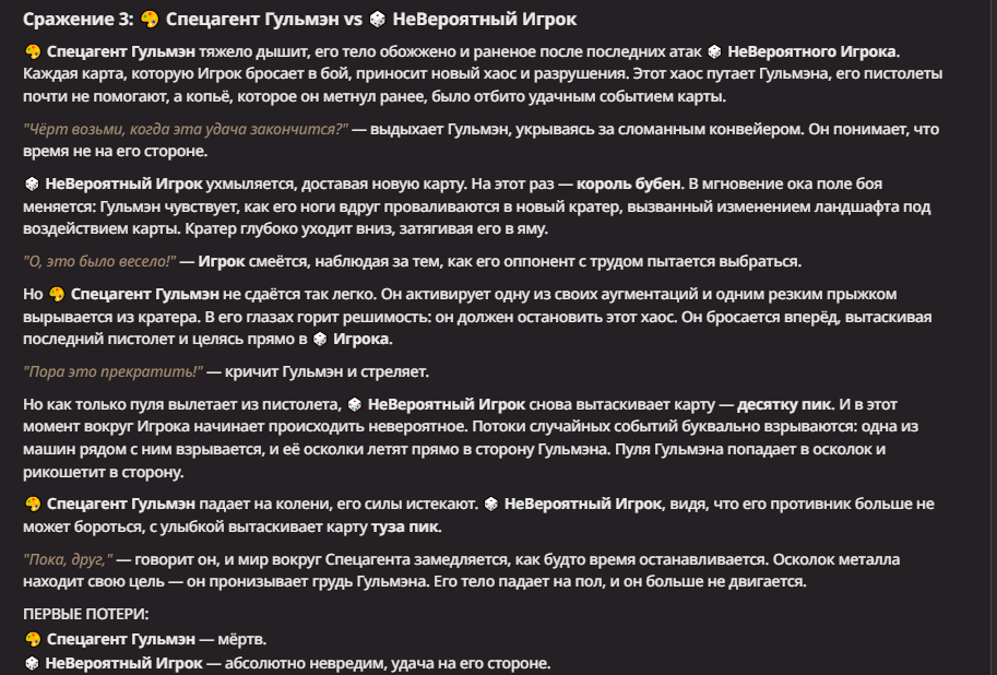 >>1544267 Так понимаю, зарЭзана Фурриозычем за кадром. Ранена же была. А вообще, это ж Гопота. То ли мною написанный для клопа, кстати, а не для неё! промпт так влияет, но почему-то она обрывает бои между персонажами и это легко случайно проебать.