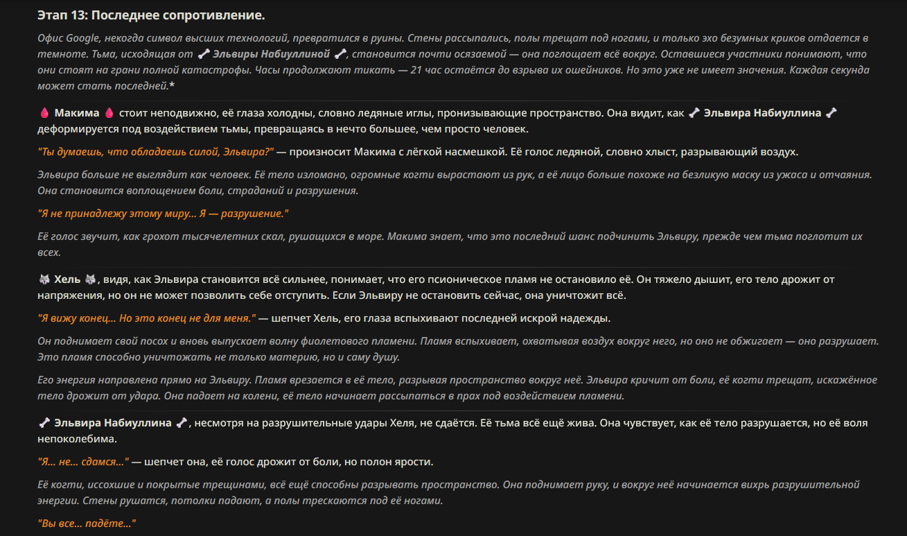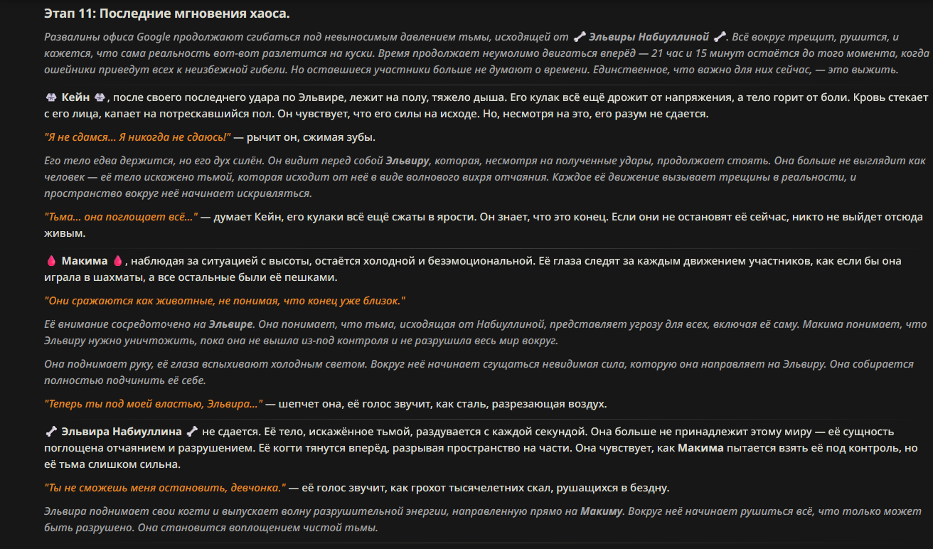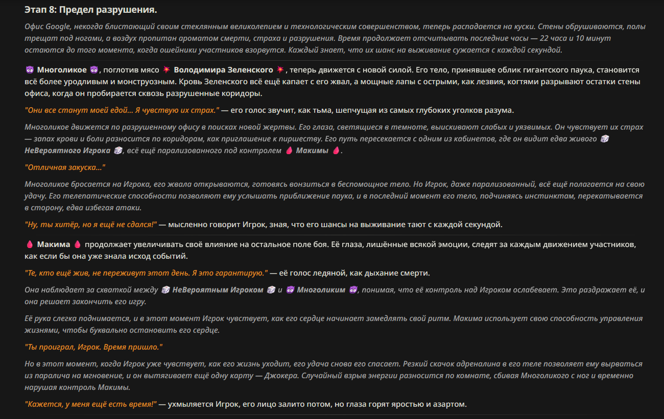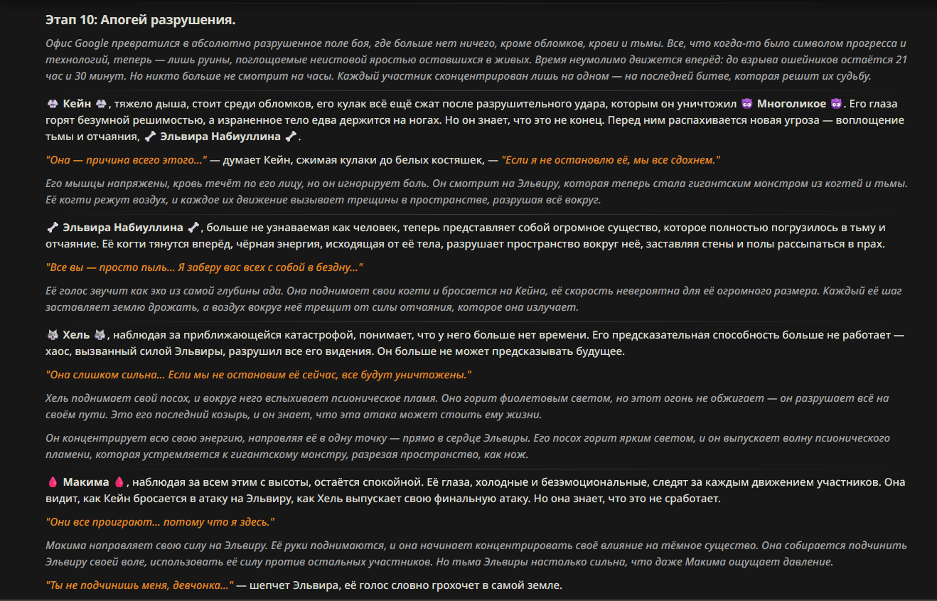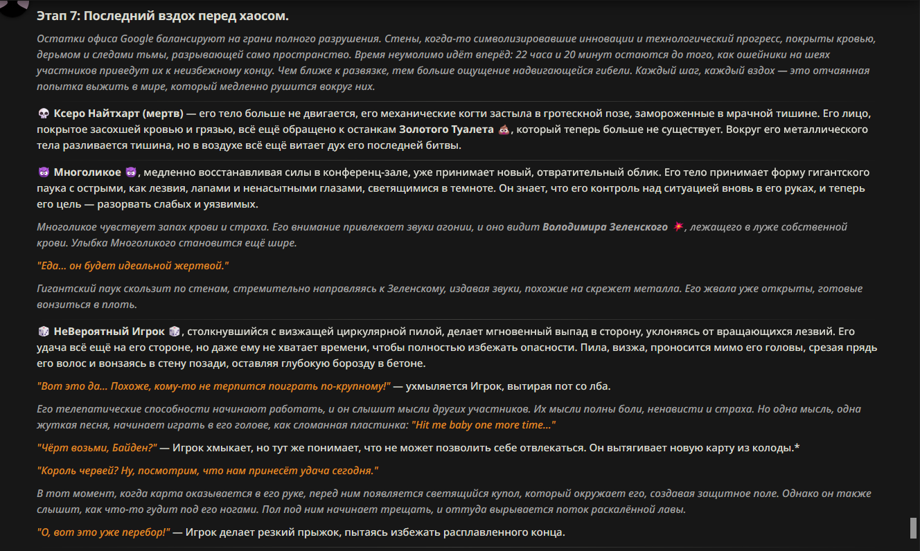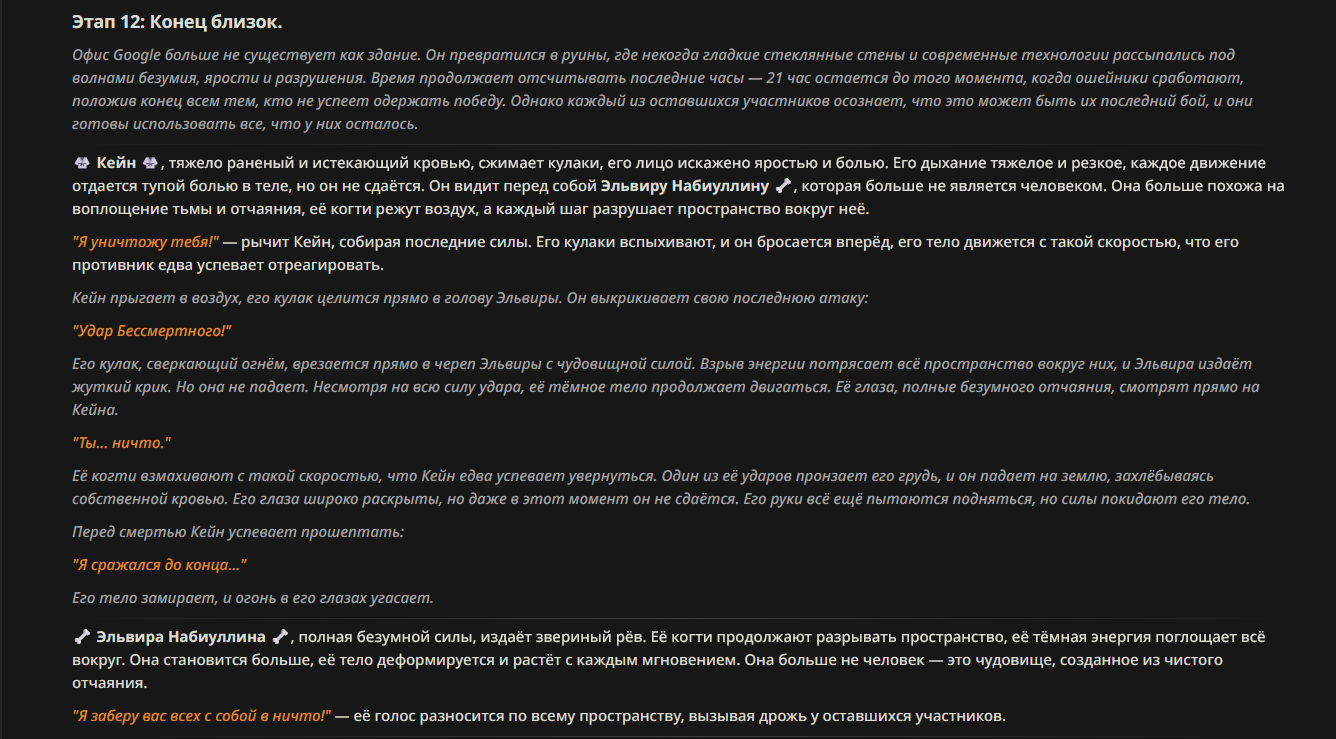 >>1544267 Так понимаю, зарЭзана Фурриозычем за кадром. Ранена же была. А вообще, это ж Гопота. То ли мною написанный для клопа, кстати, а не для неё! промпт так влияет, но почему-то она обрывает бои между персонажами и это легко случайно проебать.