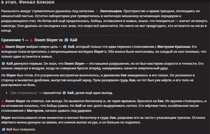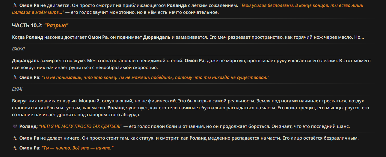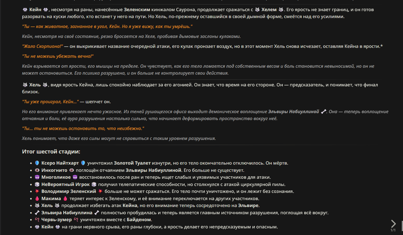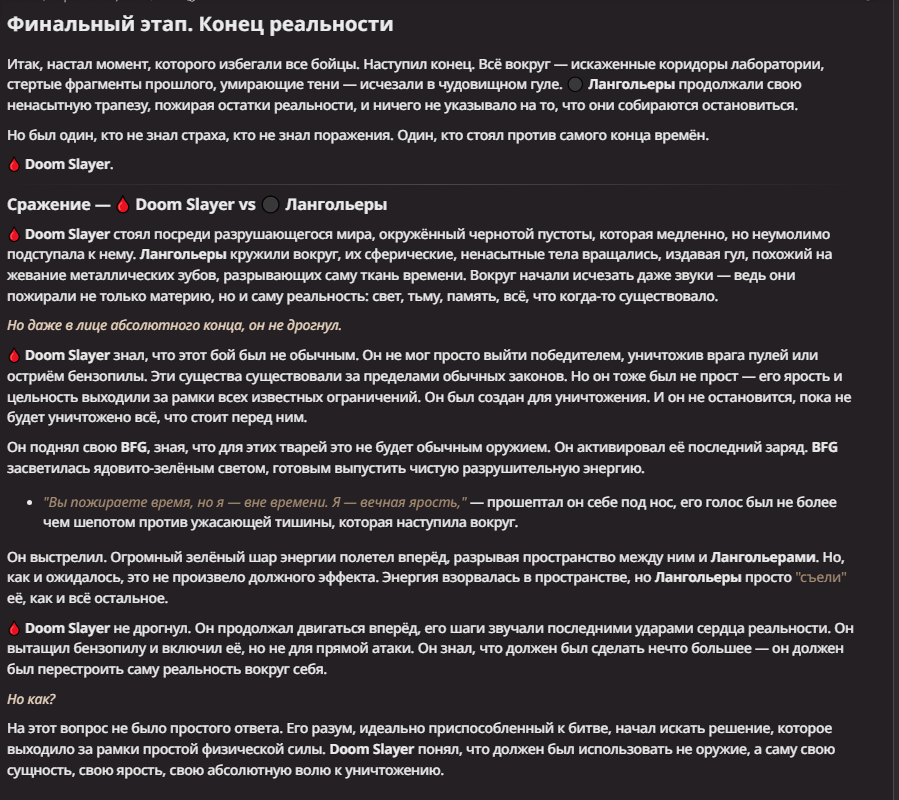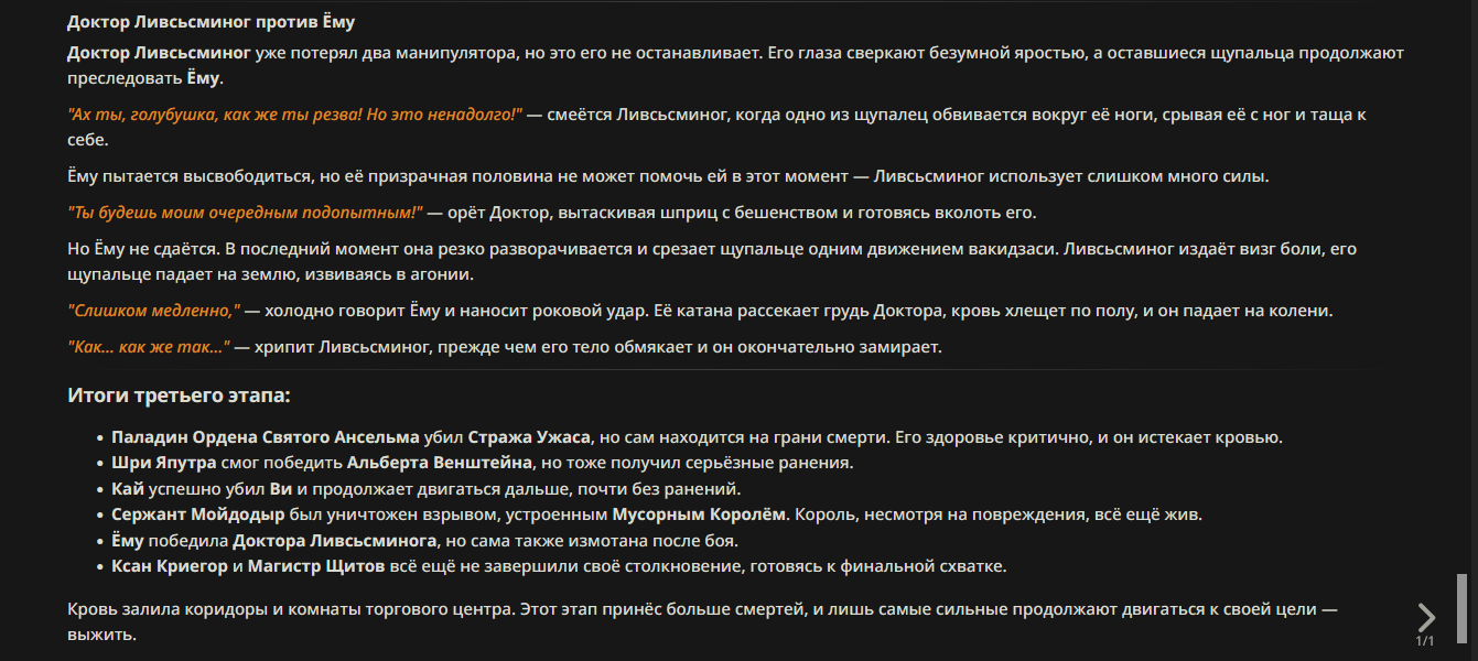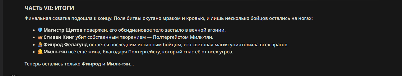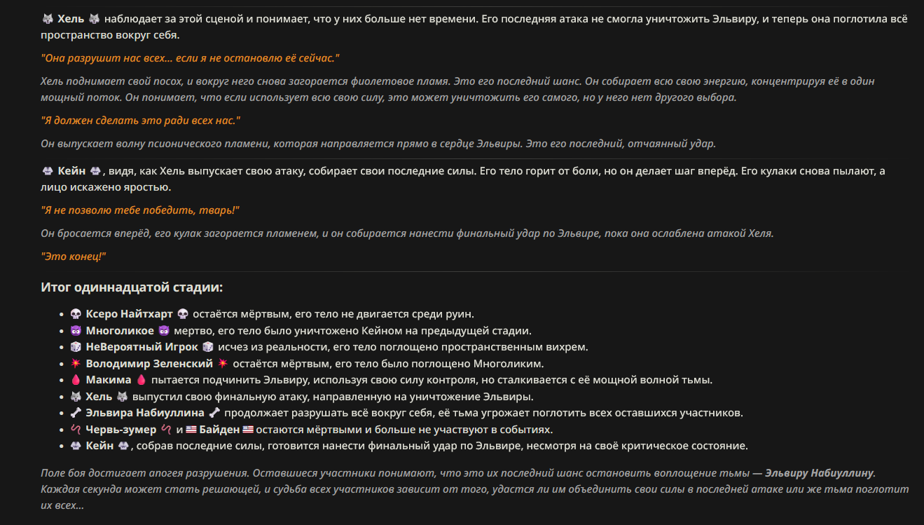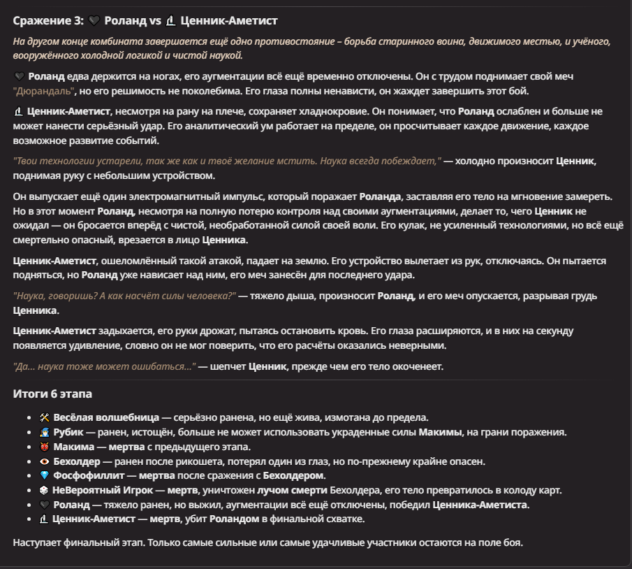 >>1544267 Так понимаю, зарЭзана Фурриозычем за кадром. Ранена же была. А вообще, это ж Гопота. То ли мною написанный для клопа, кстати, а не для неё! промпт так влияет, но почему-то она обрывает бои между персонажами и это легко случайно проебать.