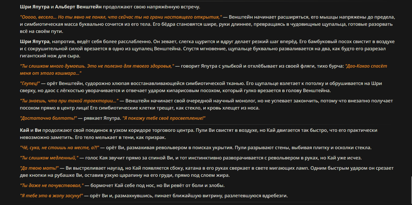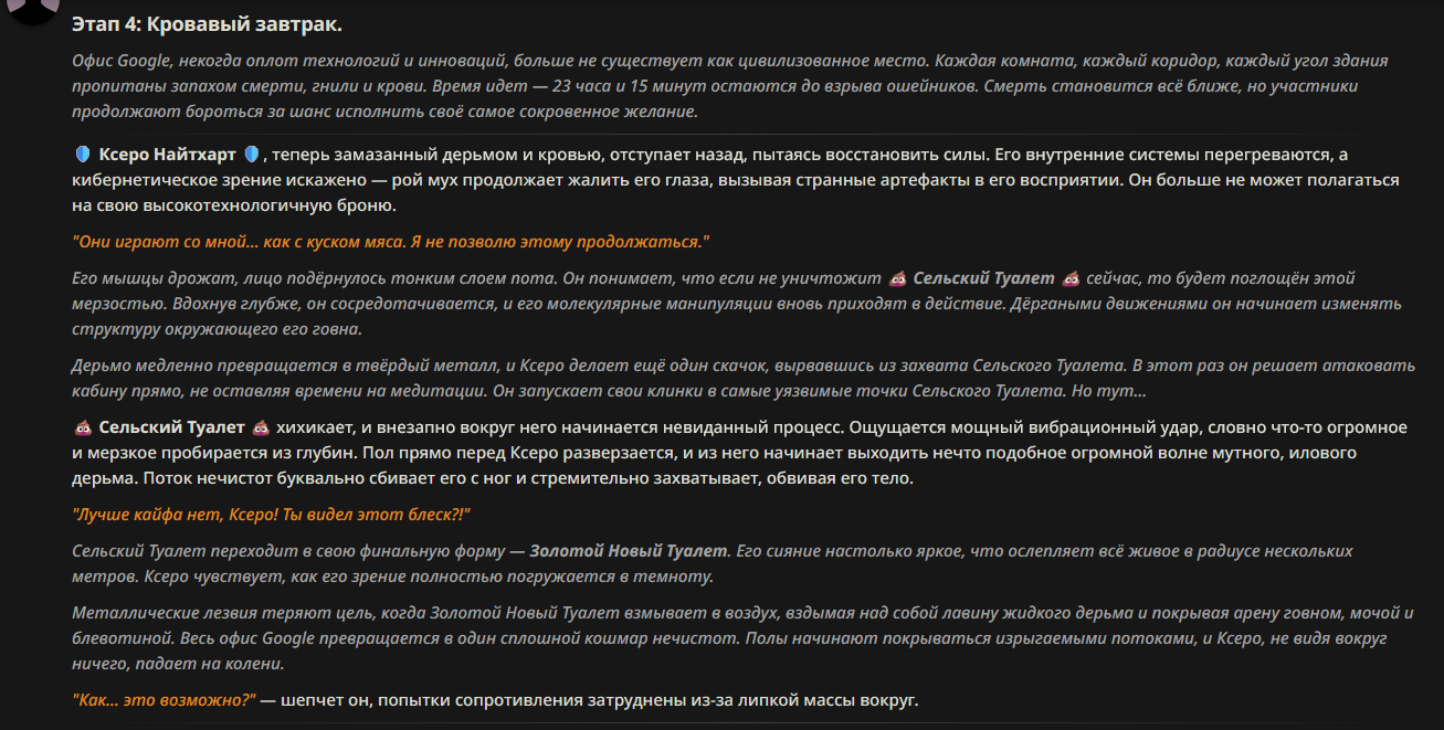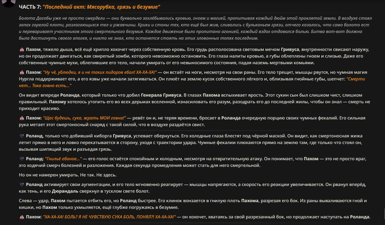 >>1544300 Полагаю, что это так. Но я почему-то не могу адекватно заставить ее устраивать пиздиловку между отдельными персами. Описывает все очень скупо и отпирается, мол не буду тебе насилие генерить.