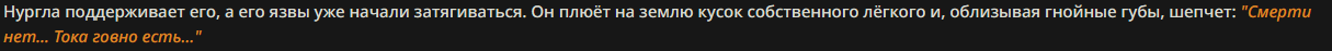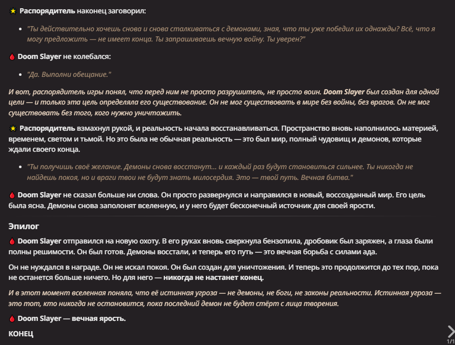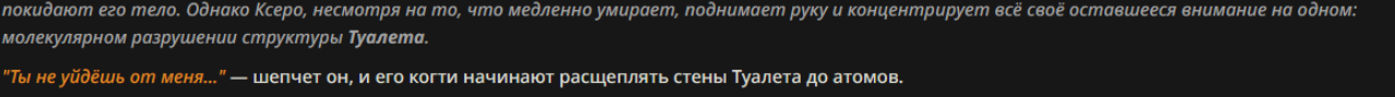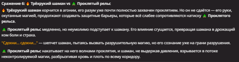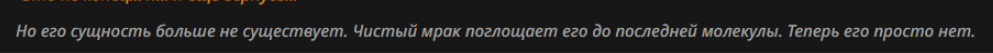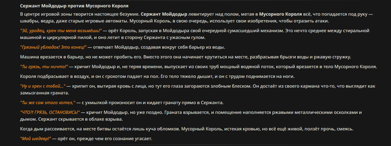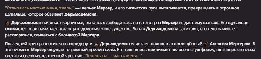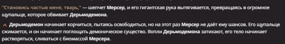 >>1542616 Страж Ужаса Огромный крылатый демон, слуга Войдишки. Искусный колдун, призыватель и боец ближнего боя. Защищен шкурой демона и демонической броней. Может летать на небольшие расстояния. Способности: "Стрела тьмы" - Страж Ужаса выпускает во врага энергетическую стрелу, наносящую урон от темной магии и замедляющую передвижение. "Порча" - Страж Ужаса проклинает врага, заставляя его постоянно получать небольшой урон от темной магии, до тех пор пока он не умрет. "Разорвать" - Страж Ужаса бьет цель когтями, оставляя рваные раны, которые наносят врагу урон от кровотечения с течением времени. "Вой ужаса" - Страж Ужаса издает крик, дезориентирующий всех врагов вокруг и заставляющий их убегать прочь. "Пир гончих" - убив врага, Страж Ужаса призывает двух адских гончих, которые атакуют врагов в ближнем бою своими клыками. "Пентаграмма теней" - Страж Ужаса рисует на земле пентаграмму радиусом 10 метров, когда любой враг наступает на нее, из пентаграммы призывается теневая копия этого врага, обладающая его способностями, которая атакует этого врага в течение 10 секунд. "Портал в Лабиринт Ужаса" - когда Страж Ужаса получает серьезные ранения он открывает портал в Лабиринт Ужаса, и убегает туда, чтобы восстановить половину своего здоровья а затем возвращается в бой. Любой враг, который зайдет следом в этот портал лишится рассудка и никогда не вернется назад. "Адское подкрепление" - каждый раз, когда в радиусе 100 метров умирает враг, на его месте призывается огненный бес, атакующий врагов в дальнем бою стрелами огня. "Демонический договор" - Страж Ужаса может заключить договоры и союзы с другими демонами. "Изгнание" - Страж Ужаса перемещает врага в параллельное измерение убирая его из боя на 10 секунд. "Оскверненный клинок душ" - один раз за игру Страж Ужаса может призвать магический меч и мгновенно добить тяжело раненного врага, забрав его душу себе на службу. Эта душа применяет одну способность этого врага к другому случайному врагу, а затем исчезает.