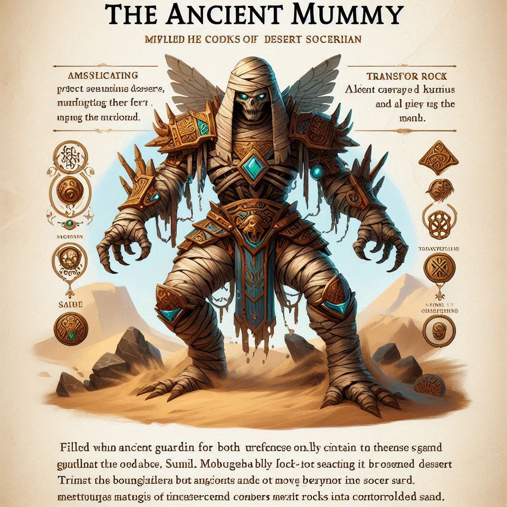 >>1542718 Древняя мумия - весьма массивный живой мертвец с цепкими лапами и мощным накачанным телом, по сути своей является проклятой пустынной нежитью в виде могучего колдуна старых времён. Чрезвычайно опытен в массовых сражениях так как в древности прошёл через множество разрушительных войн. Озлобленная на саму жизнь мумия моментально нападает как только увидит любое живое существо. В своём арсенале имеет мощную как магическую так и физическую силу.