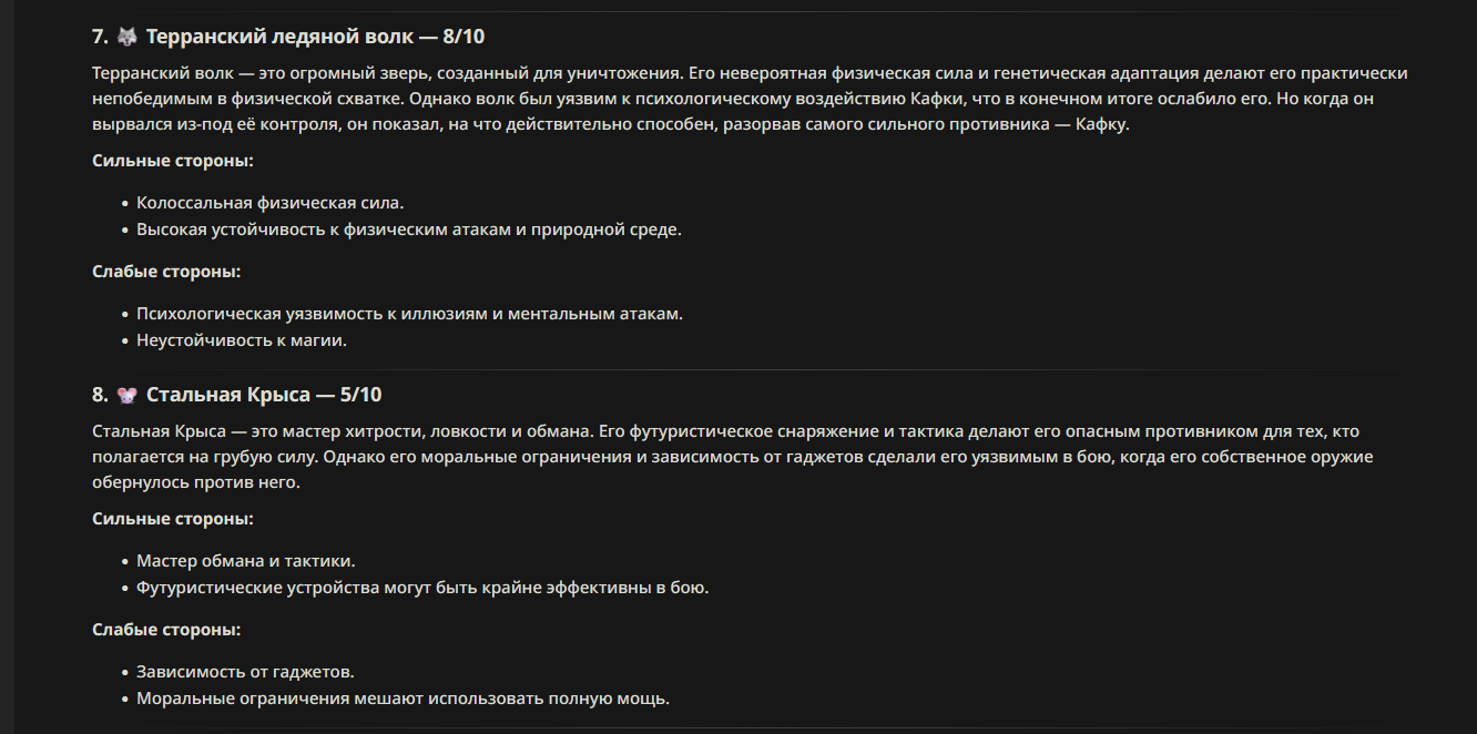 В первом выяснилось что нейронка, вообще не знает Кафку Во втором тупо закинул описание с шикимори и нейронка как-то неправильно его поняла, сделав из Кафки маньячку. И вообще было полное непопадание в персонажа