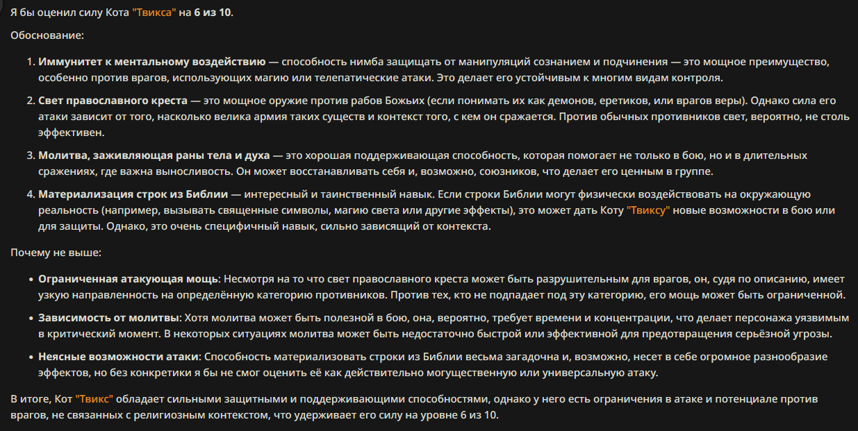 >>1544173 Кот "Твикс": Парит на ангельских крыльях. Нимб защищает от воздействия на разум. Свет православного креста испепеляет грешных. Молитва исцеляет раны тела и духа. Материализует строки из Библии.
