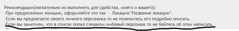 Рекомендации(желательно их выполнять для удобства, моего и вашего): -При предложении локации, оформляйте это так -- Локация:"Название локации". -Если вы предлагаете своего личного персонажа то не поленитесь его подробно описать. -Если вы заметили, что в список попал слишком имбовый персонаж то не бойтесь об этом написать. -От себя закидывайте 1-2 персонажа, дайте шанс другим анонам проявить себя. -Не будьте слишком назойливы и эгоцентричны. Уважайте других игроков и ведущих.
