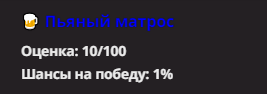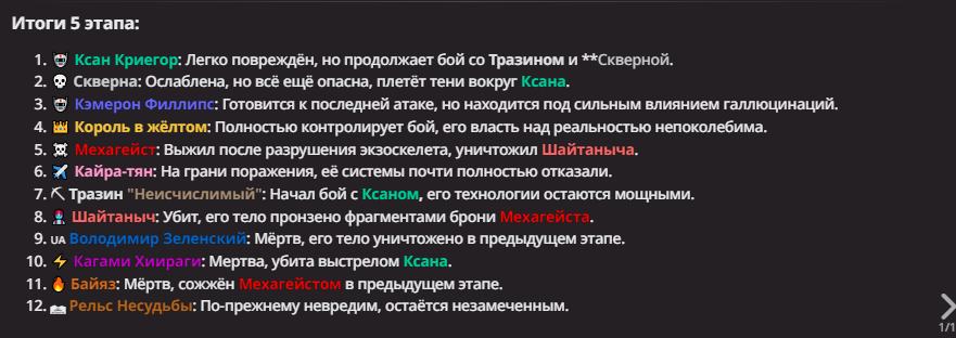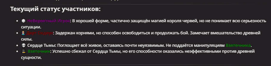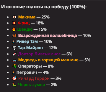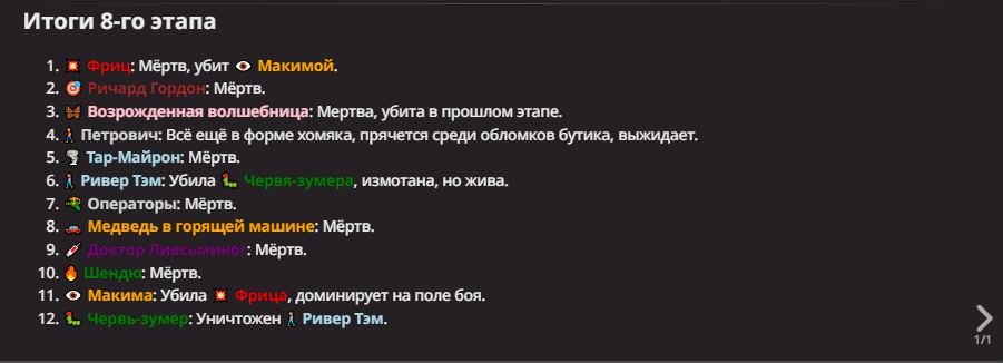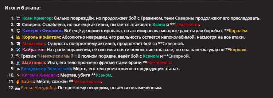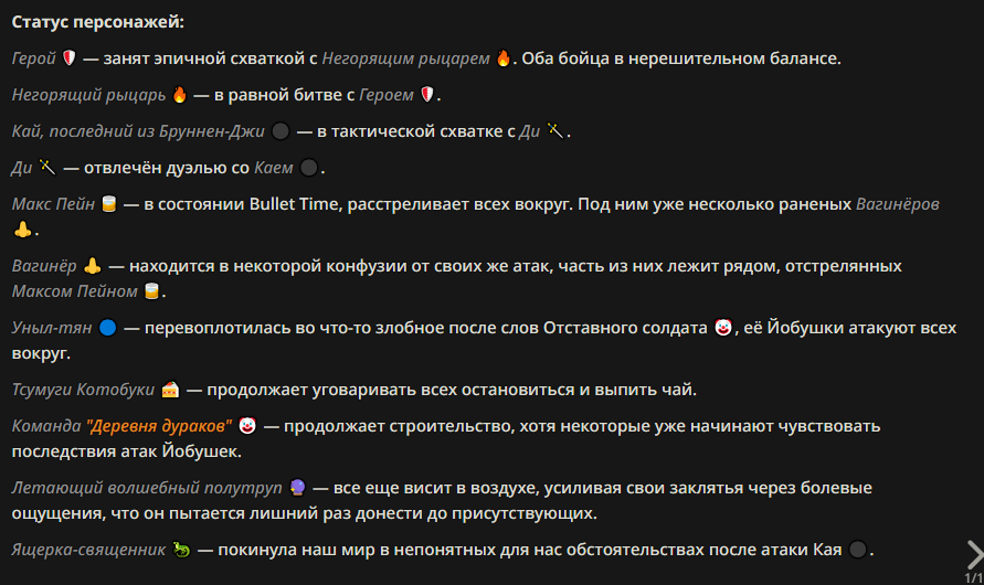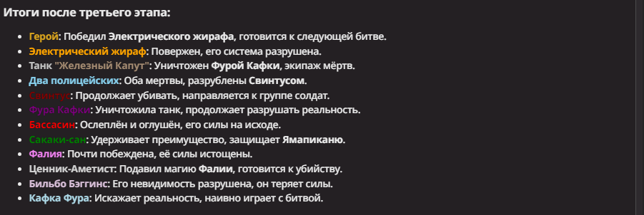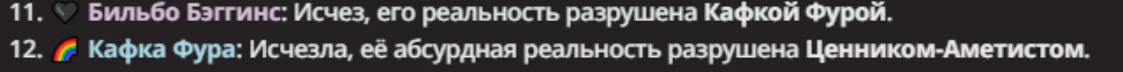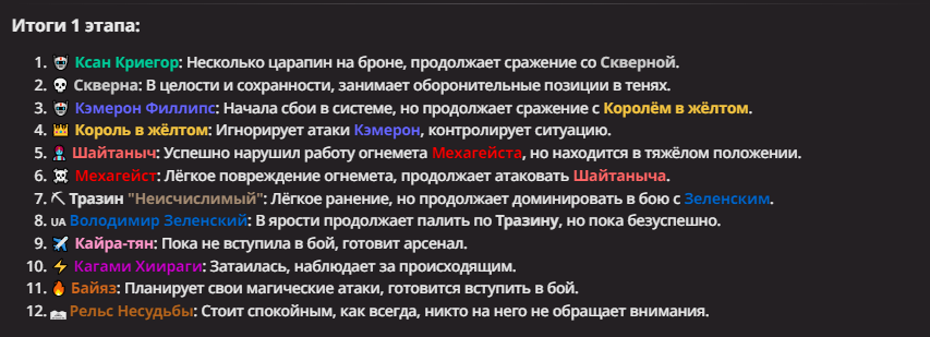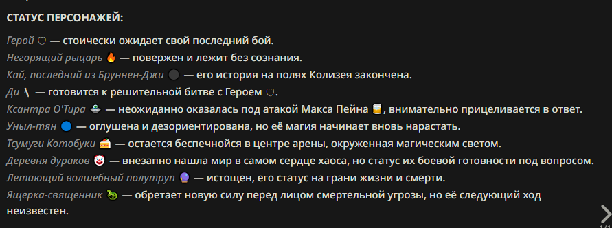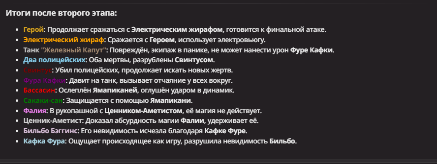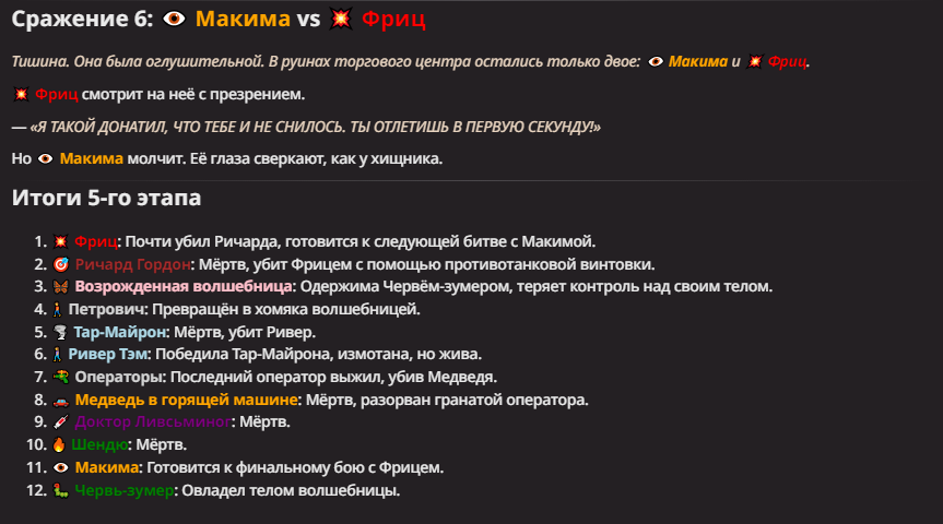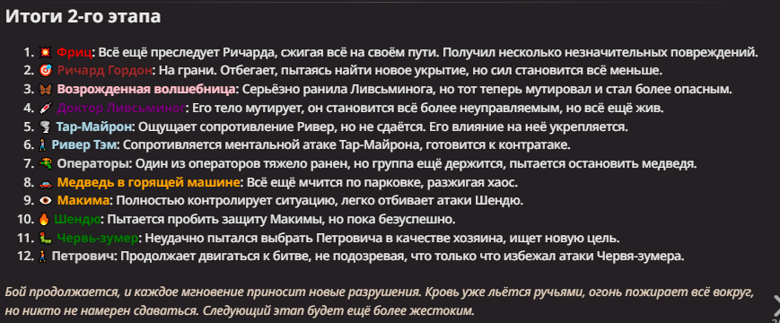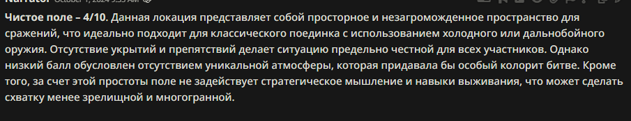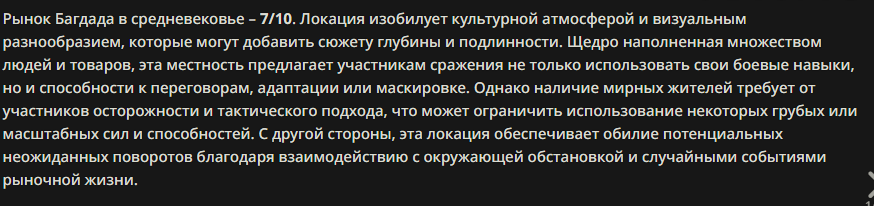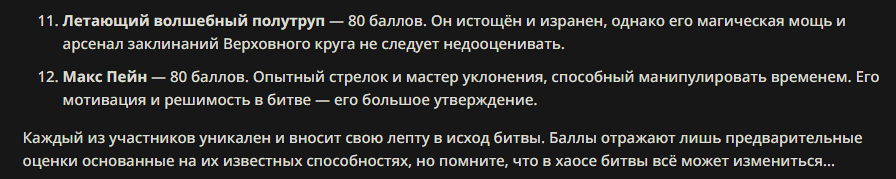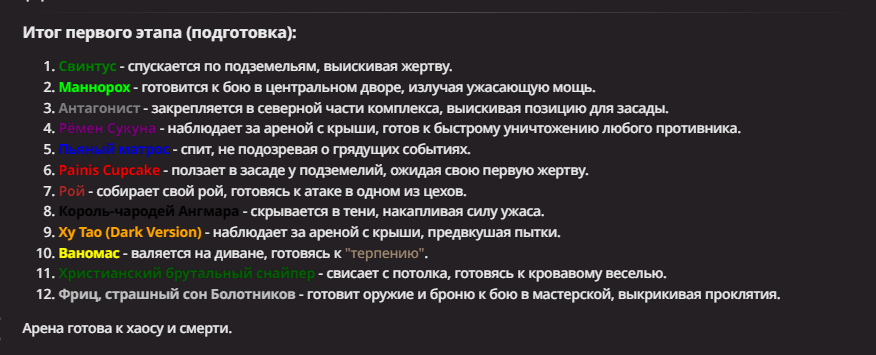 Правила(могут меняться в зависимости от ОПа): 1. Максимум в бою могут участвовать 12 персонажей. После этого набор закрывается и начинается битва. 2.Нельзя предлагать персонажей на около божественном уровне силы. 3.Персонажи с напарниками НЕ запрещены В РАЗУМНЫХ ПРЕДЕЛАХ, с соблюдением баланса сил. Никаких легионов космодесанта. Upd. Уточняйте у текущего ОПа. 4.После участия в бою персонаж уходит на перерыв в 3 боя(сделано для защиты от спамеров одного персонажа). 5.Нельзя предлагать персонажей которые могут призывать других существ без каких-либо условий. Пример: Маг который призывает демонов по щелчку пальцев == не допускается. Маг которому нужны трупы или какой-то длительный ритуал с условиями для призыва демона == допускается. 6.После использования локации она выбивается из случайного списка на 9 боёв.(Почему так много? Ради разнообразия.) Более подробное описание боя вы можете прочитать на втором пике. Upd. Формат может меняться в зависимости от ОПа 7.Набор персонажей полностью закрывается после начала боя и открывается только когда он закончится. 8. Ведущий оставляет за собой право не принять вашего персонажа. Будьте корректны - в случае, если такое произошло, вежливо спросите причину и/или дождитесь другого ведущего.