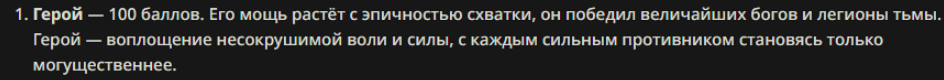 Герой Могущественная сущность из далекого мира, выглядящая, как рыцарь в сияющих латах. Герой не просто любит эпичные битвы, а в прямом смысле живет ими. Его мощь напрямую определяется эпичностью схватки: чем сильнее враги, тем сильнее он сам. Когда-то он кинул вызов всем богам сразу и победил, после чего в одиночку отправился на бой с легионами тьмы и снова одержал верх. Не существует достаточно сильного противника, чтобы одолеть Героя: против любой невероятной силы он получит невероятную силу в двойном объеме, а самая коварная магия разобьется о его несгибаемую волю. Сразить Героя можно только слабостью. Любой, кто тщедушен, труслив, предсказуем и жалок, битва с кем не сулит славы и зрелищ, является для него смертельной угрозой. Без эпичных сражений Герой зачахнет и умрет.