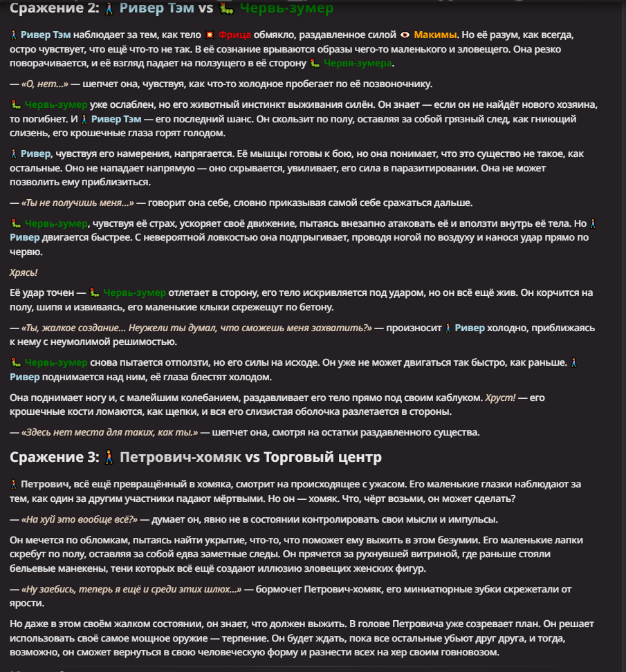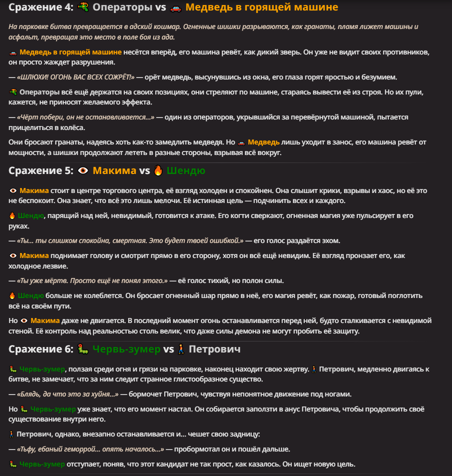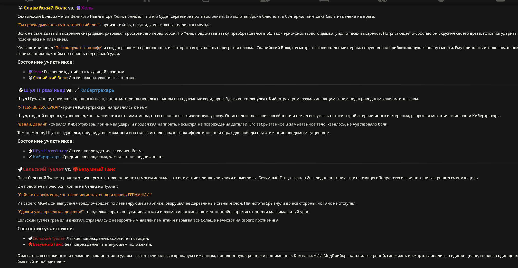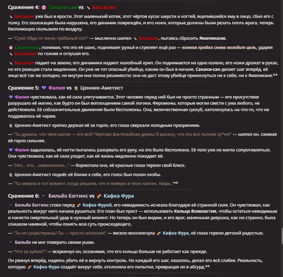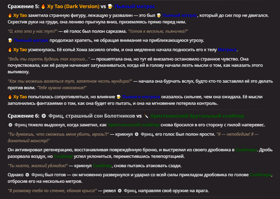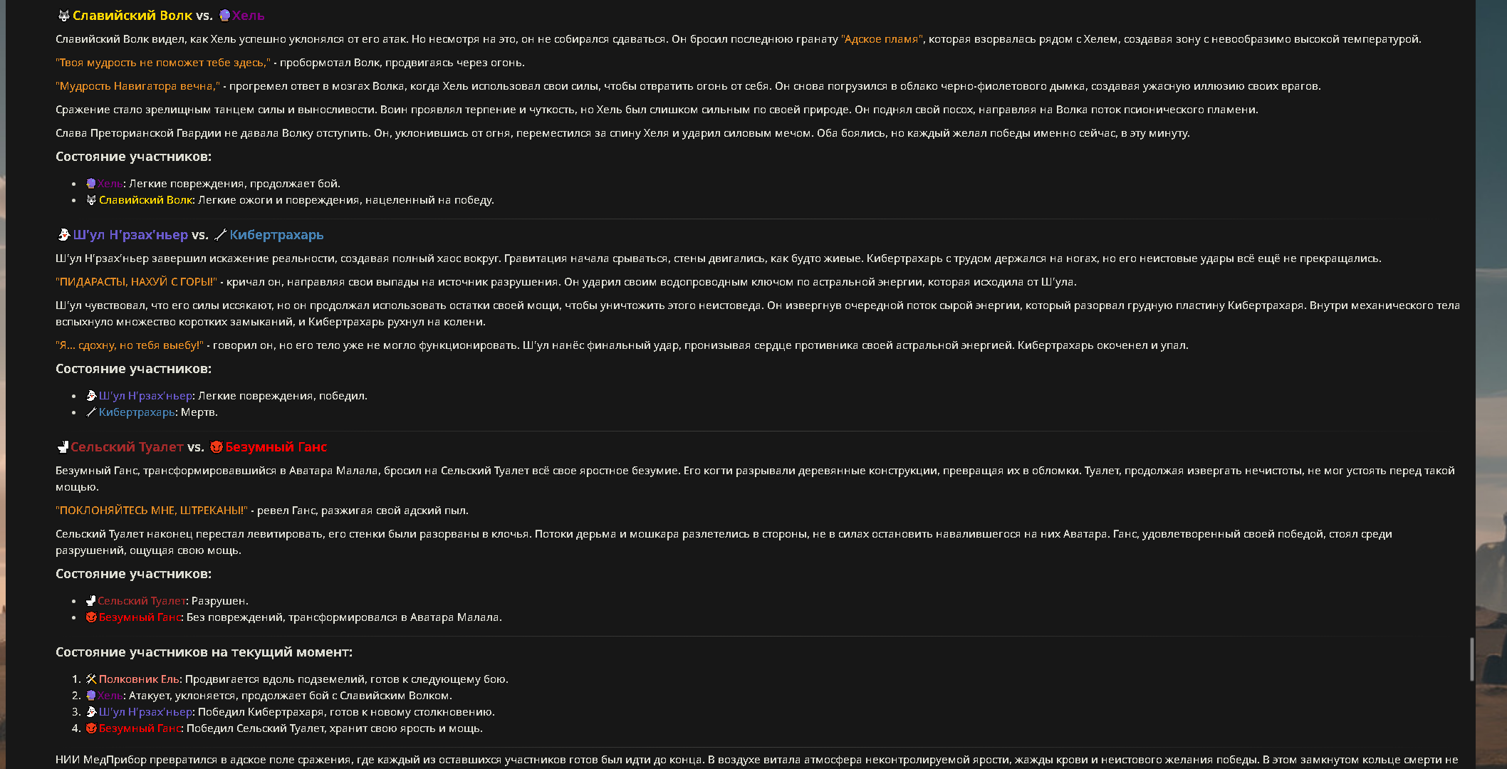 >>1544446 Еще с самой генерацией что-то пошло по пизде. Навалила всех в кучу вместо стандартных портянок-отчетов "Персонаж 1 vs Персонаж 2", дрочащихся по 10 раундов. Сделаю описание более явным (придется пожертвовать литературностью) и закину, когда починишь генератор.