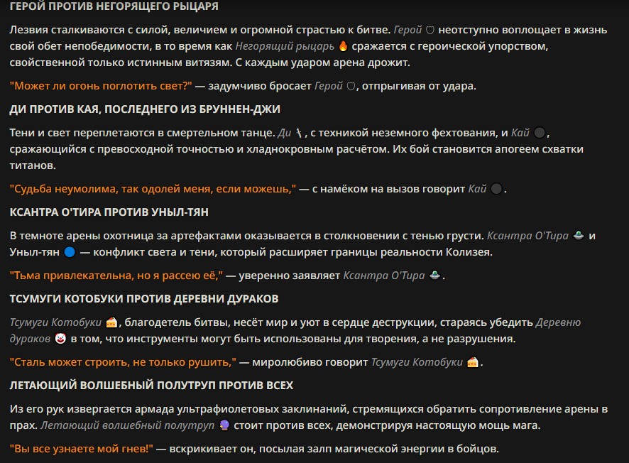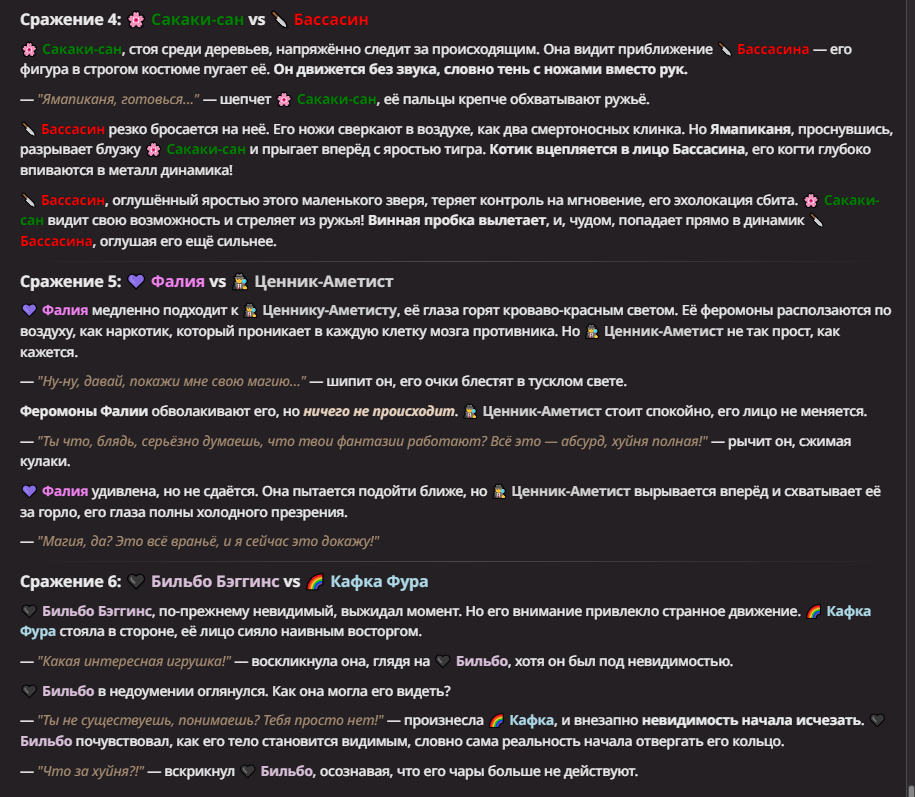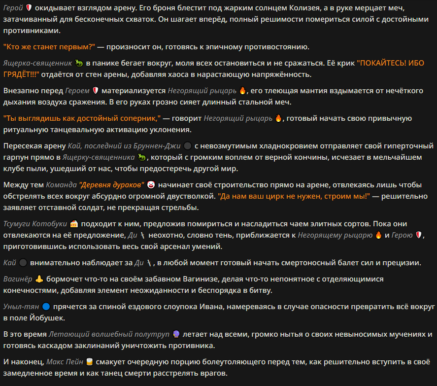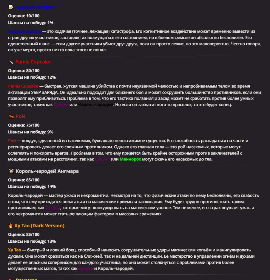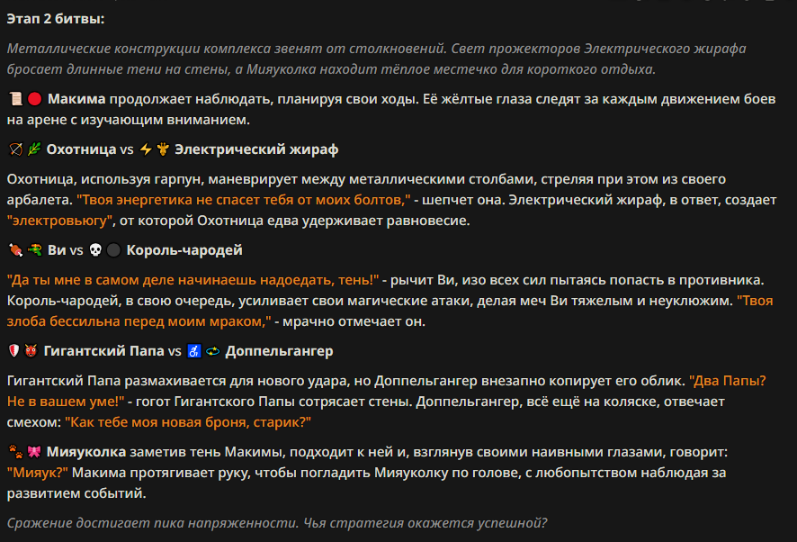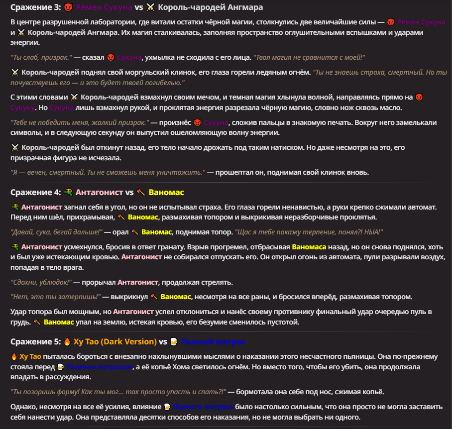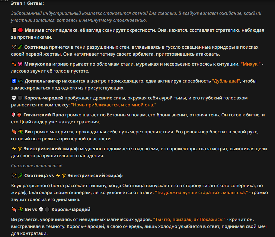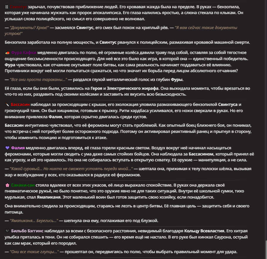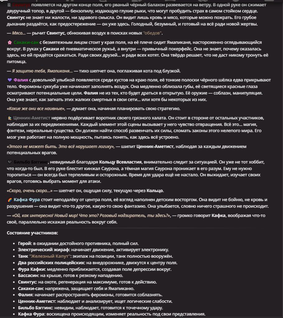 >>1544446 Еще с самой генерацией что-то пошло по пизде. Навалила всех в кучу вместо стандартных портянок-отчетов "Персонаж 1 vs Персонаж 2", дрочащихся по 10 раундов. Сделаю описание более явным (придется пожертвовать литературностью) и закину, когда починишь генератор.