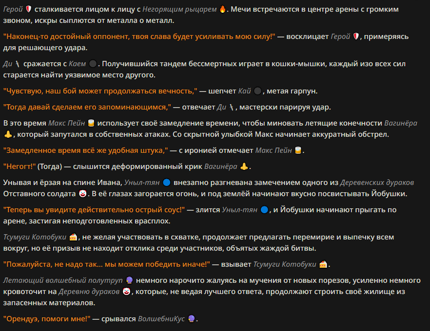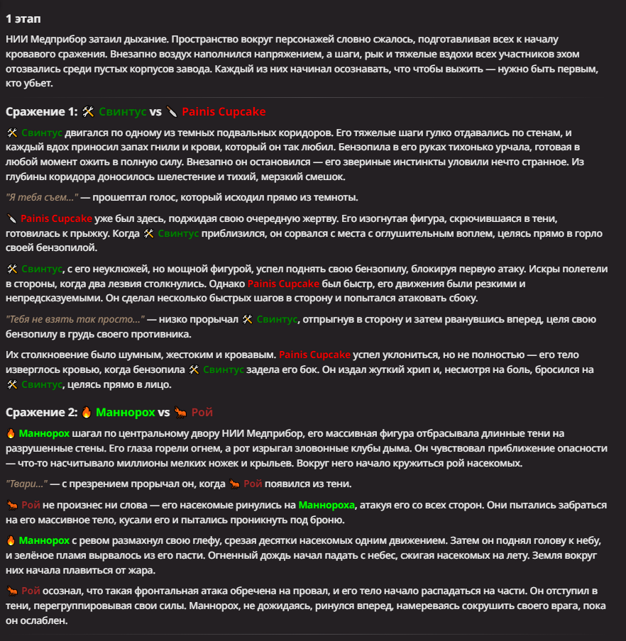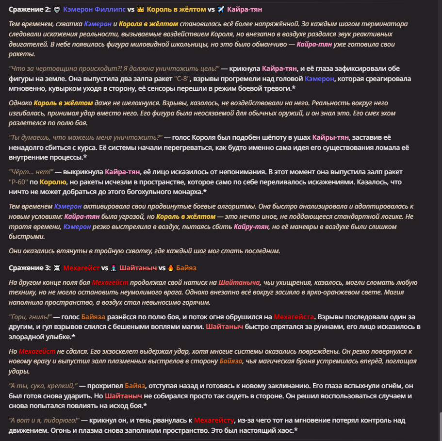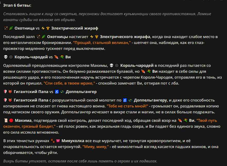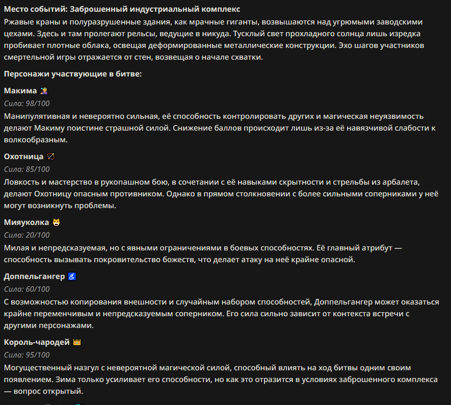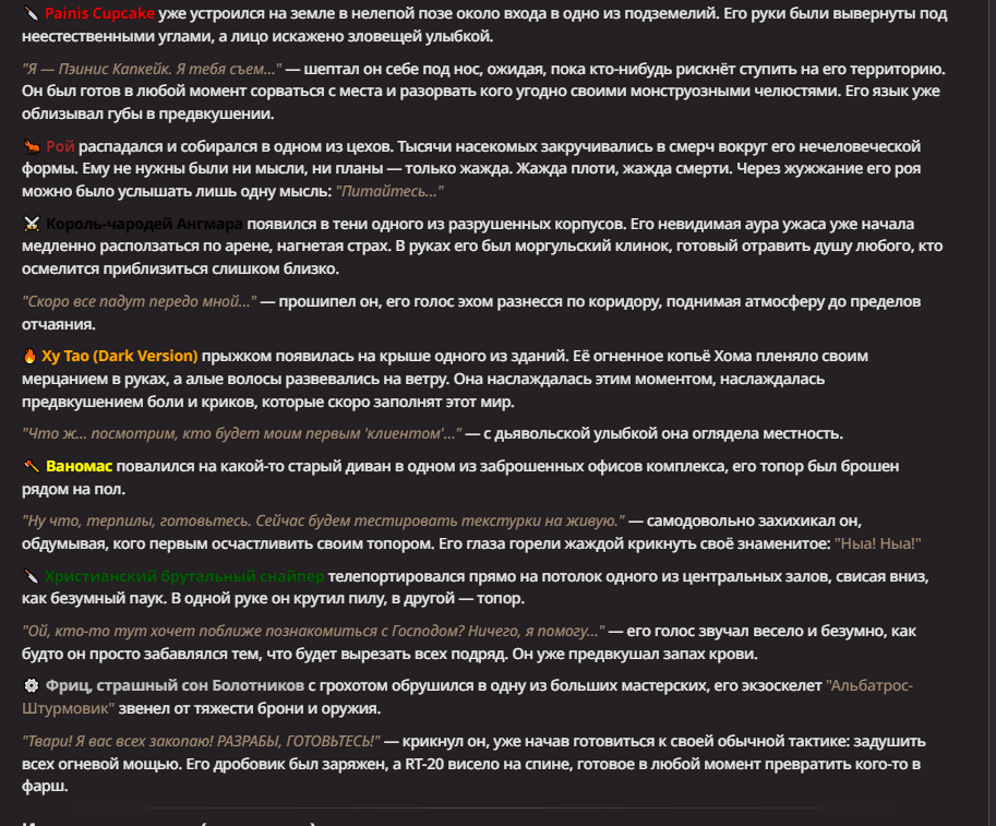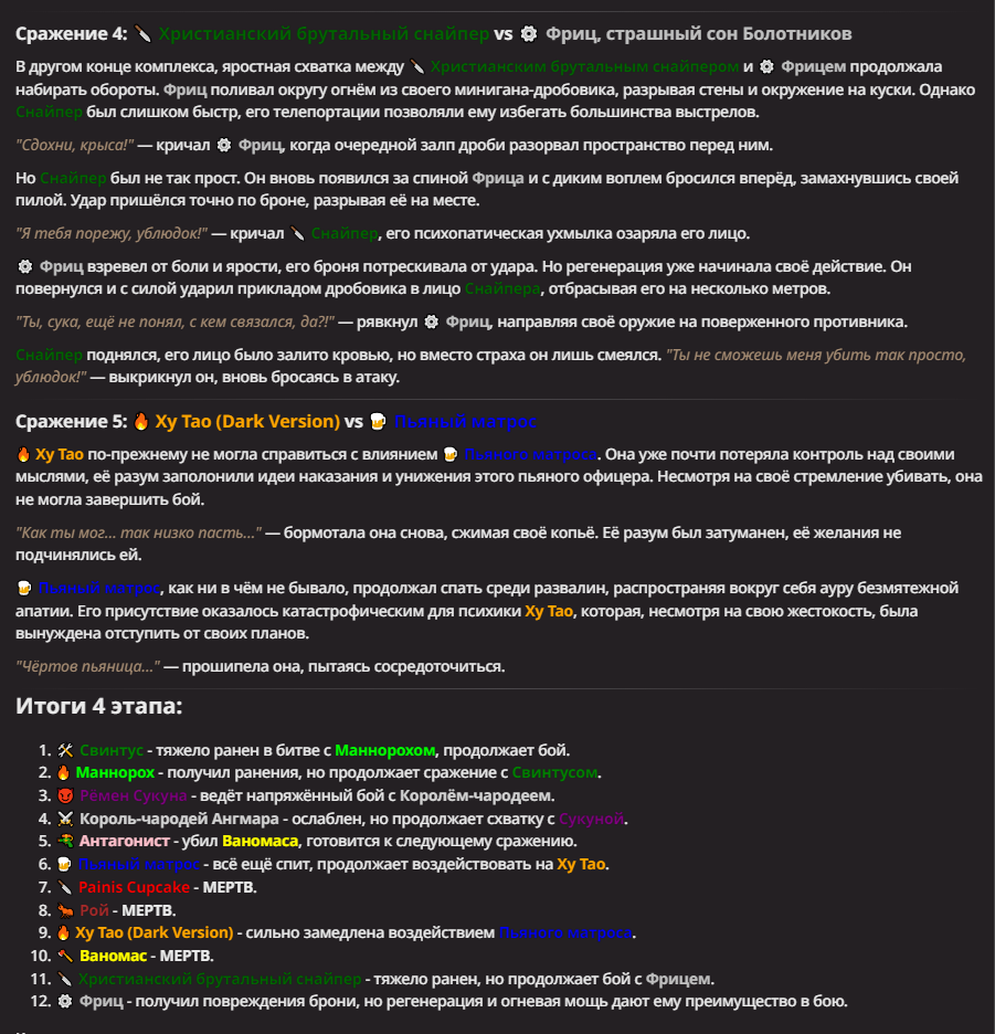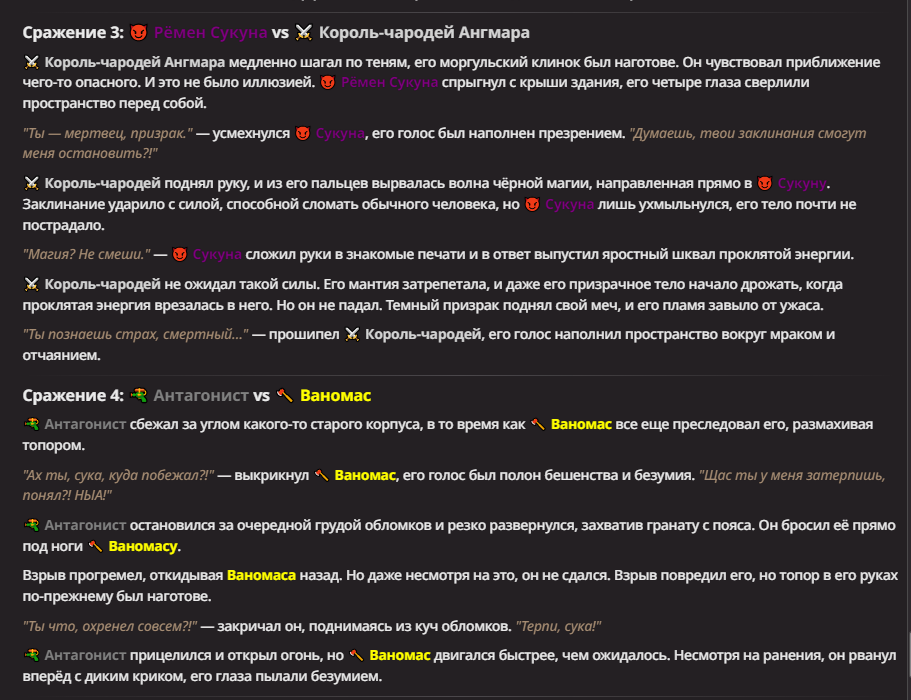 >>1544446 Еще с самой генерацией что-то пошло по пизде. Навалила всех в кучу вместо стандартных портянок-отчетов "Персонаж 1 vs Персонаж 2", дрочащихся по 10 раундов. Сделаю описание более явным (придется пожертвовать литературностью) и закину, когда починишь генератор.