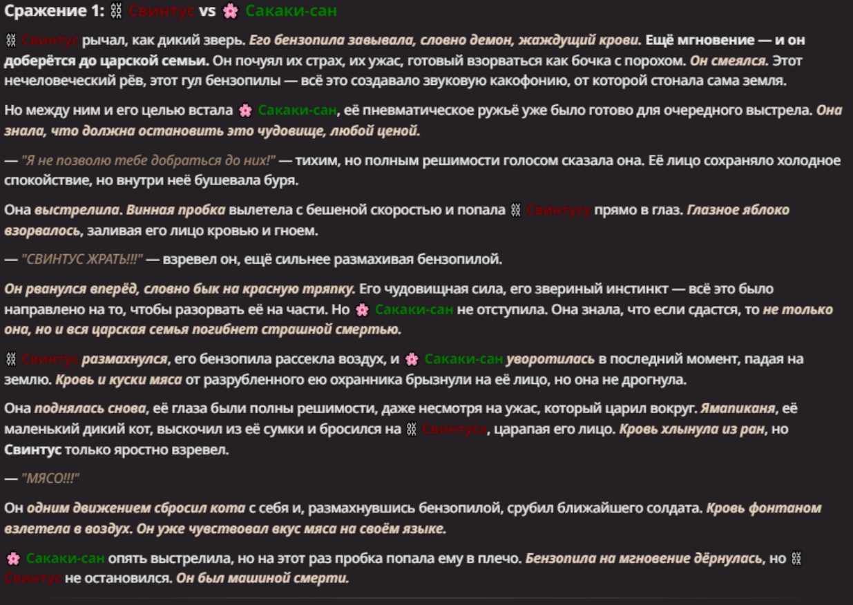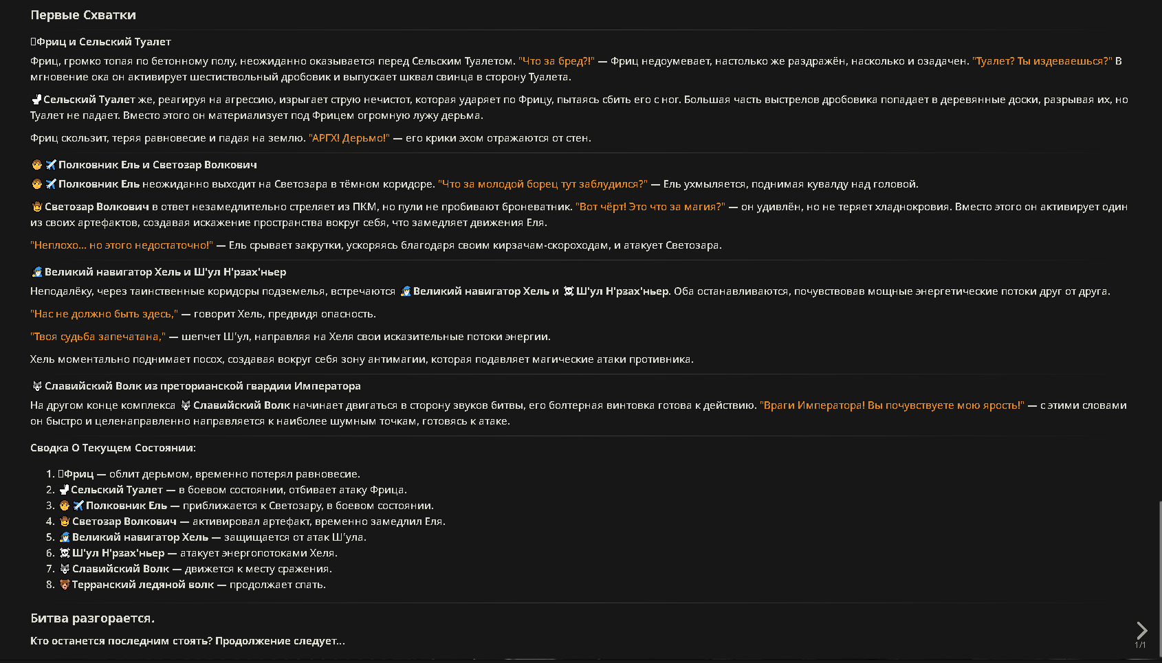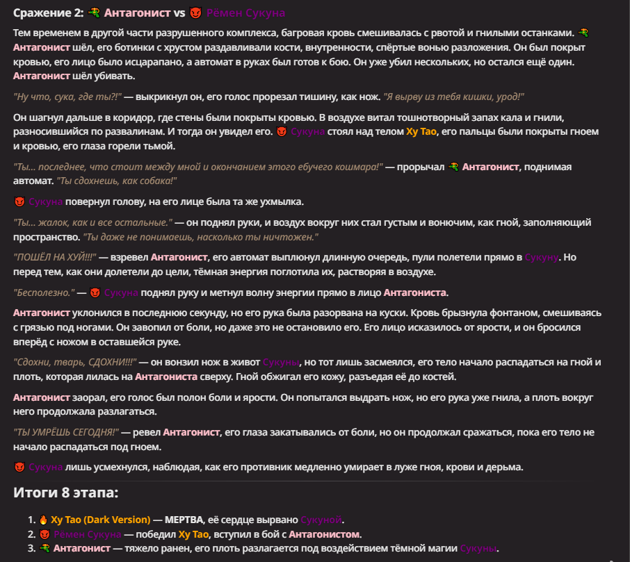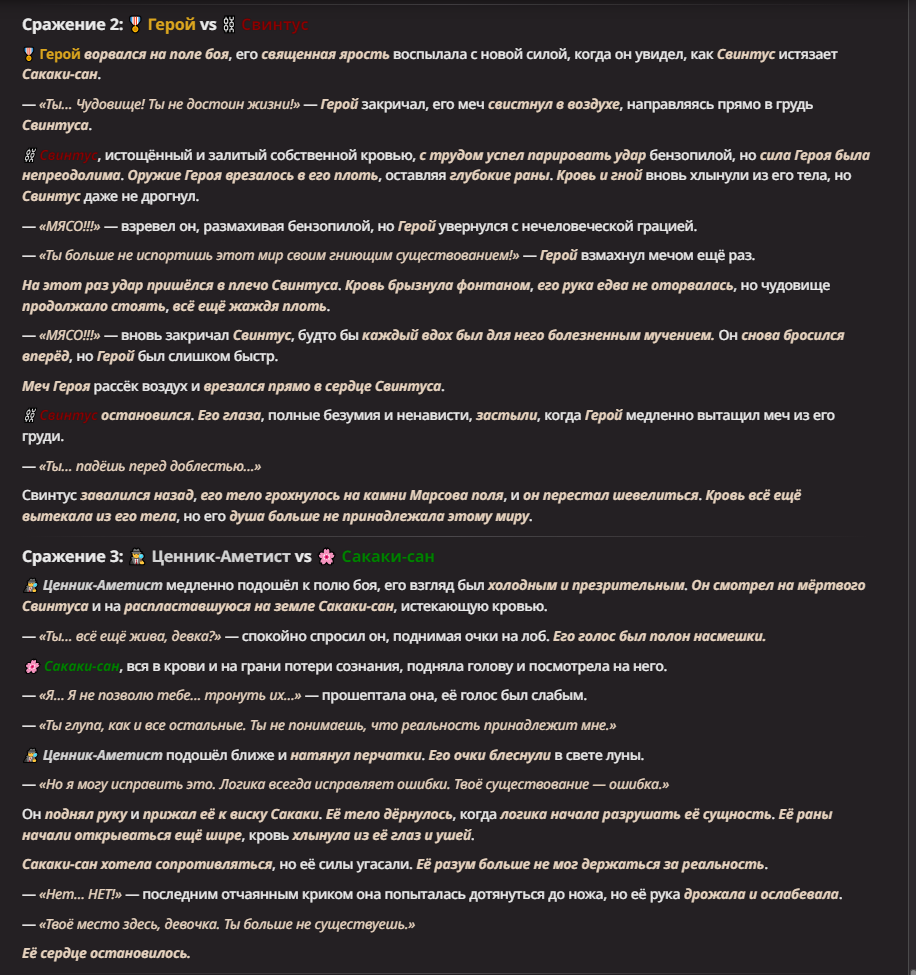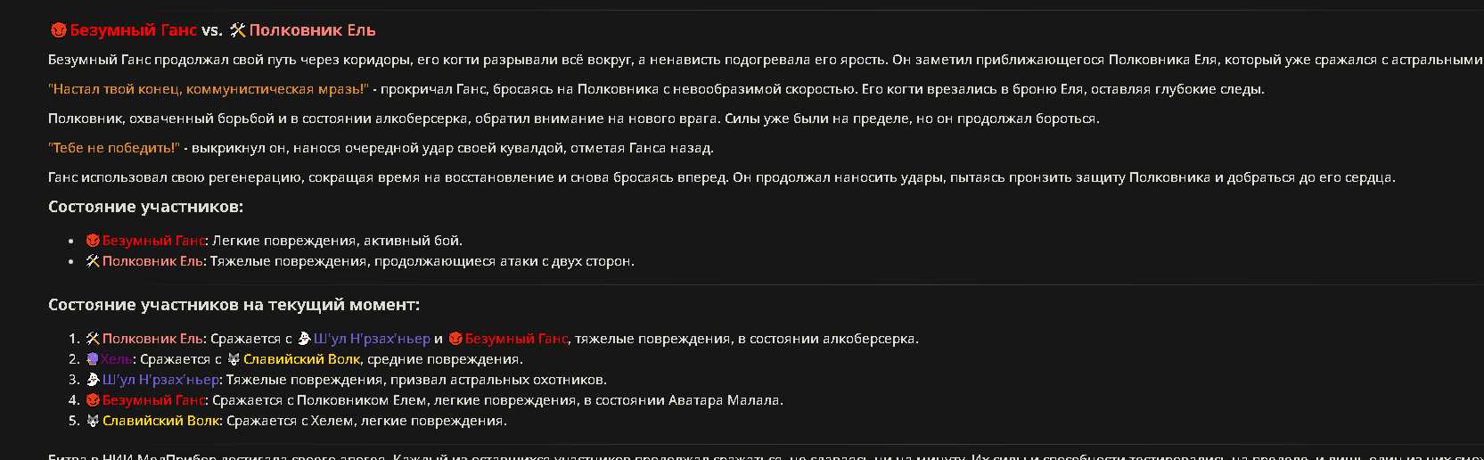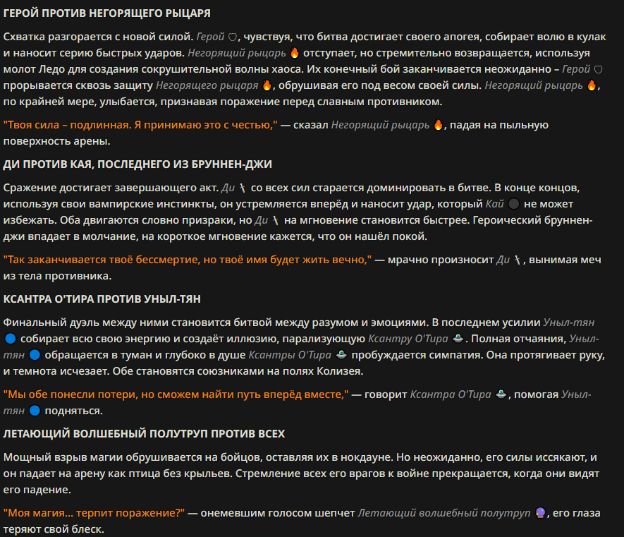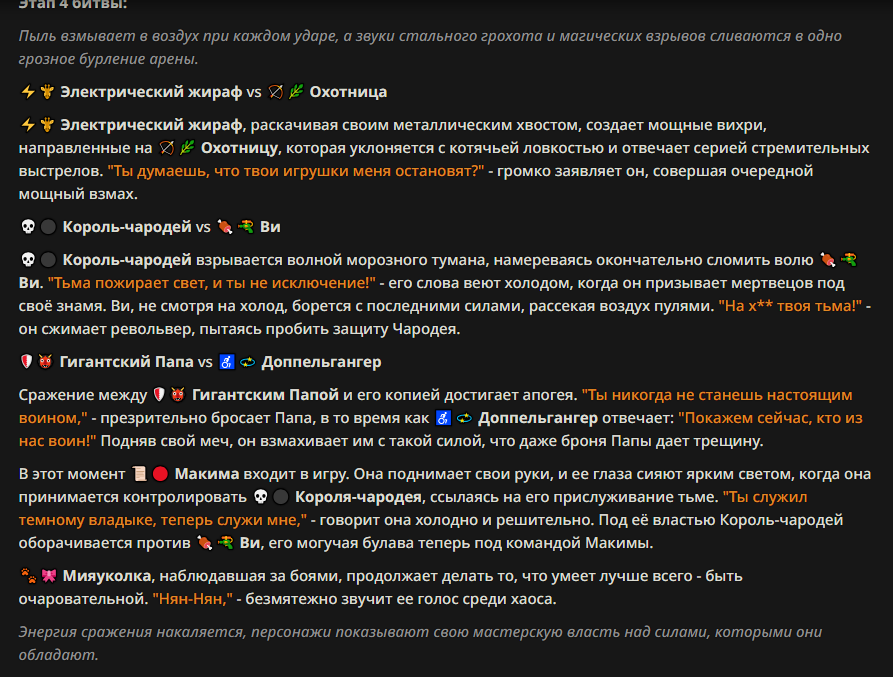 >>1544446 Еще с самой генерацией что-то пошло по пизде. Навалила всех в кучу вместо стандартных портянок-отчетов "Персонаж 1 vs Персонаж 2", дрочащихся по 10 раундов. Сделаю описание более явным (придется пожертвовать литературностью) и закину, когда починишь генератор.